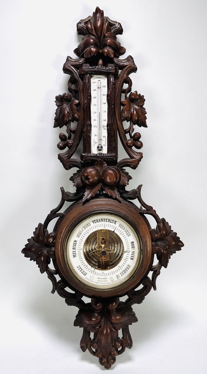 Weerstation met barometer en thermometer in neorenaissance stijl, eerste helft 20e eeuw. De kast is uitgevoerd in rijk gesneden notenhout met druiventrossen en bladornamenten. De barometer toont Nederlandstalige weersaanduidingen en is onderzijde gemerkt "Gudendag Opticien de la Cour – Amsterdam". Uitgevoerd in hout, glas, porselein en messing, met handgesneden en mechanische technieken.