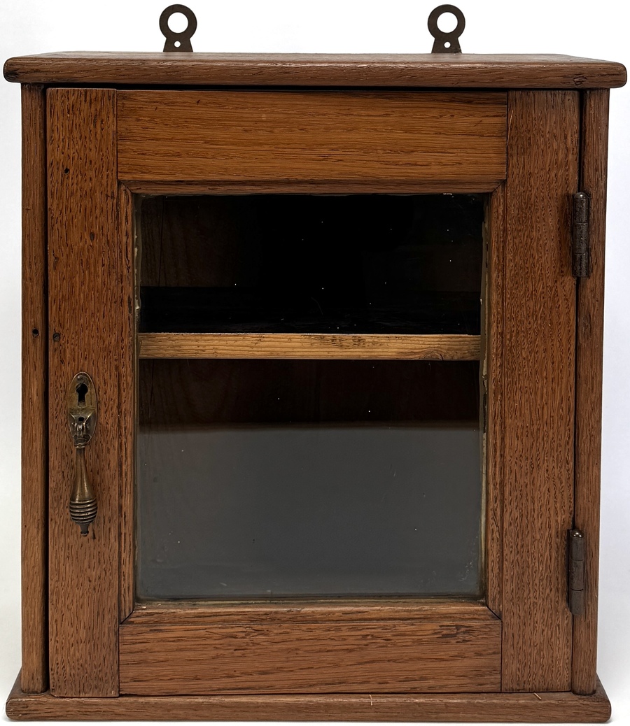 Dit hang kastje van eikenhout en messingbeslag dateert van omstreeks 1920–1940. Het kastje is aan de voorzijde voorzien van een glazen deur. De knop en het slotje zijn vervaardigd van messing, net als de scharnieren. Het interieur is voorzien van een enkele plank.
