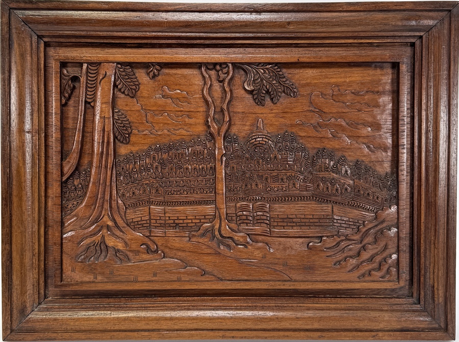 Reliëf van houtsnijwerk en toont de Borobudur tempel in een heuvelachtig landschap. Het is vervaardigd in de periode circa 1930–1960. De voorstelling is gedetailleerd, met de hand gesneden uit een stuk hout en vervolgens gevat in een bijpassend houten frame. De achterzijde is voorzien van een ophangmechanisme.