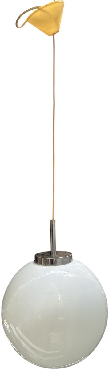 Mid-century modern hanglamp van opaalglas en verchroomd metaal is vervaardigd in de periode circa 1960–1970. De lamp heeft een minimalistische, bolvormige kap van opaalglas en een metalen stang die de lamp vasthoudt.