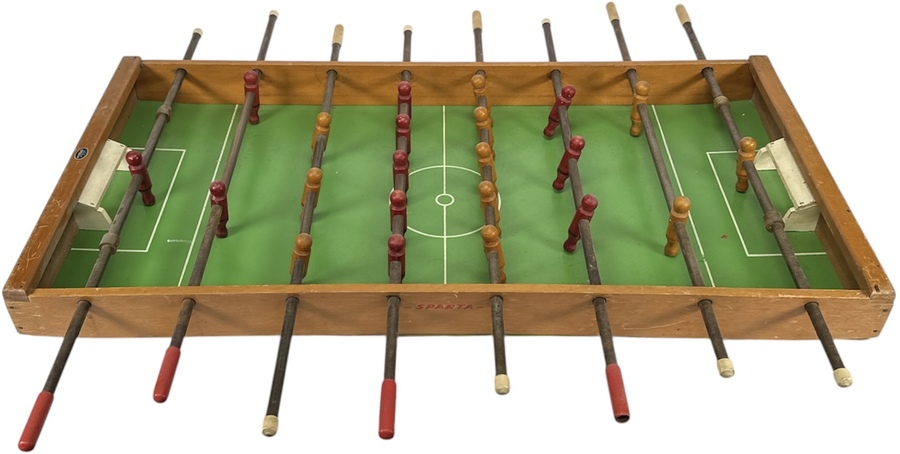 Houten tafelvoetbalspel, gemerkt Homas aan de zijkant, uit omstreeks midden 20e eeuw. Uitgevoerd in hout met metalen stangen en houten spelers in rood en geel, geplaatst op een groen beschilderd speelveld met witte belijning.