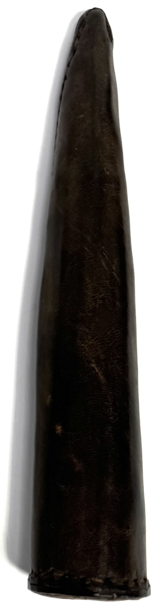 Leren breischede uit de eerste helft van de 20e eeuw, uitgevoerd in handgenaaid leer met een conische vorm en een afsluitende ronde schijf. Kenmerkend zijn de stevige stiksels langs de naad en de functionele, sobere uitvoering zonder decoratie. Het object diende als opbergmiddel en bescherming voor breinaalden.