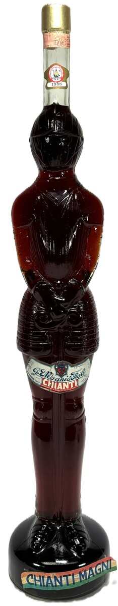 Glazen Chianti fles in de vorm van een ridder, vervaardigd door G. Magni & Figlio en gedateerd 1988. De fles is uitgevoerd in gegoten glas met decoratieve riddervorm, voorzien van metalen dop en bedrukt papieren etiket. Aanwezig zijn de teksten “Chianti Magni” en “G. Magni & Figlio”.