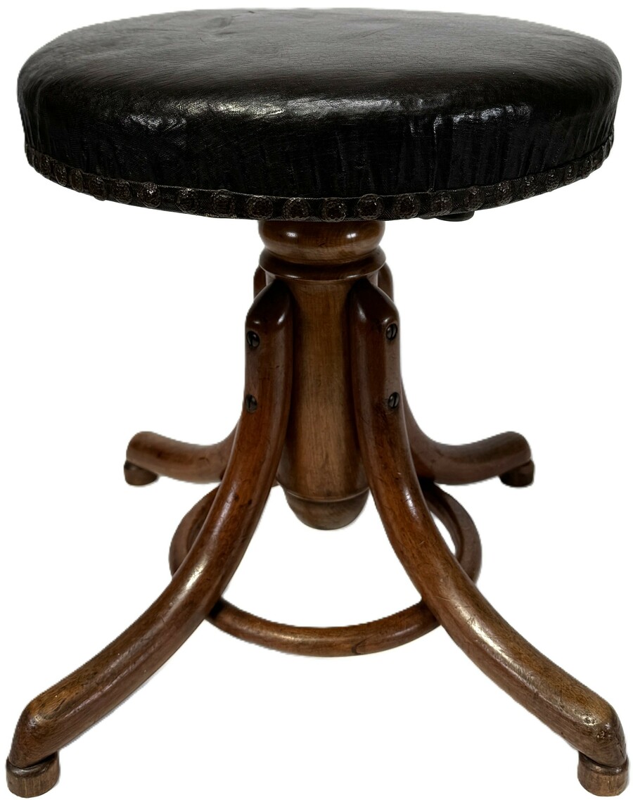 Houten Thonet piano krukje met zwart skai beklede ronde zitting, begin 20e eeuw. Het meubel heeft een centrale gedraaide houten kolom met vier gebogen poten, verbonden door een ringvormige constructie. De zitting is afgewerkt met metalen nagels en ondersteund door een metalen versteviging aan de onderzijde.