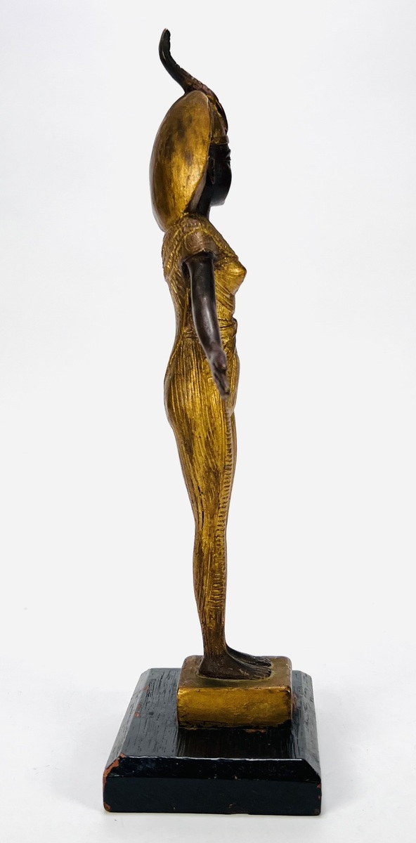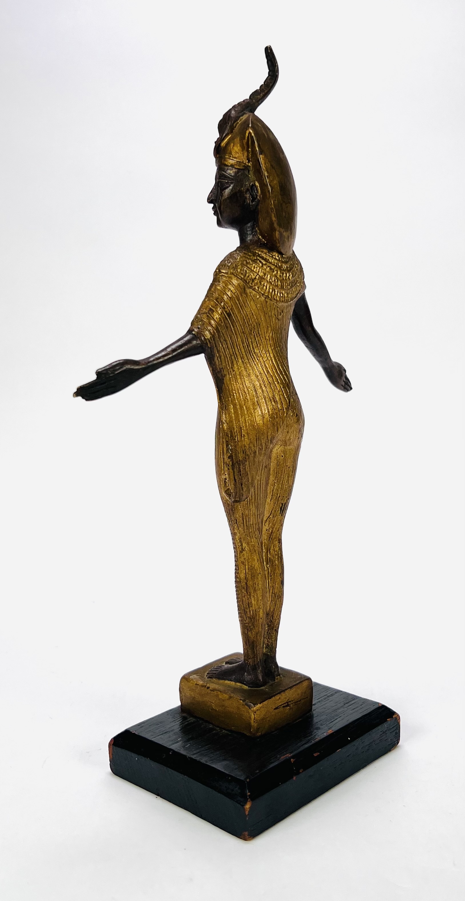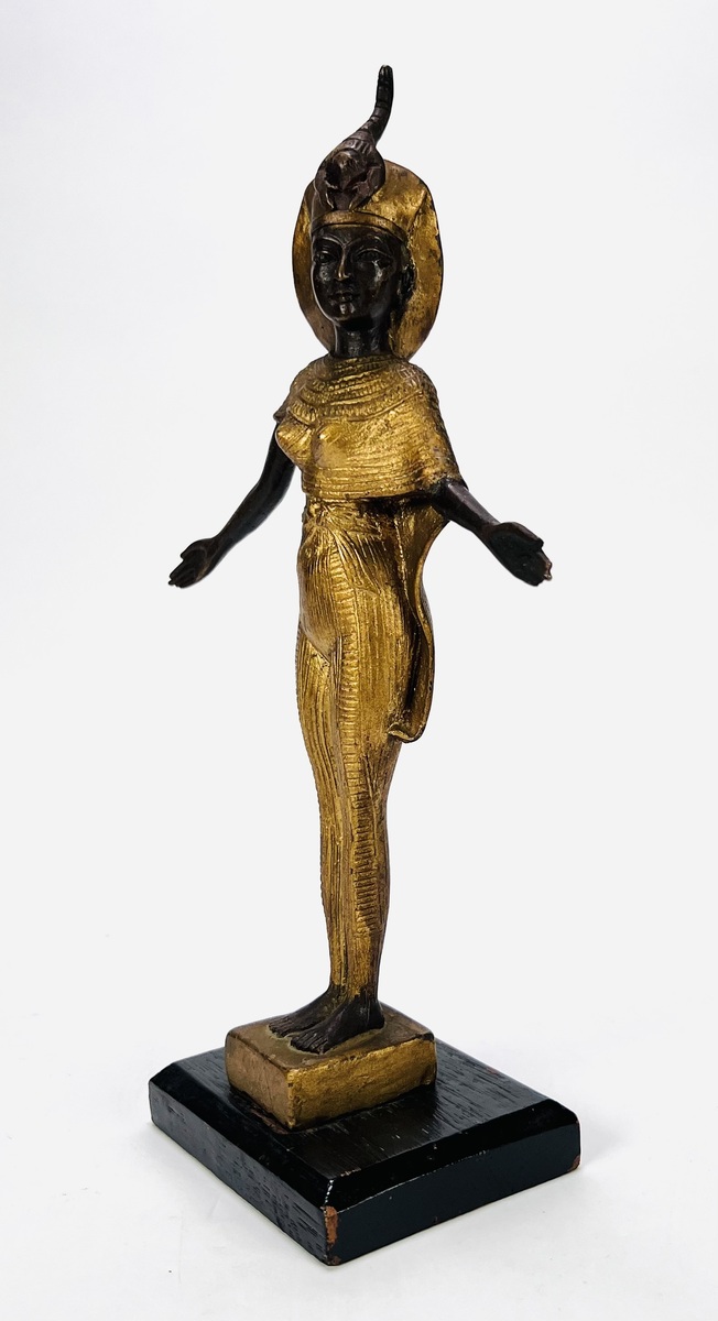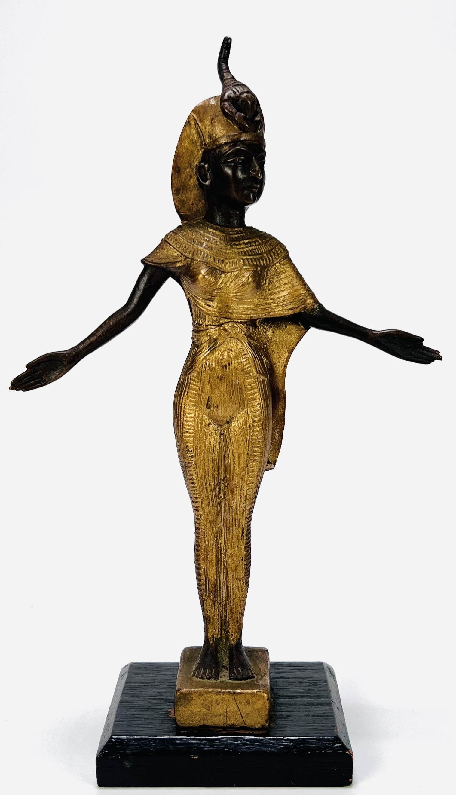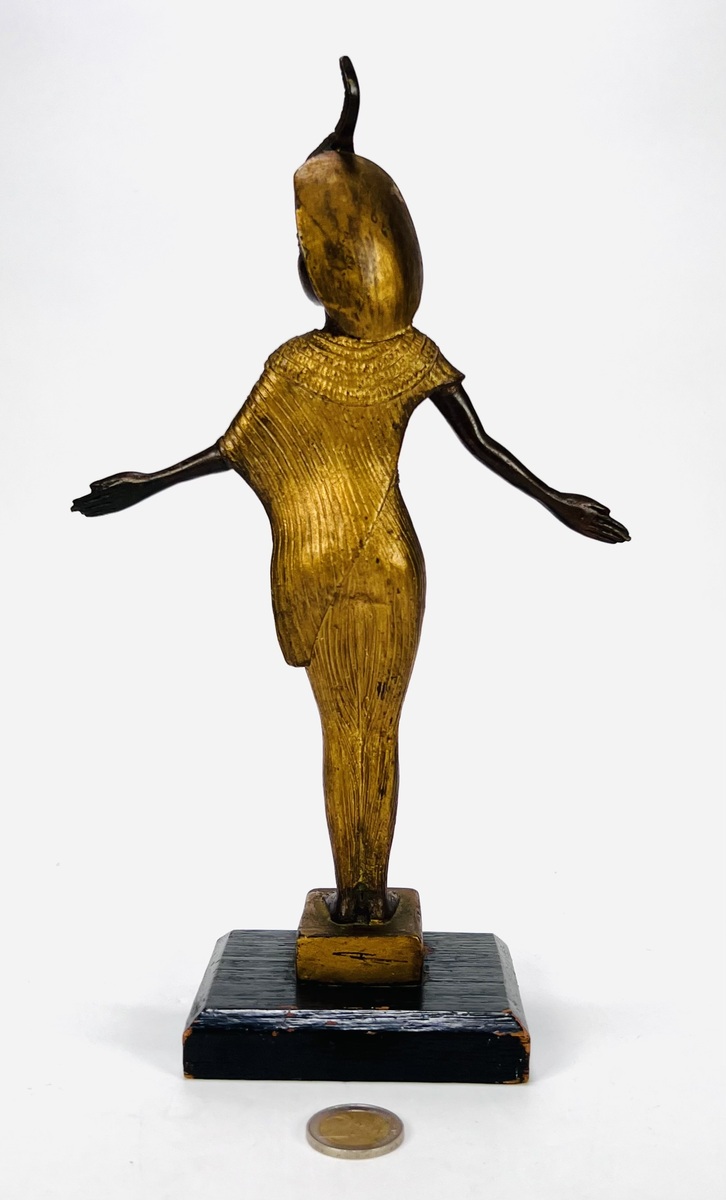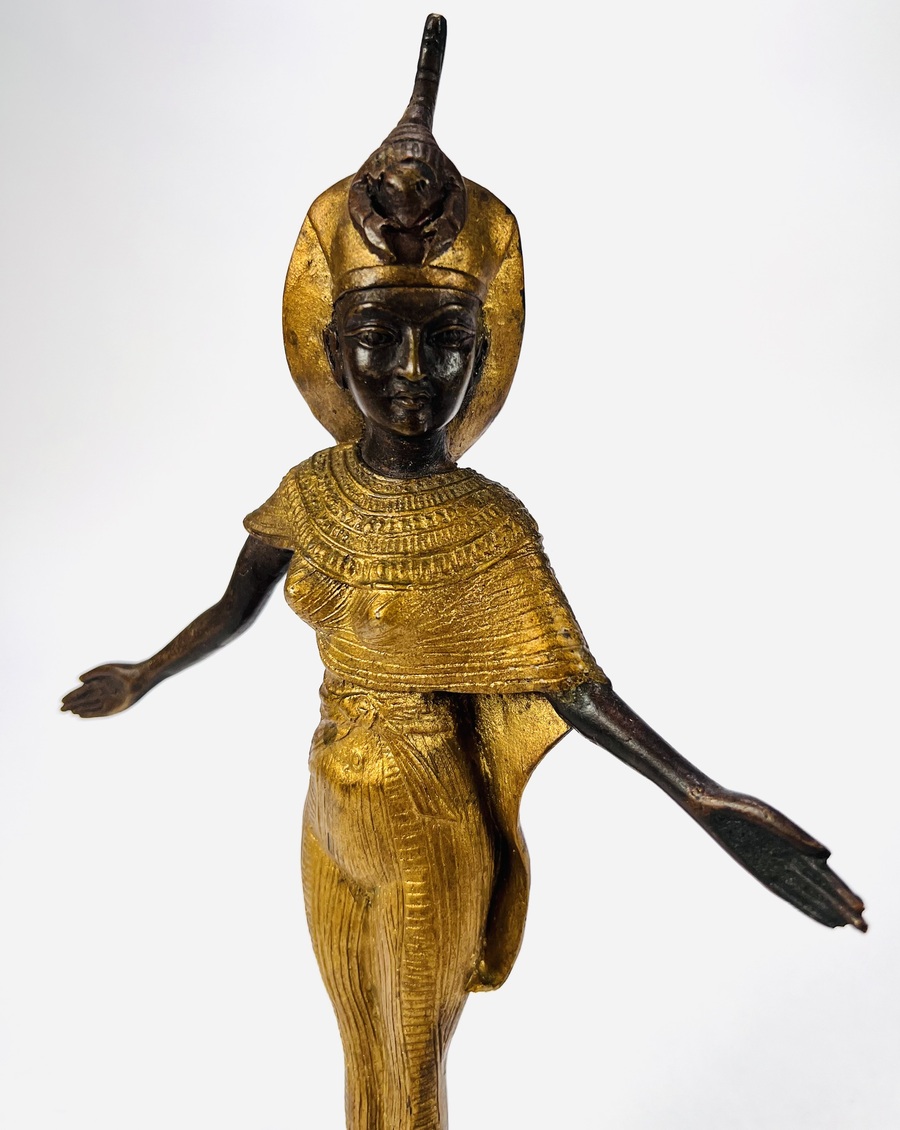 Messing beeld van een Egyptische koningin in een dynamische houding met gespreide armen. Het beeld is afgewerkt met een donkere patina en goudkleurige details op de geplisseerde kleding en de uraeus hoofdtooi. Dit Egyptisch revival beeld dateert uit de 20e eeuw en is gemonteerd op een zwart gelakt houten basis Geïnteresseerd? Bezoek onze kijkdagen op 28, 29 of 30 november van 11:00 tot 17:00 uur! |
