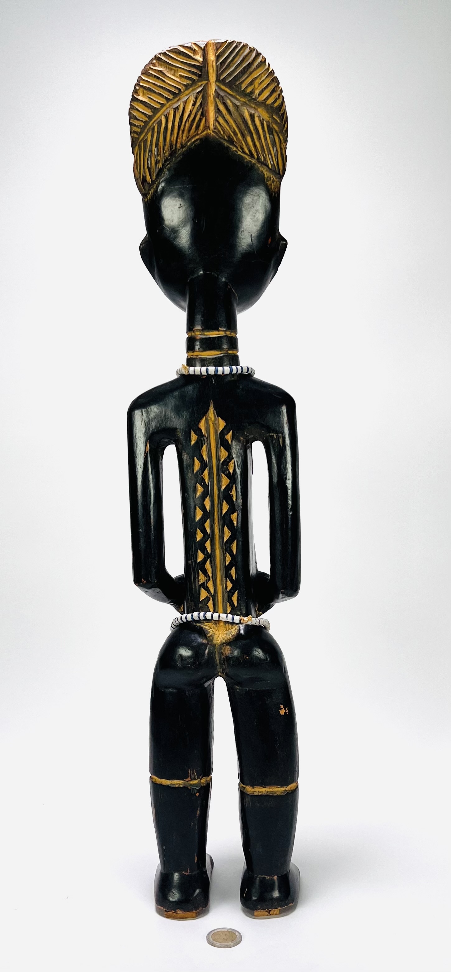 Houten Baule beeld van een vrouwelijke figuur uit Ivoorkust, tweede helft 20e eeuw. Het beeld toont een gestileerde vrouw met geaccentueerde kapselstructuur en ingesneden rugdecoratie. Kenmerkend zijn de kralensieraden rond hals, middel en enkels. Het beeld is gesneden uit hout, met incisie ornamentiek en gepolychromeerde accenten. Wil je dit beeld in het echt bekijken? Kom naar de kijkdagen op 28, 29 en 30 november! |