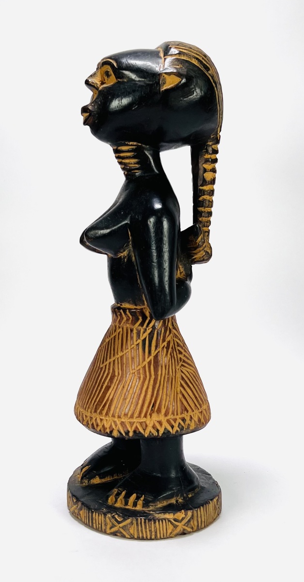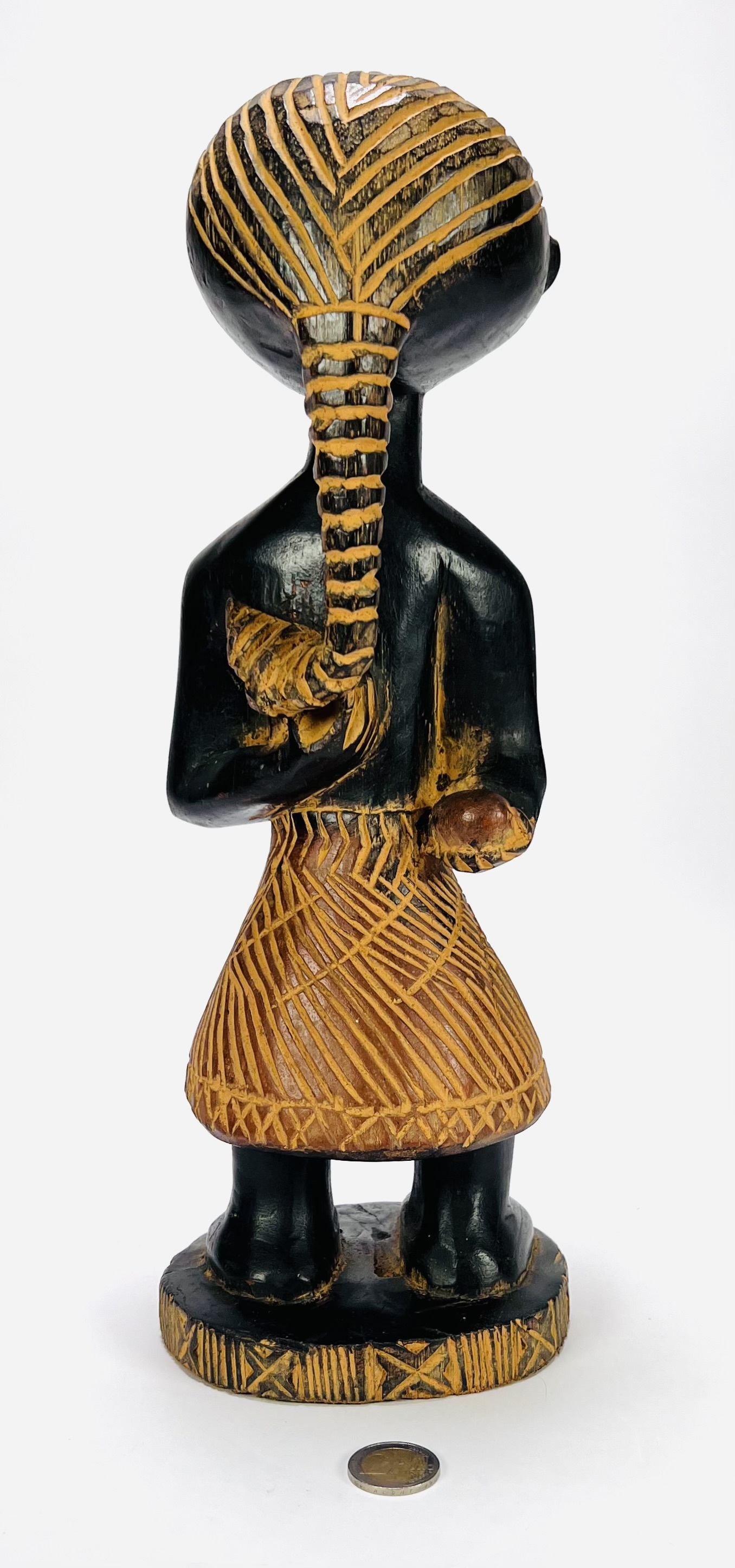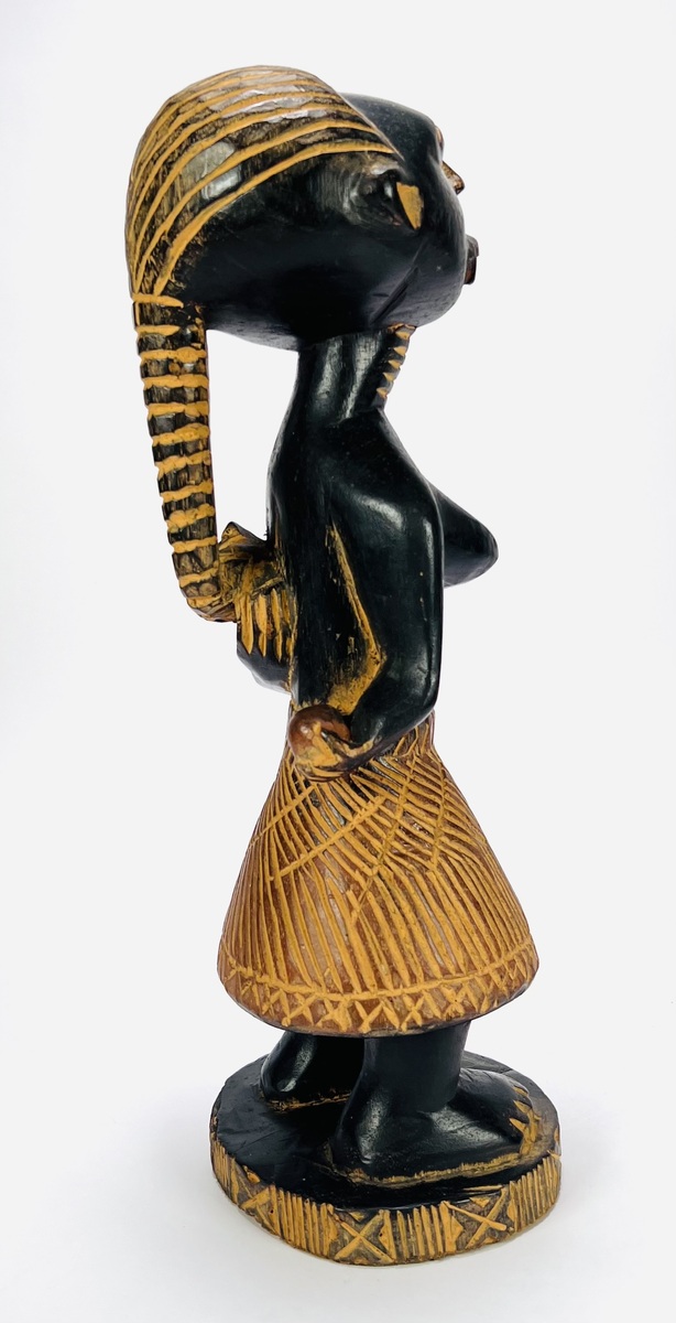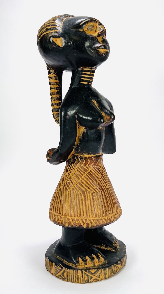 Houten beeld, tweede helft 20e eeuw, Oost-Afrika, een vrouwelijke figuur met lang kapsel, halsringen en geometrisch ingesneden rok. De voetplaat is eveneens versierd met lineaire patronen. Het beeld is vervaardigd uit donker tropisch hardhout en bewerkt in houtsnijwerk met gepolijste afwerking en uitgespaarde details. Zeker zijn van deelname? Plaats vanaf 21 november een schriftelijk bod online! |
