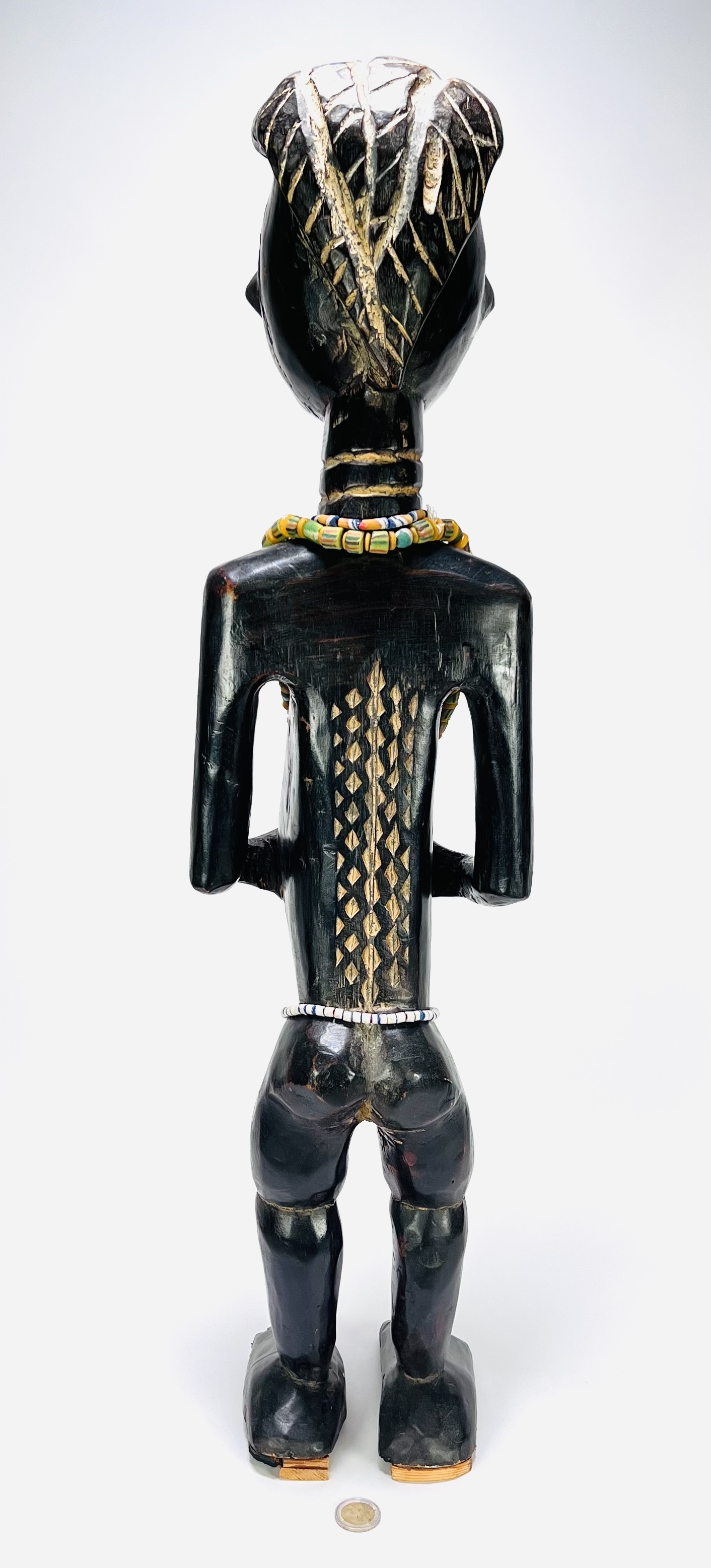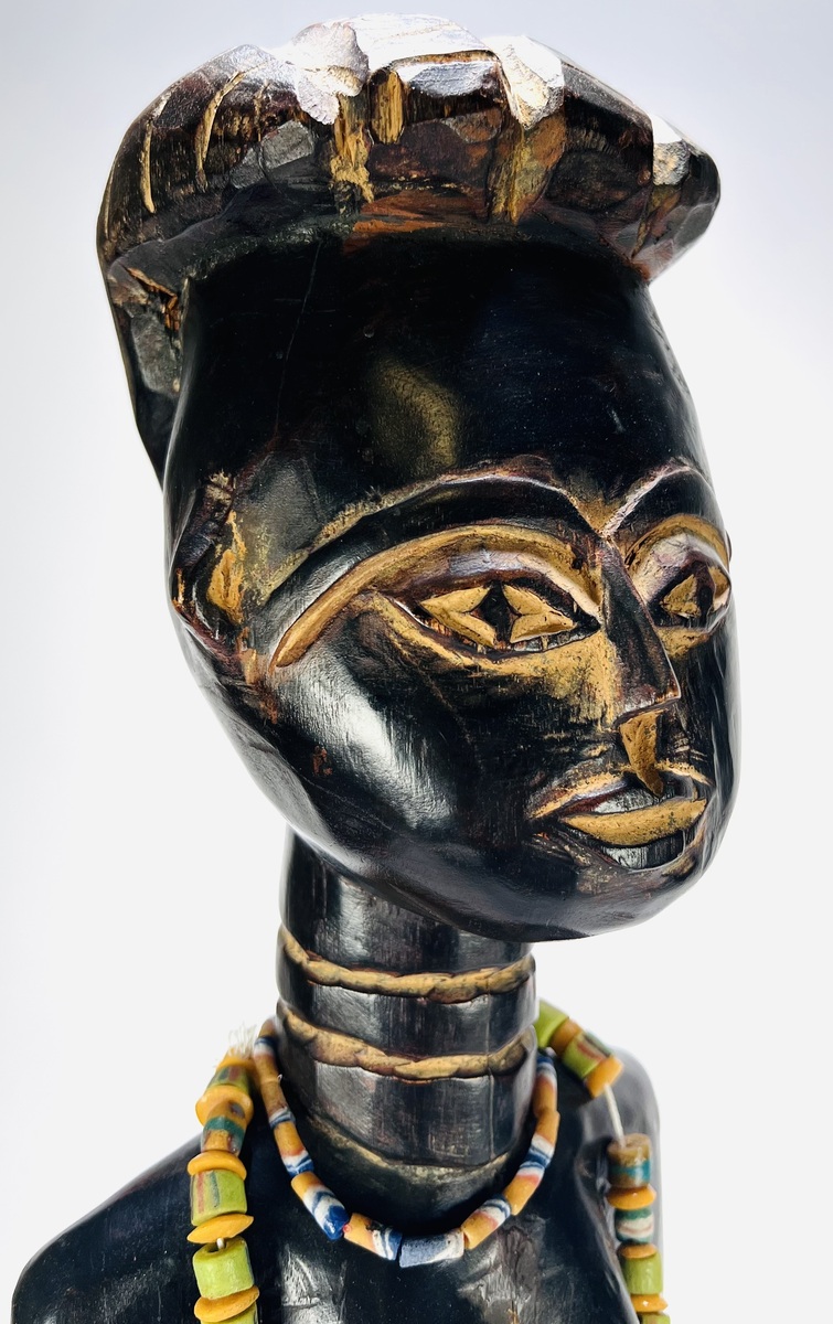 Houten vrouwelijk Luba beeld in uit Congo, midden 20e eeuw, met donkere patina en beschilderde littekens. Het beeld toont een staande figuur met ringen rond de nek, geometrisch gekerfd kapsel en kralensnoeren rond hals en middel. Kom langs tijdens de kijkdagen (28 t/m 30 november) en ontdek dit beeld zelf! |