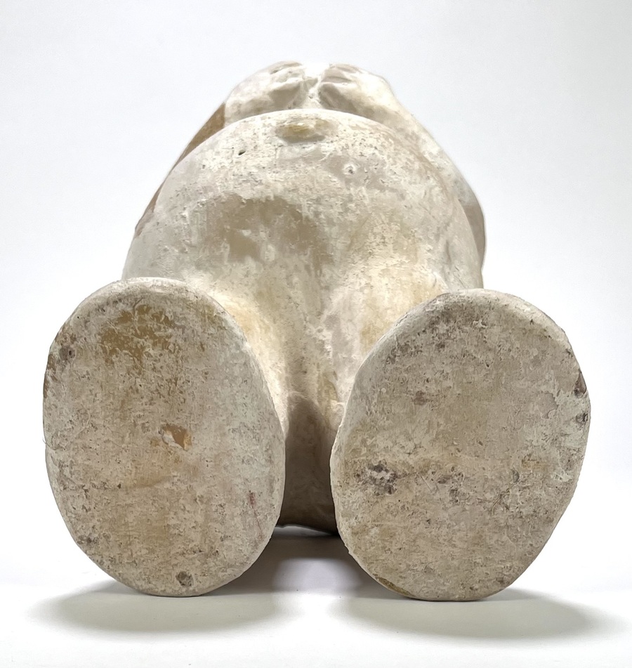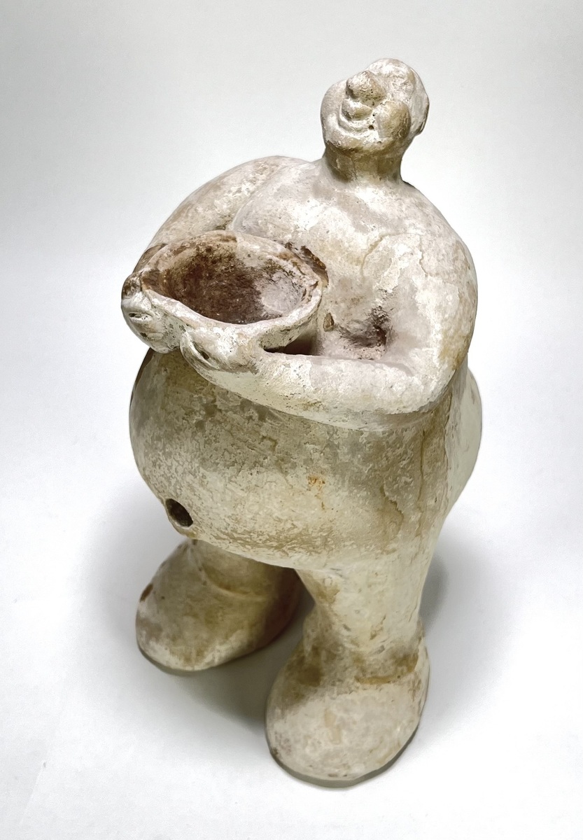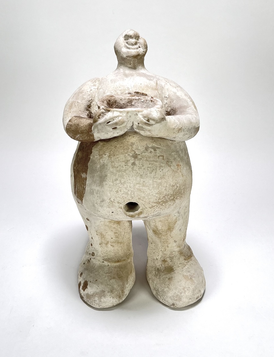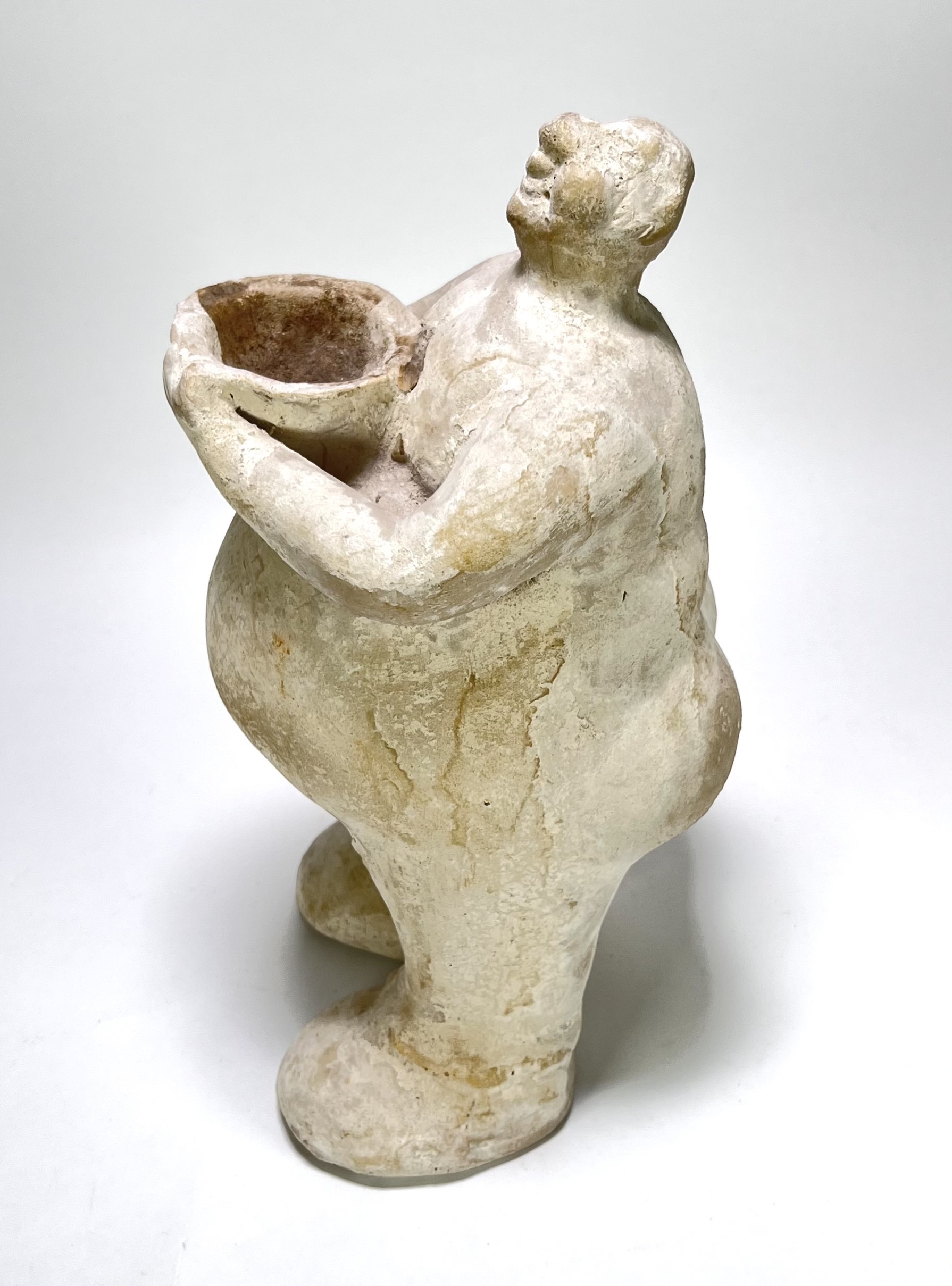 Handgevormd beeld van terracotta met een ruwe, witte slibafwerking. Het beeld stelt een corpulent figuur in een primitivistische stijl voor die een kleine kom vasthoudt en naar boven kijkt. Anoniem, eind 20e eeuw. Zeker zijn van deelname? Plaats vanaf 21 november alvast een schriftelijk bod online! |