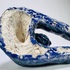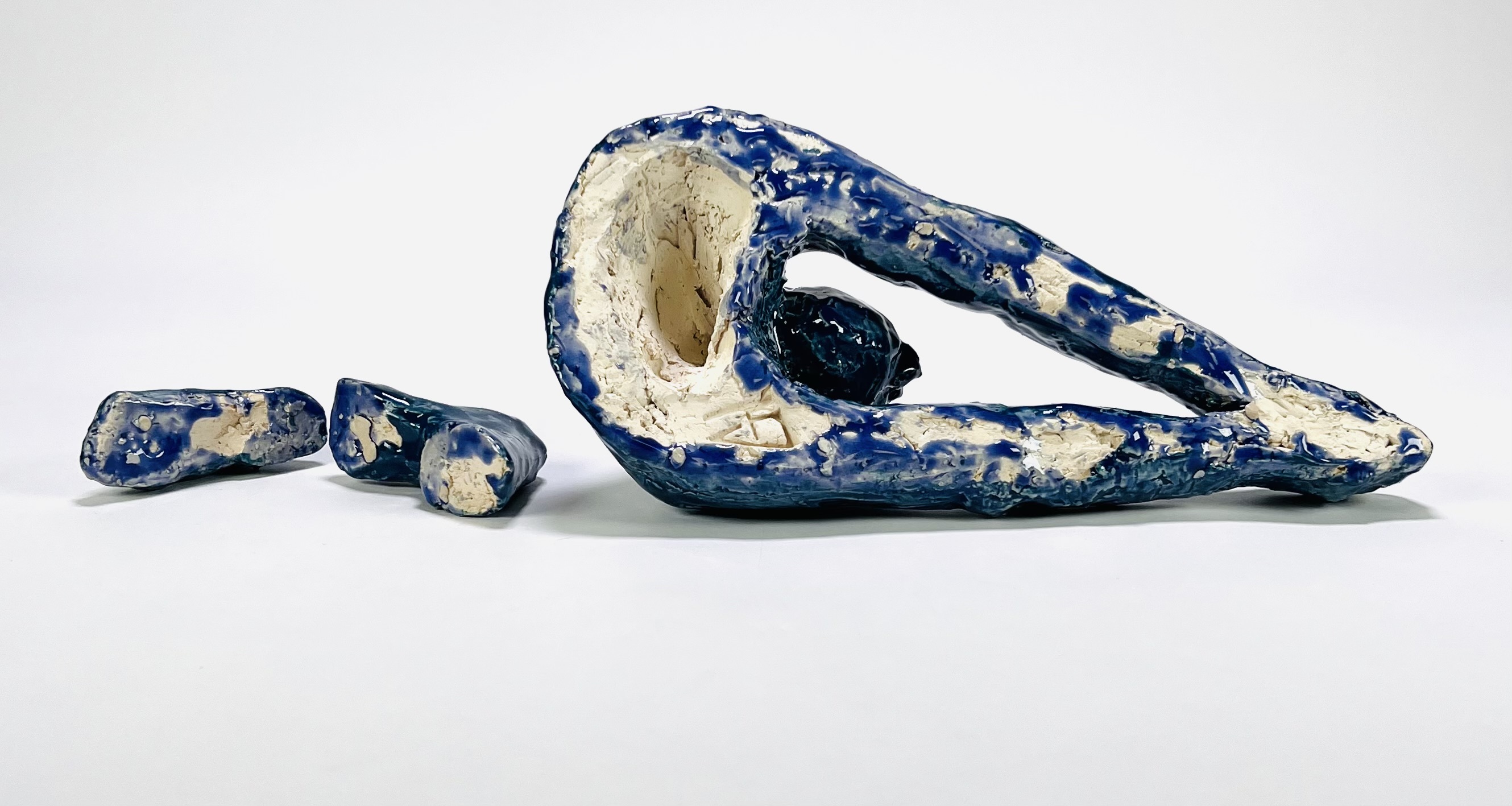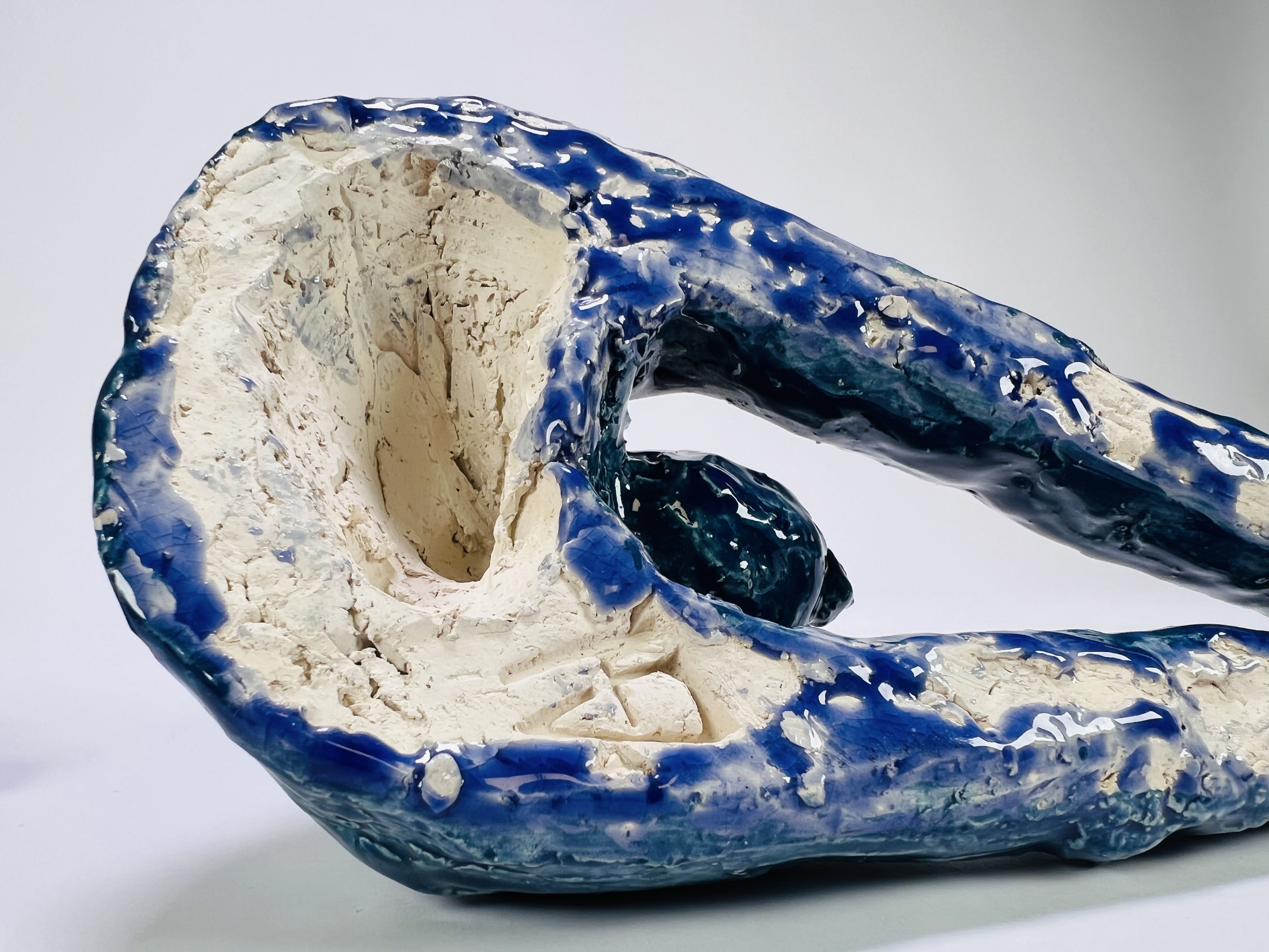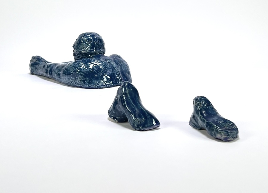 Keramische beeld in expressionistische, figuratieve stijl door Greetje Hoving, daterend 21e eeuw. Het beeld bestaat uit een zwemmend figuur en twee losse voeten, gemodelleerd uit ruwe klei. Het werk is afgewerkt met een glanzend kobaltblauw glazuur over een bruine ondergrond Wil je dit beeld in het echt bekijken? Kom naar de kijkdagen op 28, 29 en 30 november! |