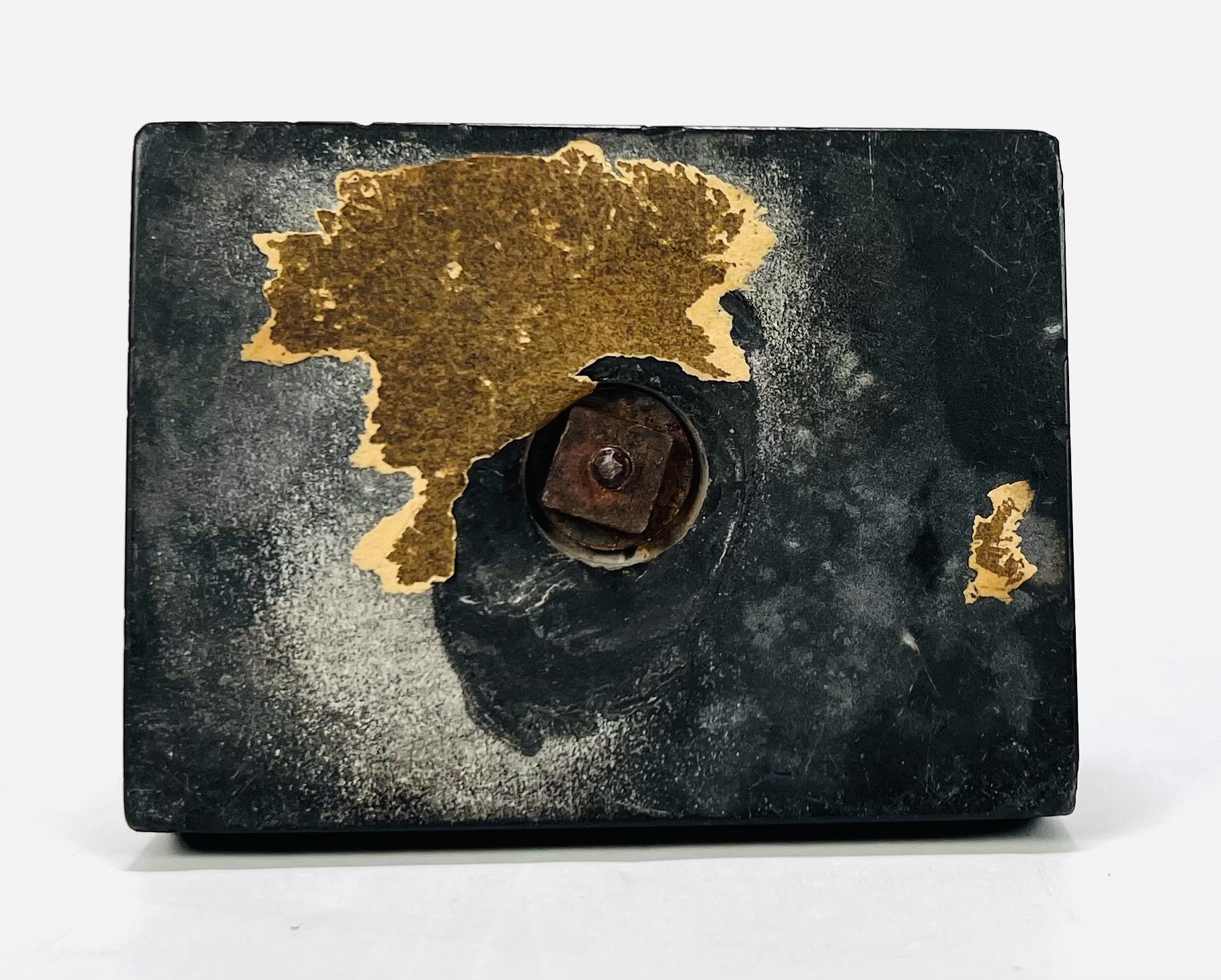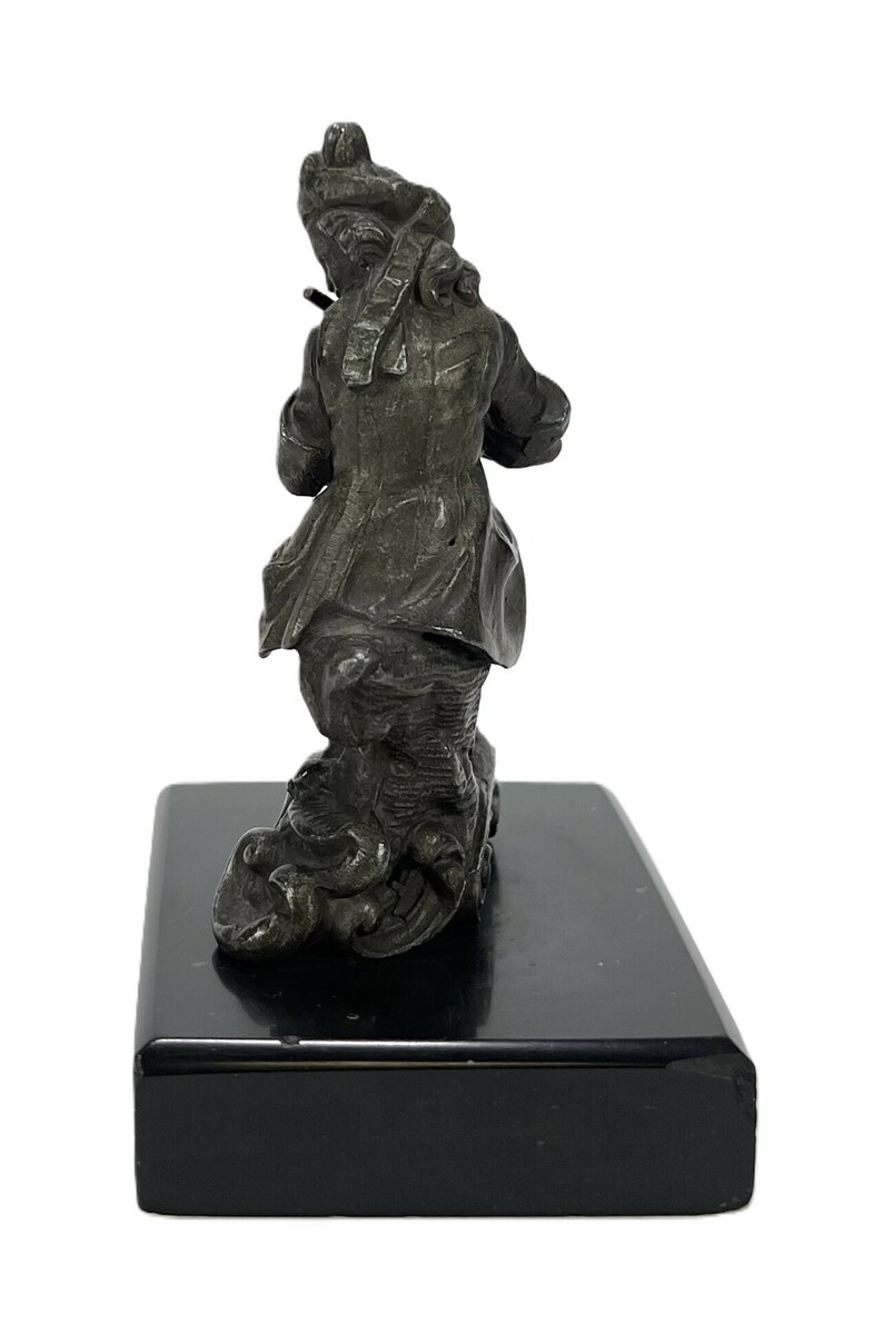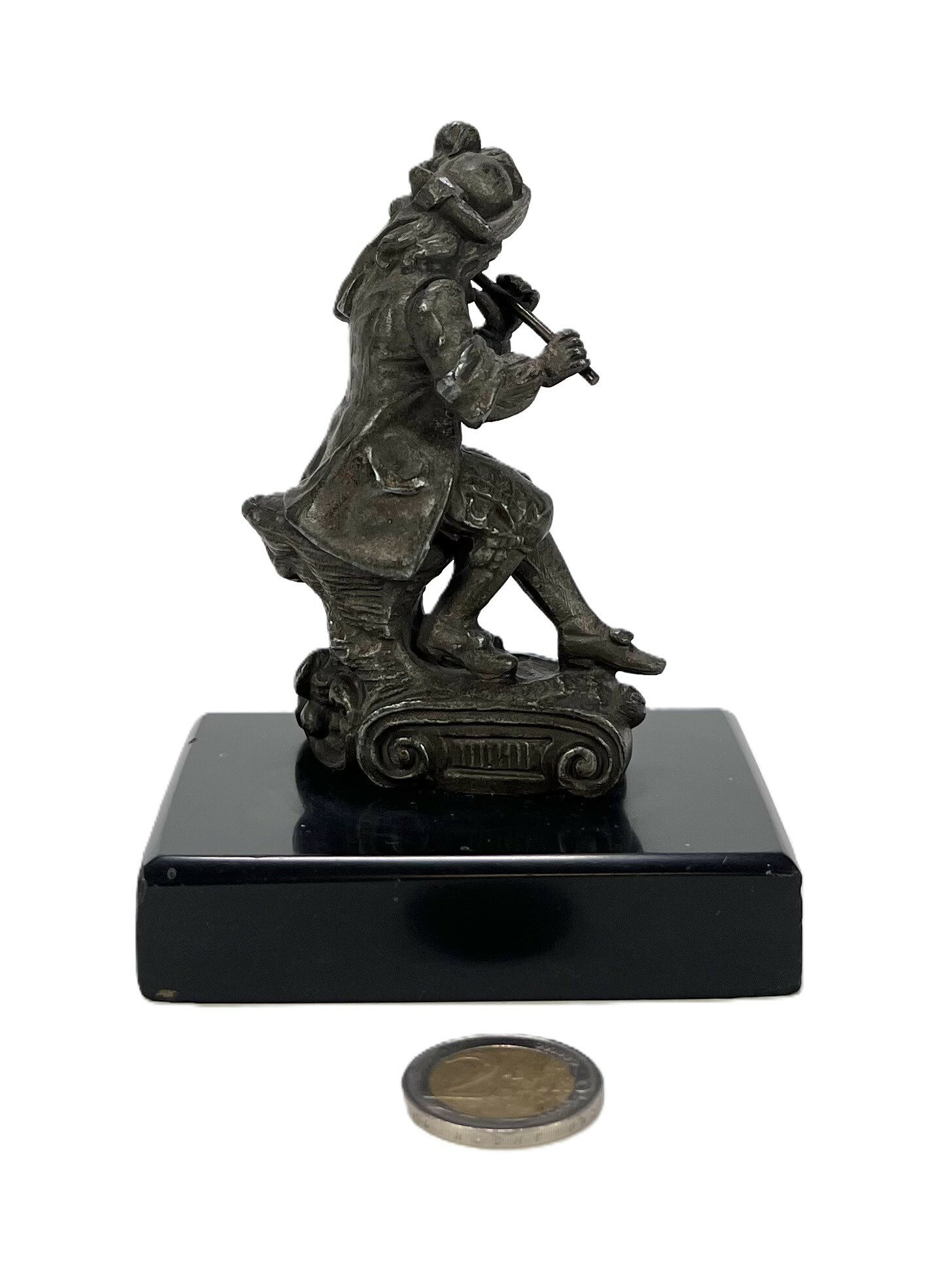 Kleine figuur van een zittende muzikant met traversfluit, vervaardigd middels giettechniek, wit metaal legering. Het rococo beeldje dateert uit de tweede helft 19e eeuw en heeft een donkere patina en is gemonteerd op een strakke, rechthoekige zwarte stenen sokkel. Wil je direct deelnemen? Plaats vanaf 21 november alvast een schriftelijk bod via onze website! |