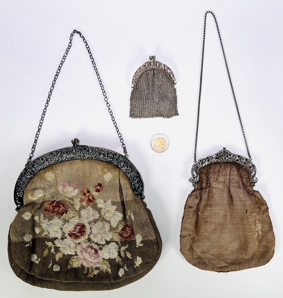 Drie antieke beursjes, circa 1890–1925, met zilveren monturen en kettingen. De collectie omvat een maliënbeurs en twee textiele tassen, waaronder één met petit point bloemborduurwerk. Twee monturen zijn gemerkt 800 en één met de Nederlandse lopende leeuw (zilver 835/1000). De Art Nouveau zilveren monturen zijn gegraveerd met florale patronen. Kom langs tijdens de kijkdagen (28 t/m 30 november) en ontdek deze beursjes zelf! |