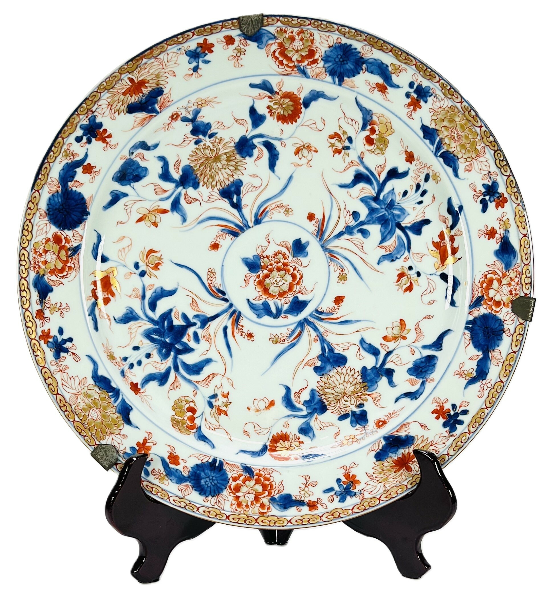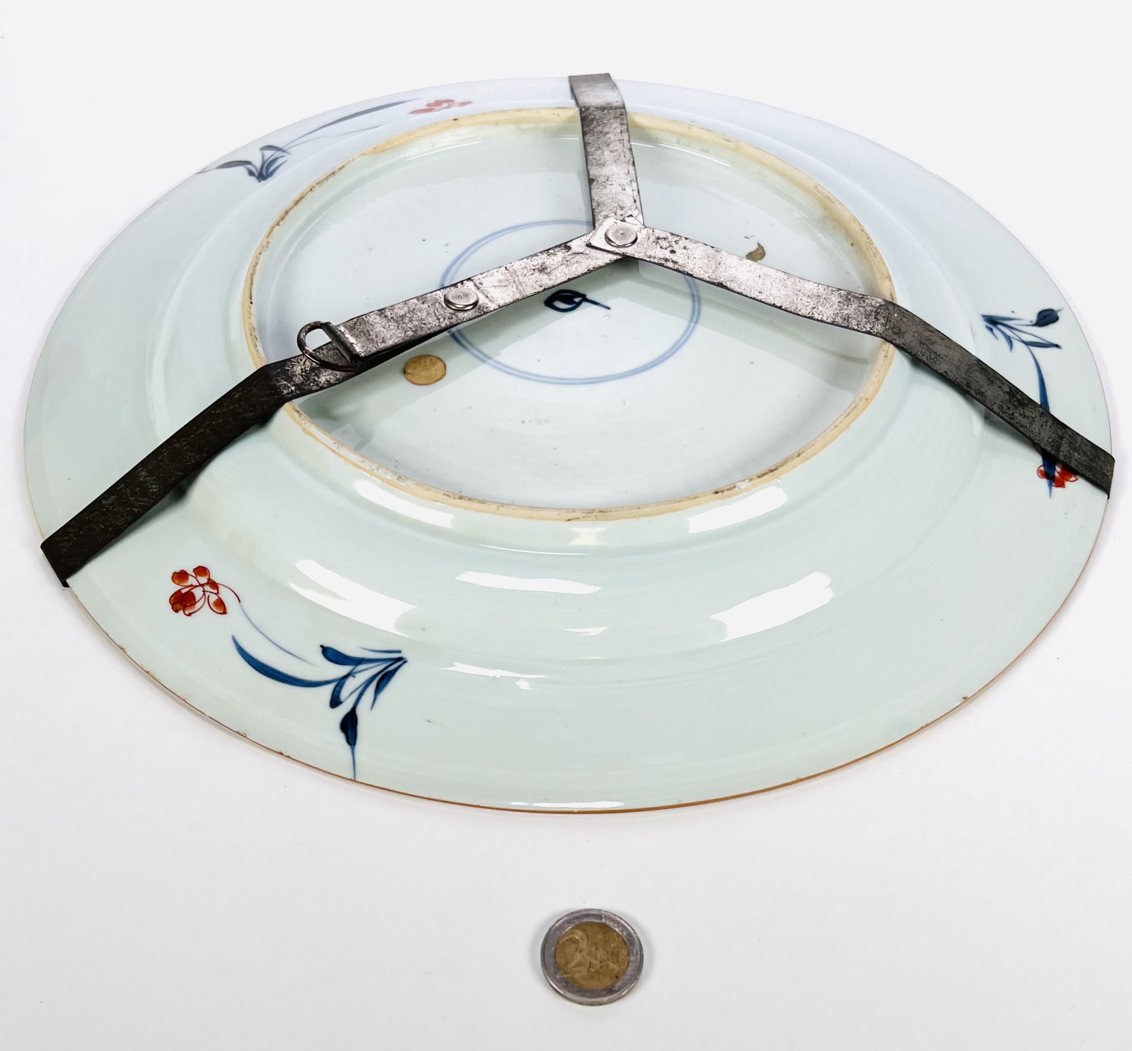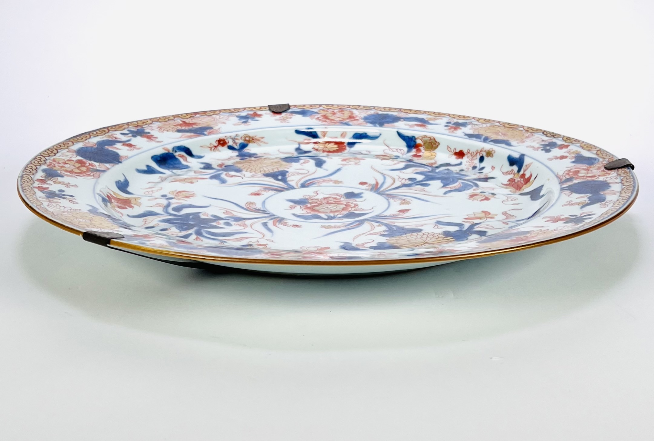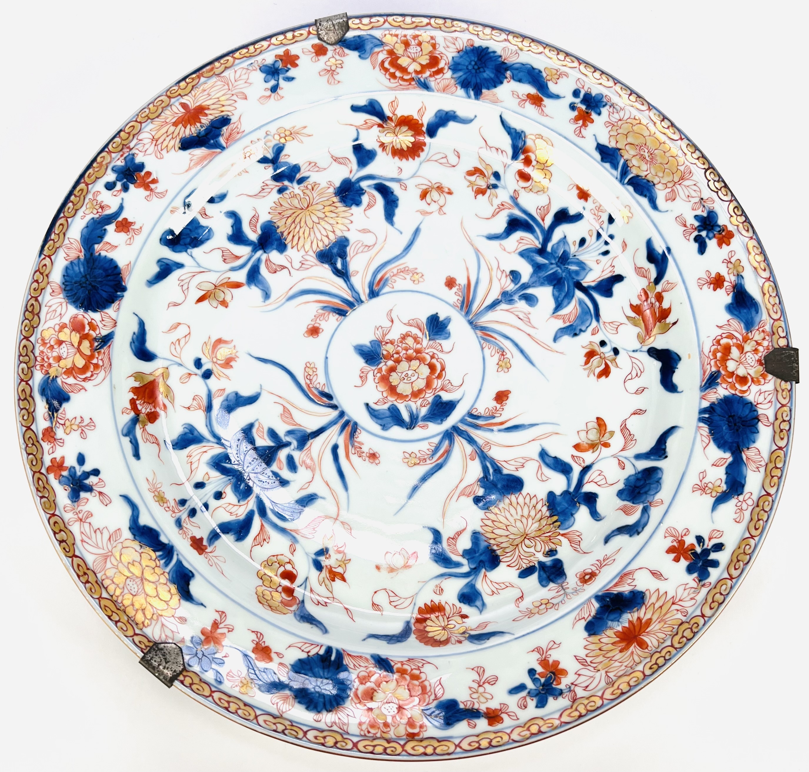 Grote Chinese Imari porseleinen schotel, vervaardigd in Jingdezhen tijdens de overgang van de Kangxi- naar Yongzheng-periode, eerste helft 18e eeuw. De schotel toont handbeschilderde florale motieven in onderglazuur blauw, ijzerrood en vergulding met centrale pioen en randdecoratie van bloemtakken. Merkteken zichtbaar op de onderzijde. Wil je direct deelnemen? Plaats vanaf 21 november alvast een schriftelijk bod via onze website! |