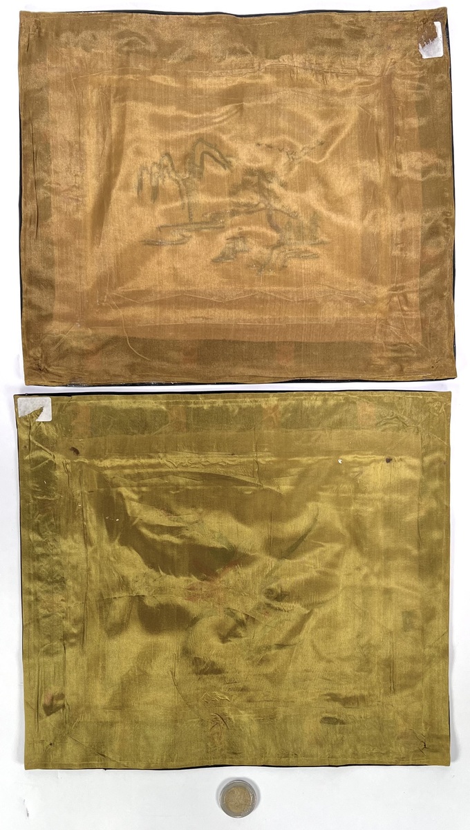 Chinese zijdeborduurwerken, circa 1900–1930, uitgevoerd in zijde en borduurgaren in een traditionele stijl. Een paneel met een gestileerd berglandschap met kraanvogels en een paneel met een floraal motief met vogel. De afbeeldingen zijn omrand met een zijden patroonrand in goud en blauw. Wil je direct deelnemen? Plaats vanaf 21 november alvast een schriftelijk bod via onze website! |