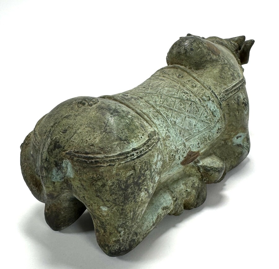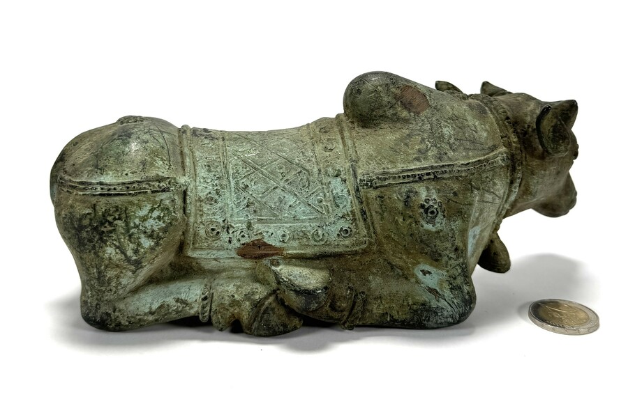 Bronzen beeld van de heilige stier Nandi, het rijdier van de hindoegod Shiva, gegoten met de verlorenwastechniek. Het beeld in traditionele Zuid-Aziatische stijl, daterend van eind 19e eeuw, toont de stier in liggende positie. Kenmerkend zijn de dikke, diepgroene patina en de gedetailleerde ceremoniële bedekking op de rug. Registreer nu en bied eenvoudig online mee op dit beeld! |