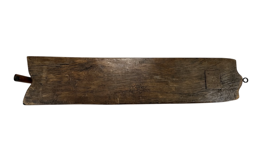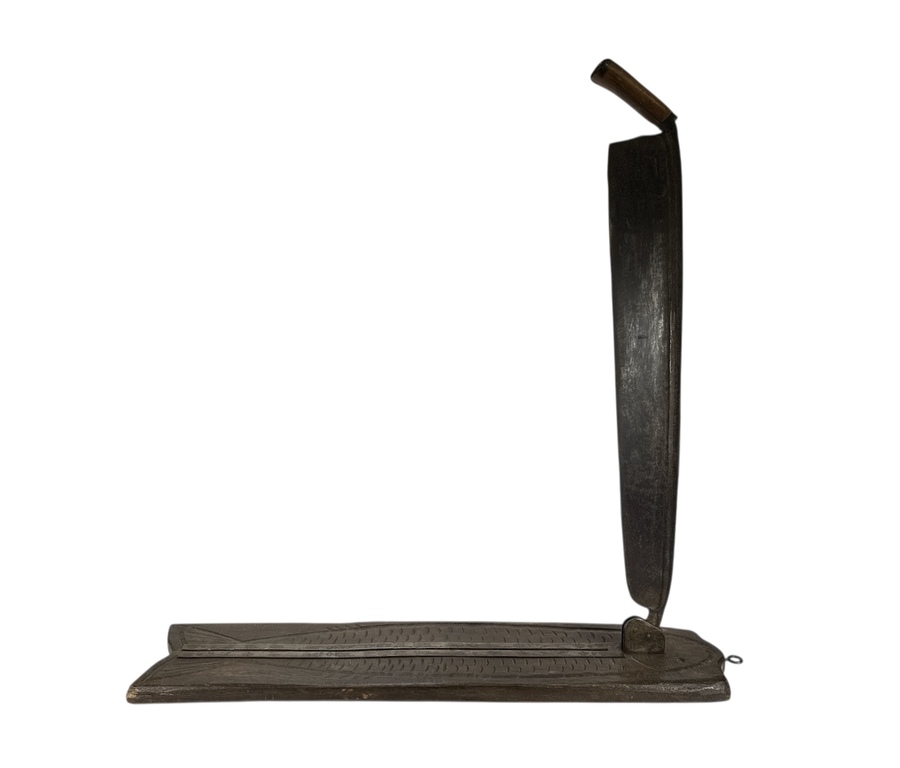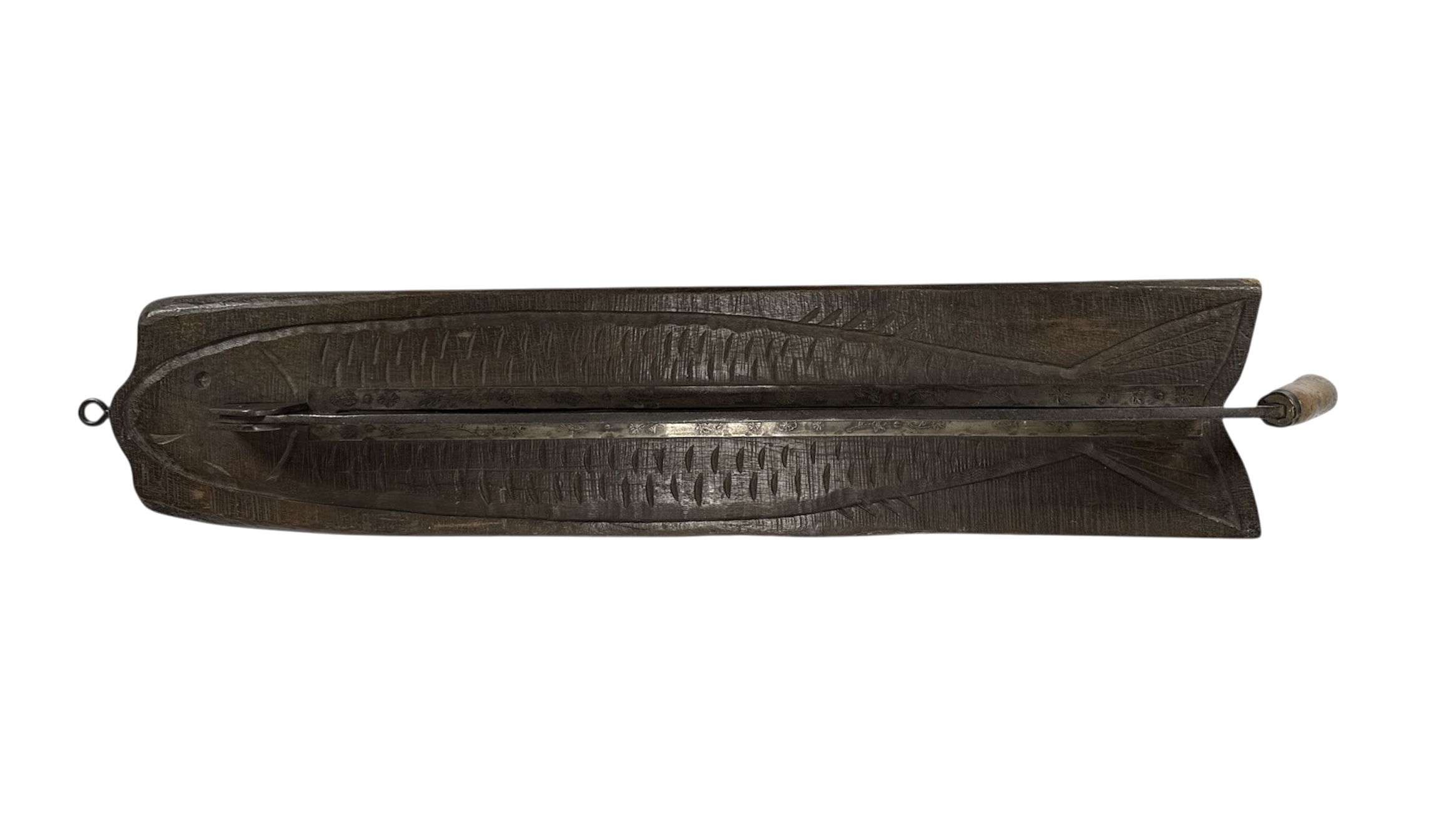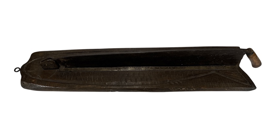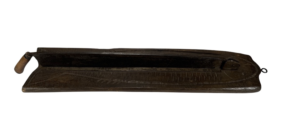 Deze vishakplank is een utilitair object vervaardigd uit donker hout met houtsnijwerk en voorzien van een lang scharnierend mes met houten handvat. De plank volgt de gestileerde contouren van een vis, inclusief een schaalpatroon op het oppervlak voor grip. Dit type gereedschap werd traditioneel gebruikt voor het fileteren van vis en is kenmerkend voor de Scandinavische volkskunst. De constructie en stijl dateren de plank in de eerste helft van de 20e eeuw. De vishakplank zelf beoordelen? Je bent welkom op onze kijkdagen op 28, 29 en 30 november! |