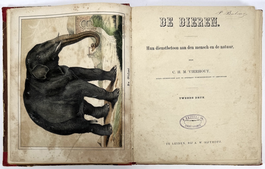 Verzameling van vier Nederlandse educatieve boeken en lesplaten over dieren, gedrukt op papier en karton, uit de periode tweede helft 19e eeuw tot circa 1920. De collectie omvat “De dieren, hun dienstbetoon aan den mensch en de natuur”, “Wilde-dieren galerij” en “De kluchtige aap en het poesje”, plus de cassette "Aanschouwelijk onderwijs" (M. A. Frank) .Op cassette met potlood: J.J.L. ten Kate (geb. 1819 - overl. 1889) en kleine sticker met inkt ‘ten Kate’. Klaar om te bieden? Registreer je nu en doe mee aan de veiling! |
