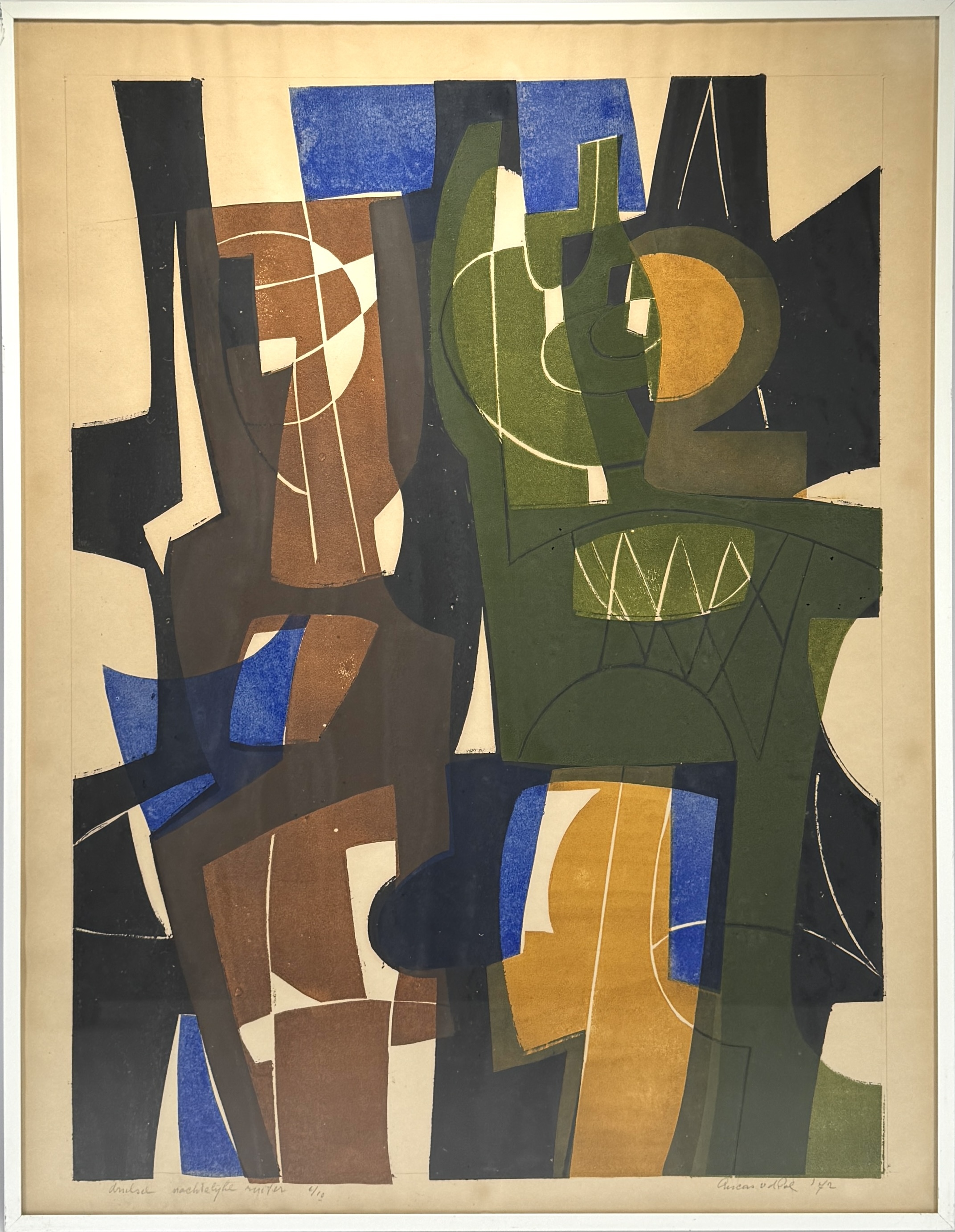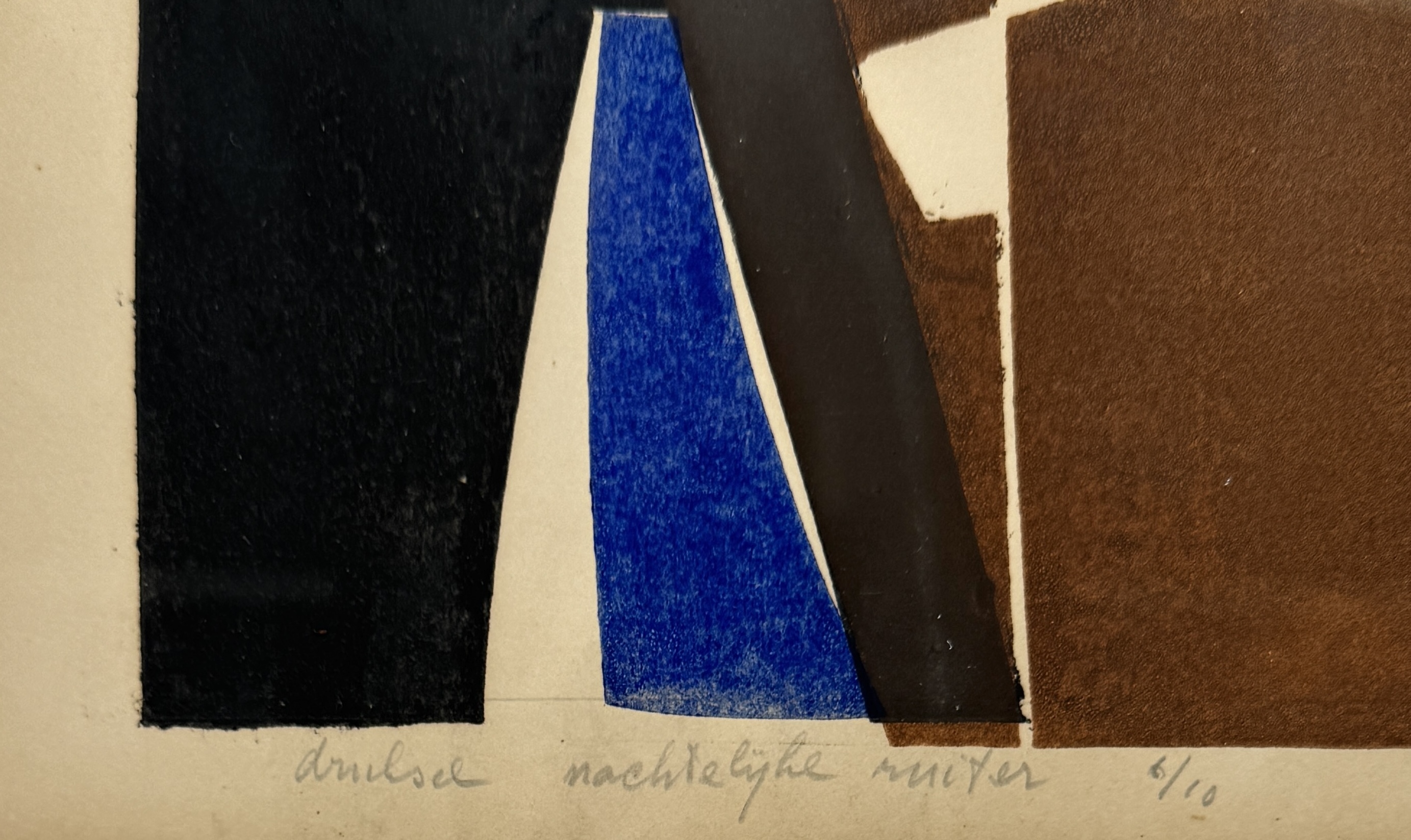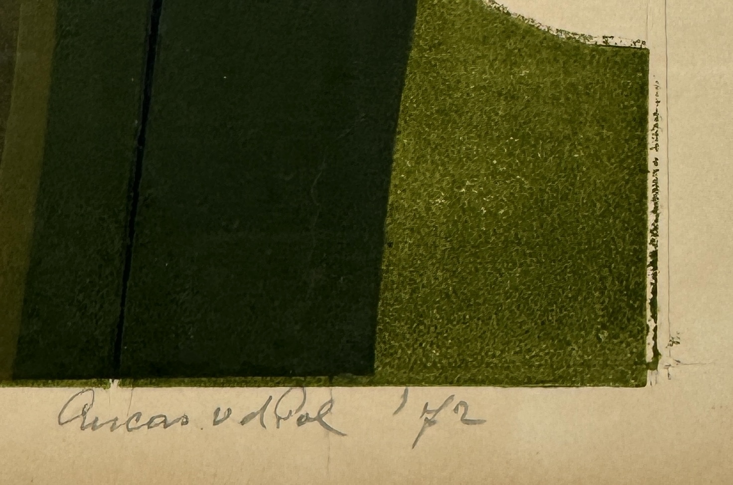 Druksel op papier door Lucas van der Pol (1935) uit 1972, getiteld "nachtelijke ruiter". Het werk is in meerdere kleuren uitgevoerd in de stijl van het abstract expressionisme. De voorstelling toont geabstraheerde figuren in overlappende vlakken van groen en kobaltblauw. Linksonder in potlood vermelding druksel, titel en oplagenummer 6/10, rechtsonder naam en datering. Geïnteresseerd? Bezoek onze kijkdagen op 28, 29 of 30 november van 11:00 tot 17:00 uur! |