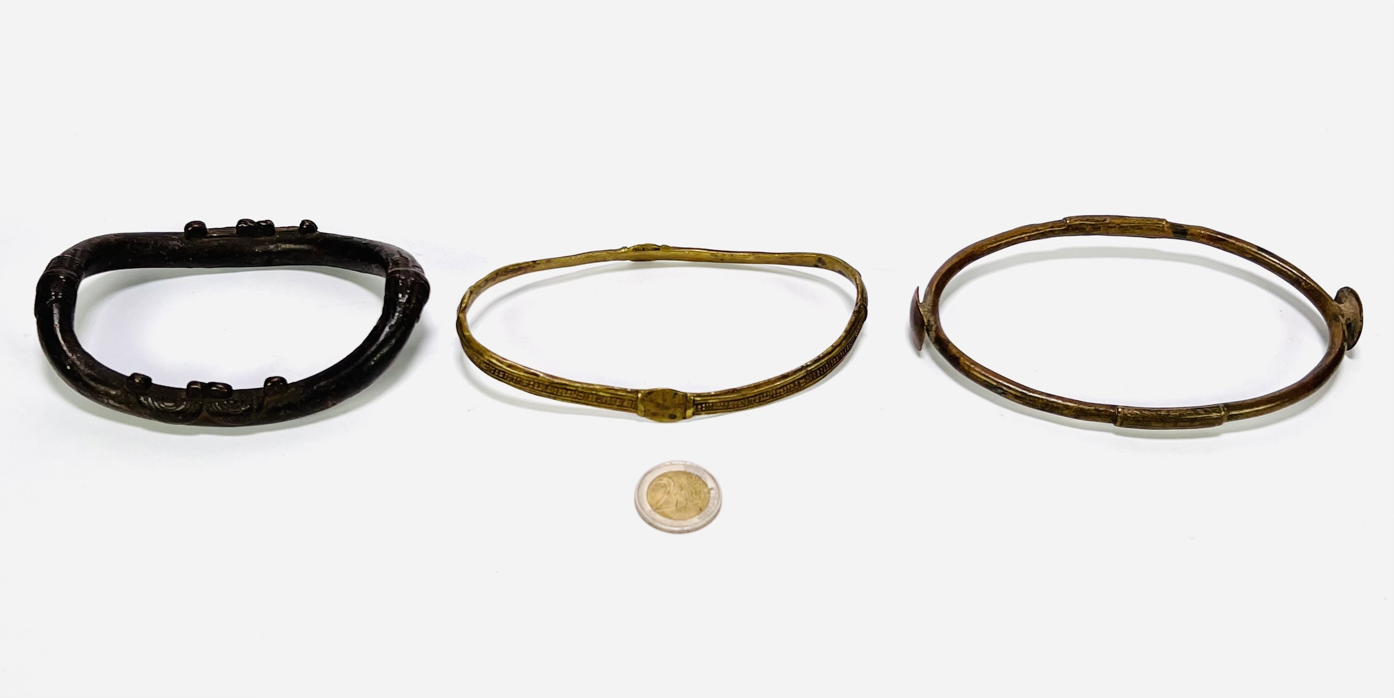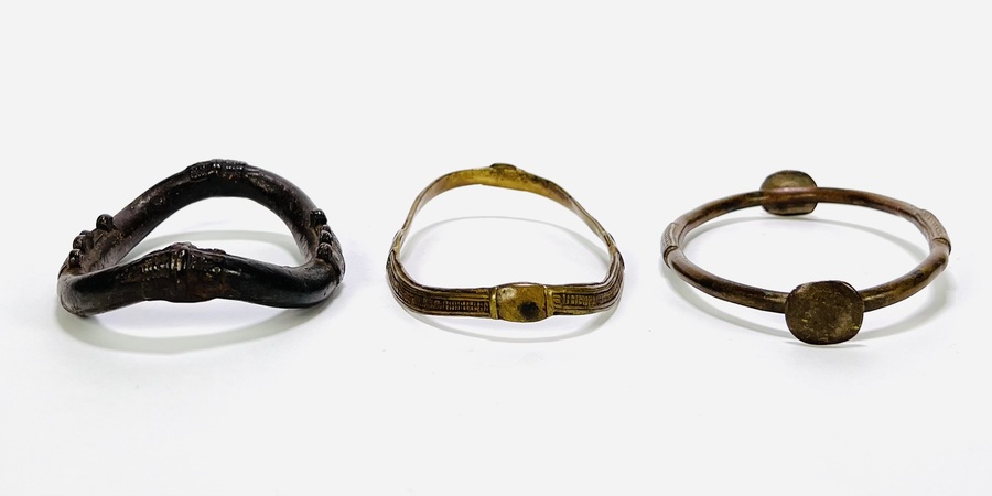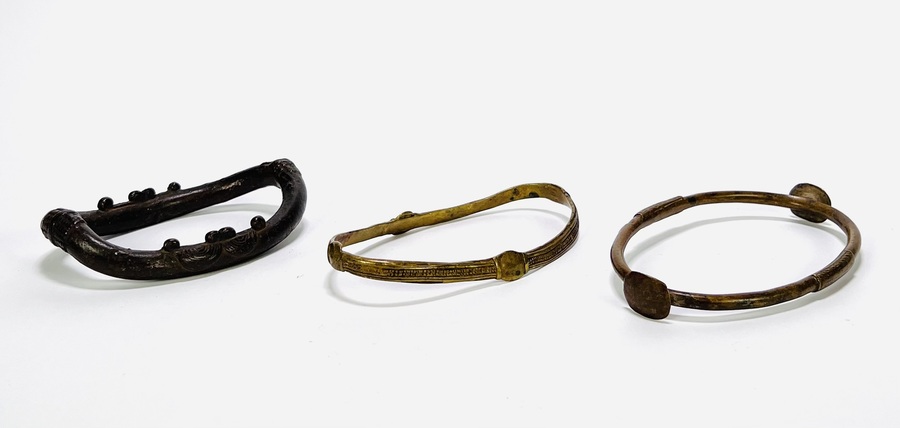 Drie etnografische armbanden van brons en messing, gegoten volgens de cire perdue-techniek en voorzien van gegraveerde en reliëfdecoraties. Afkomstig uit West-Afrika en Centraal-Afrika, daterend uit de periode ca. 1900–1960. De armbanden tonen diverse vormen, variërend van valuta object tot status- en siervoorwerp. Doe nu mee aan de veiling en bied op dit lot met drie etnografische armbanden! |