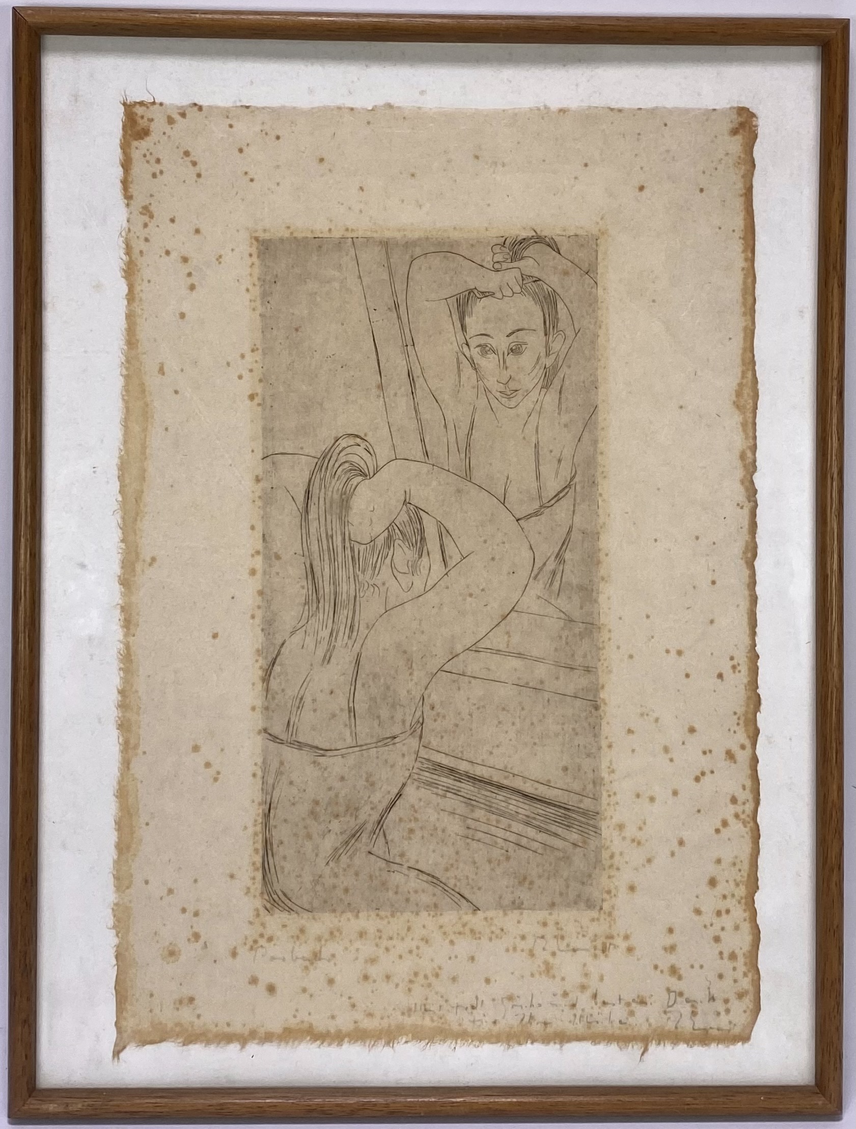 Ets op papier, vrouw voor een spiegel, weergegeven in een pose met fijn lijnenspel en beperkte tonaliteit. De voorstelling toont een achteraanzicht en spiegelbeeld, uitgevoerd in moderne figuratieve stijl. Geen zichtbare signatuur, tweede helft 20e eeuw. Dit ets zelf beoordelen? Je bent welkom op onze kijkdagen op 28, 29 en 30 november! |