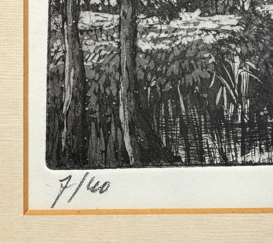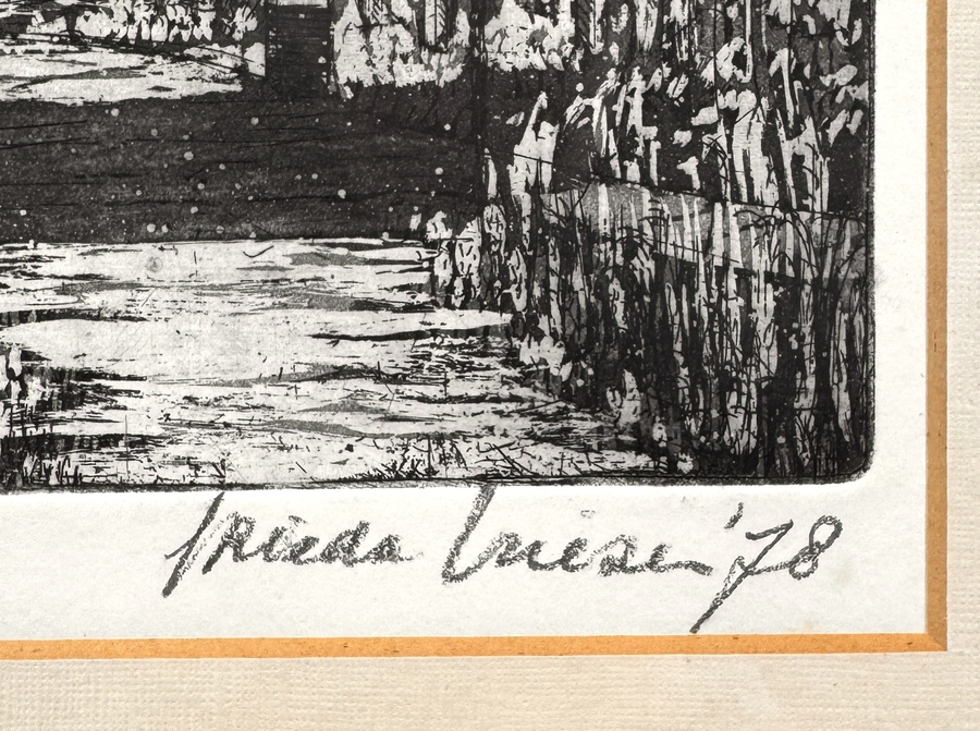 Ets op papier door de Nederlandse graficus Frieda Niezen (echtgenote van J. Jordens), gedateerd 1978. Het realistische werk toont de Allersmaborg bij Ezinge met een poort en bomen, kenmerkend voor haar Groningse stads- en landschapsgezichten. Oplagenummer met potlood linksonder 7/40 en rechtsonder gesigneerd en gedateerd Frieda Niezen ‘78 Geïnteresseerd? Bezoek onze kijkdagen op 28, 29 of 30 november van 11:00 tot 17:00 uur! |