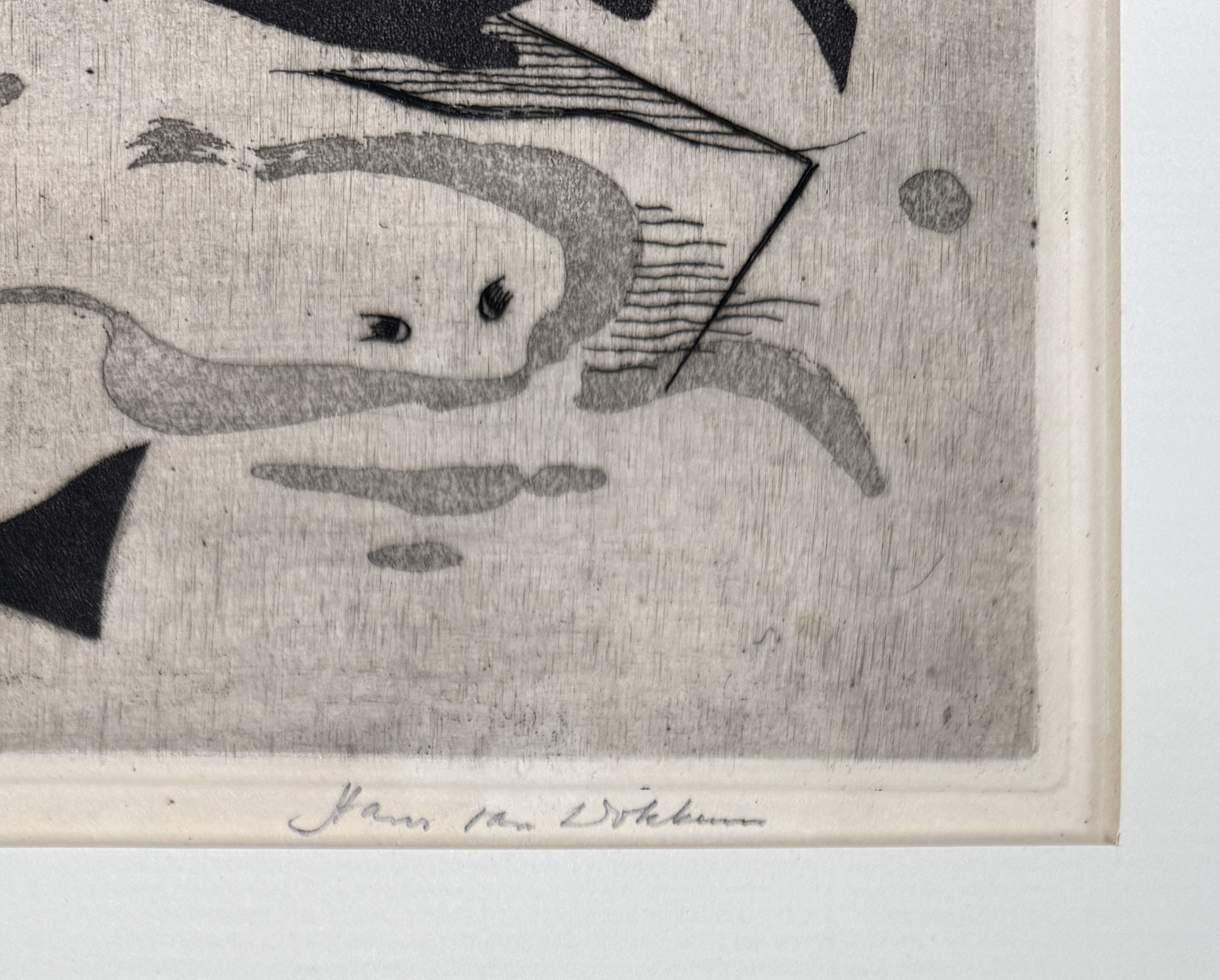 Abstract figuratieve ets op papier door de Nederlandse graficus Hans van Dokkum (1908–1995). Het werk is gesigneerd rechtsonder, vermelding eigen druk linksonder. De compositie uit circa 1950–1970 toont een viscompositie met gestileerde vissen in roodbruin en zwart. Klaar om te bieden? Registreer je nu en doe mee aan de veiling! |
