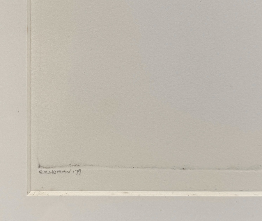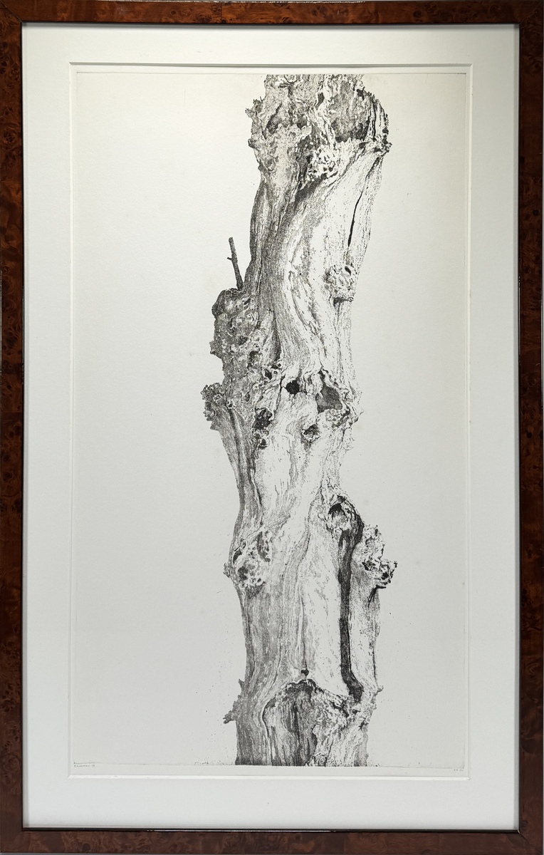 Ets door Reinder Homan (ge1954), uit 1979. Ets op papier met potloodsignatuur linksonder “E.R. Homan ’79” en rechtsonder “e.a. (épreuve d'artiste) 50”. Gedetailleerde weergave van een verweerde boomstam in realistische stijl. Handgedrukt in beperkte oplage. Ingelijst met passe-partout in wortelnotenhouten lijst. Klaar om te bieden? Registreer je nu en doe mee aan de veiling! |