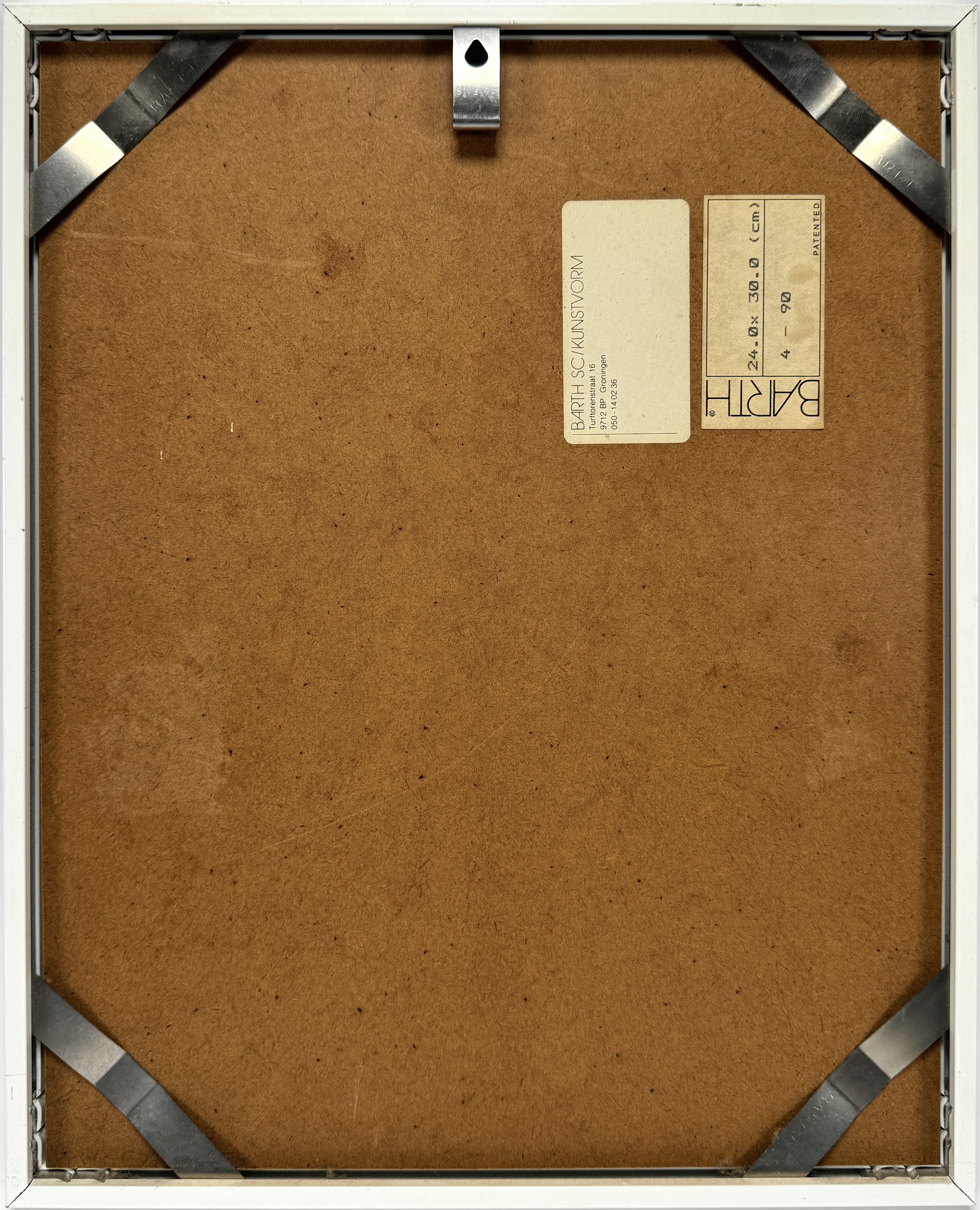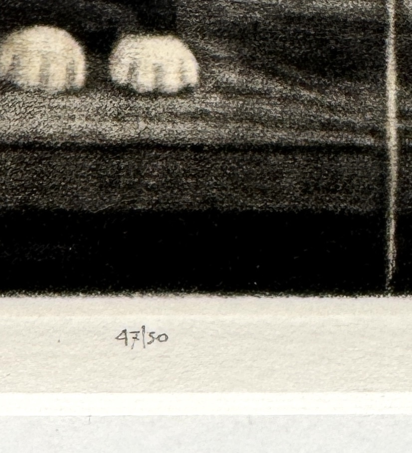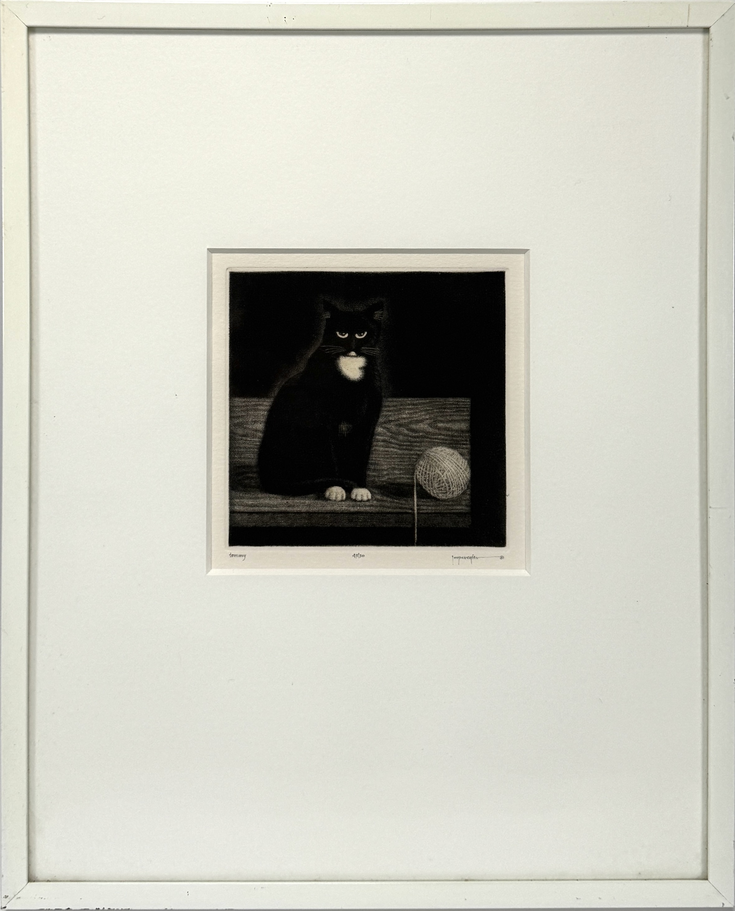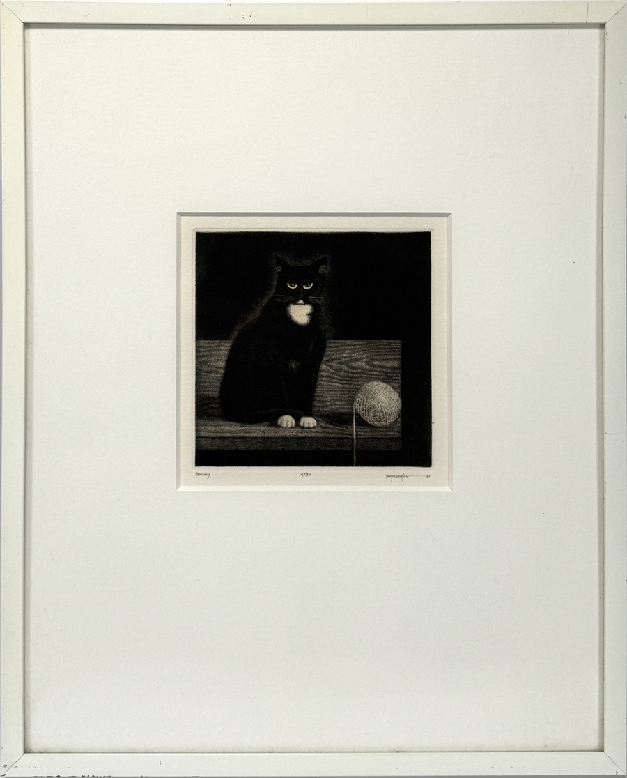 Mezzotint op papier van de Nederlandse kunstenaar Joop Vegter (1931-2017), gesigneerd en gedateerd 1981 rechtsonder. Het werk is getiteld "Tommy" en genummerd 47/50. De hyperrealistische en monochrome voorstelling toont een zwart-witte kat zittend op een bankje, met een bal witte wol ernaast. Kom langs tijdens de kijkdagen (28 t/m 30 november) en ontdek dit prent zelf! |