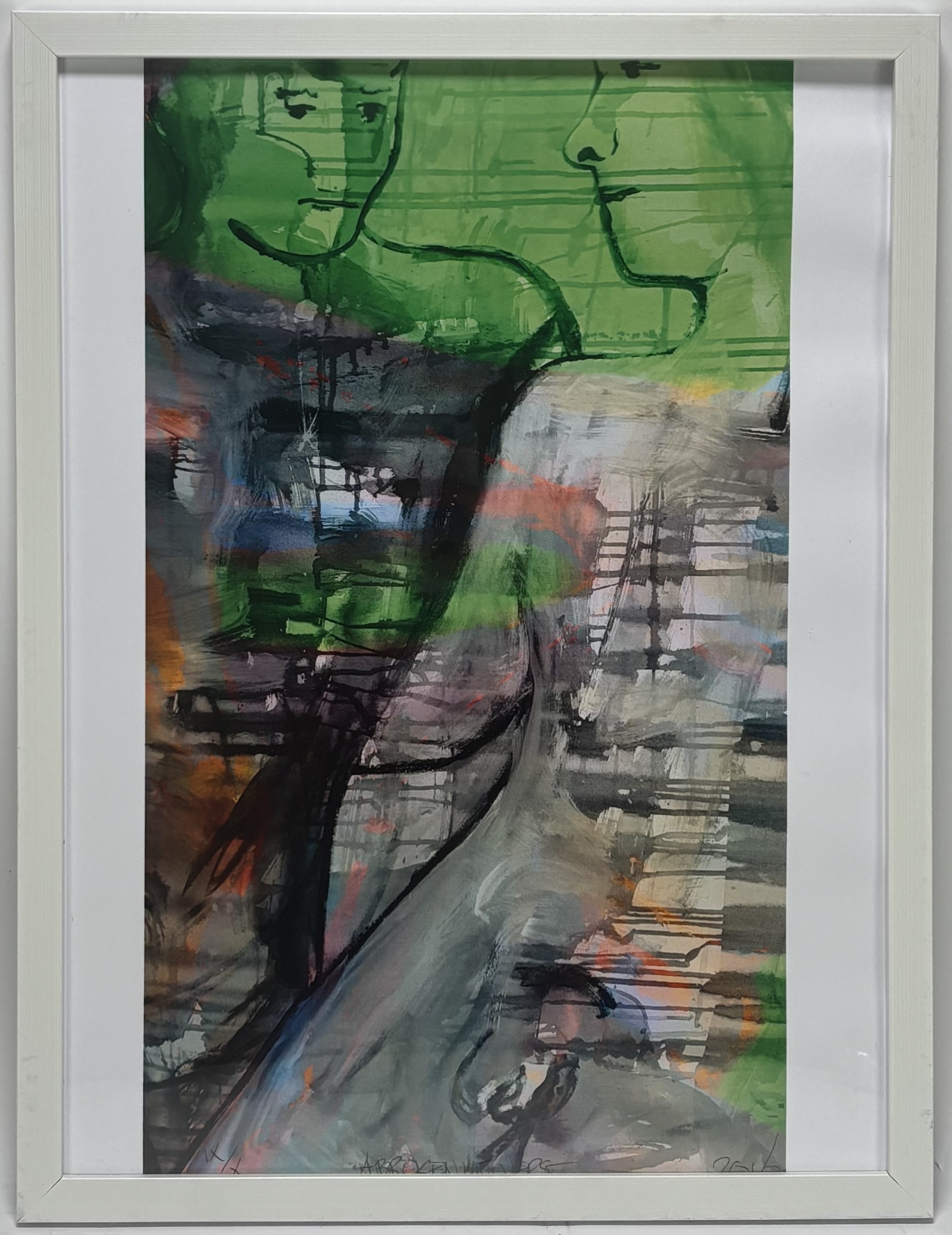 Gemengde techniek op papier, door A BROKEN UNIVERSE (Ecuadoraanse kunstenaar, gevestigd in Nederland), uitgevoerd in expressionistische stijl. De voorstelling toont gestileerde figuren met een sensueel karakter, opgebouwd uit groene, grijze en rode vlakken met krachtige contouren. De voorstelling combineert figuratieve en abstracte elementen en bevindt zich achter glas in een neutrale lijst. Gedateerd 21e eeuw, onder midden gesigneerd. Geïnteresseerd? Bezoek onze kijkdagen op 28, 29 of 30 november van 11:00 tot 17:00 uur! |