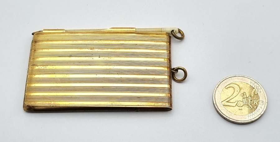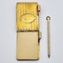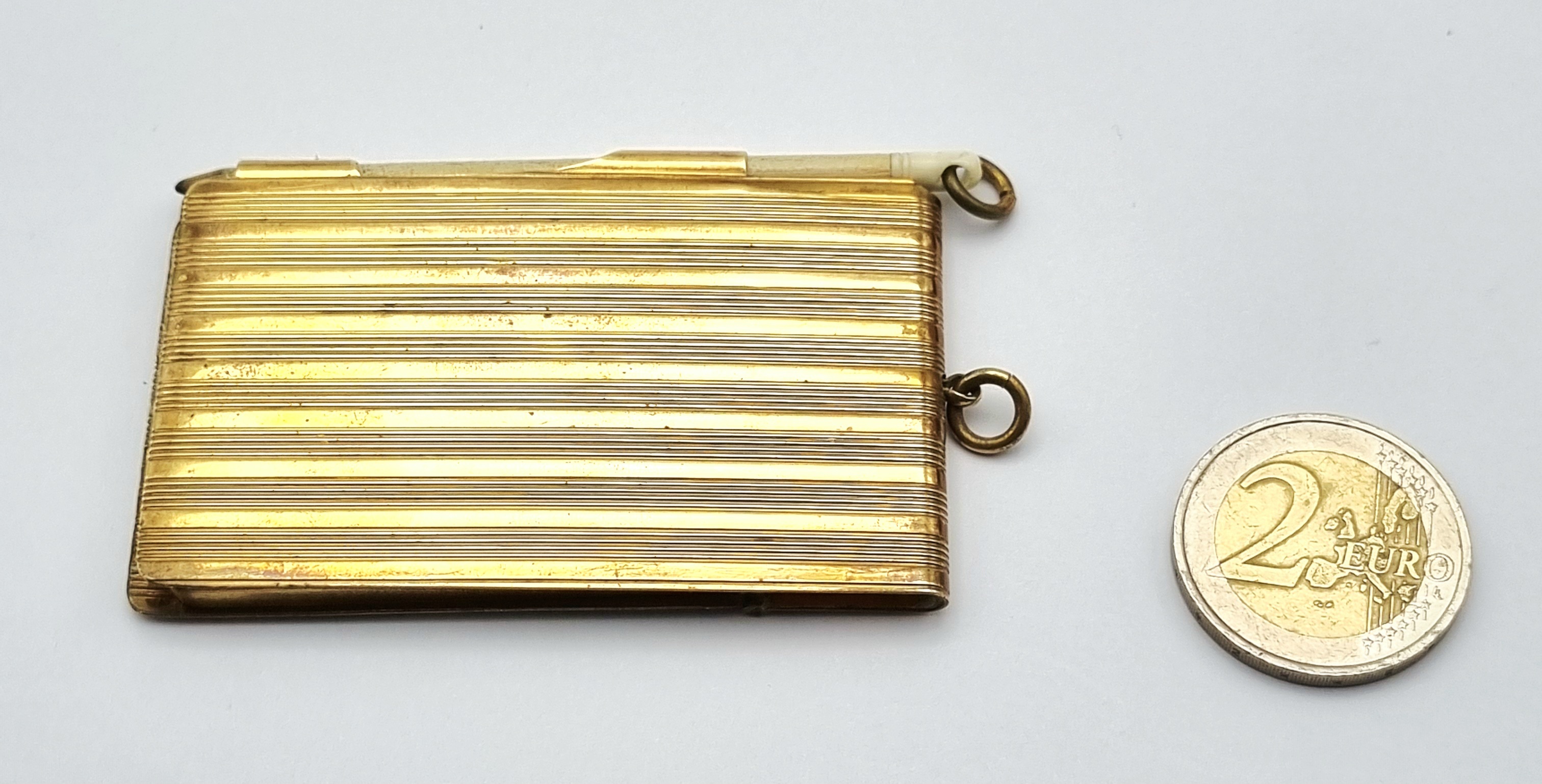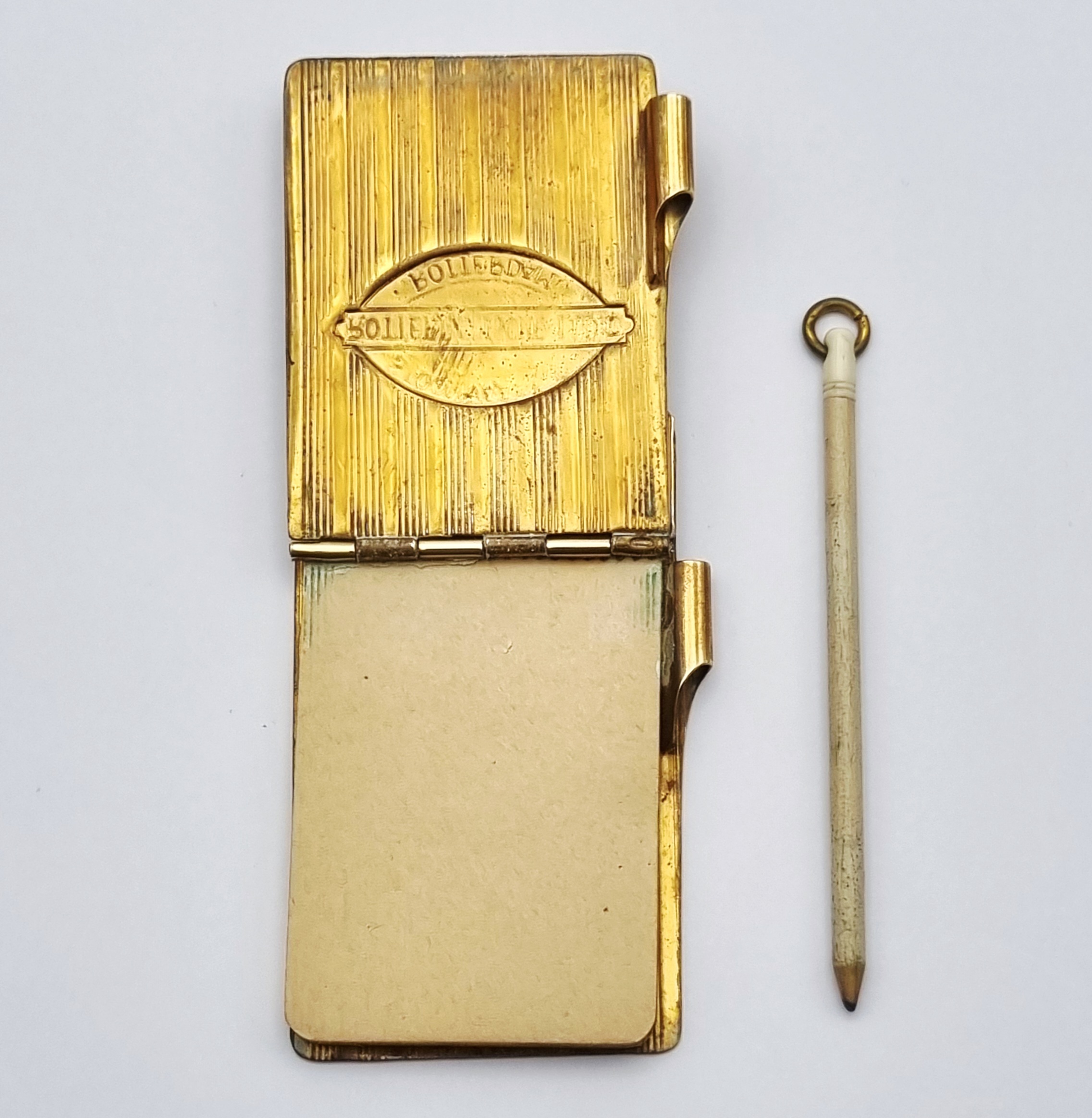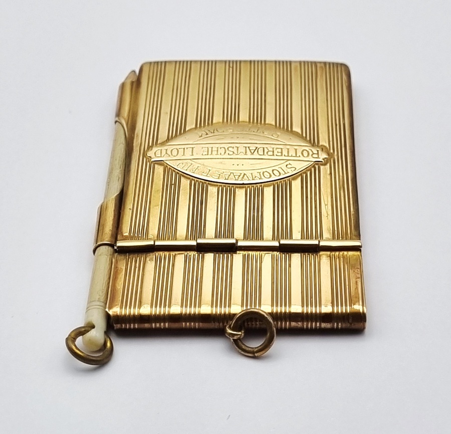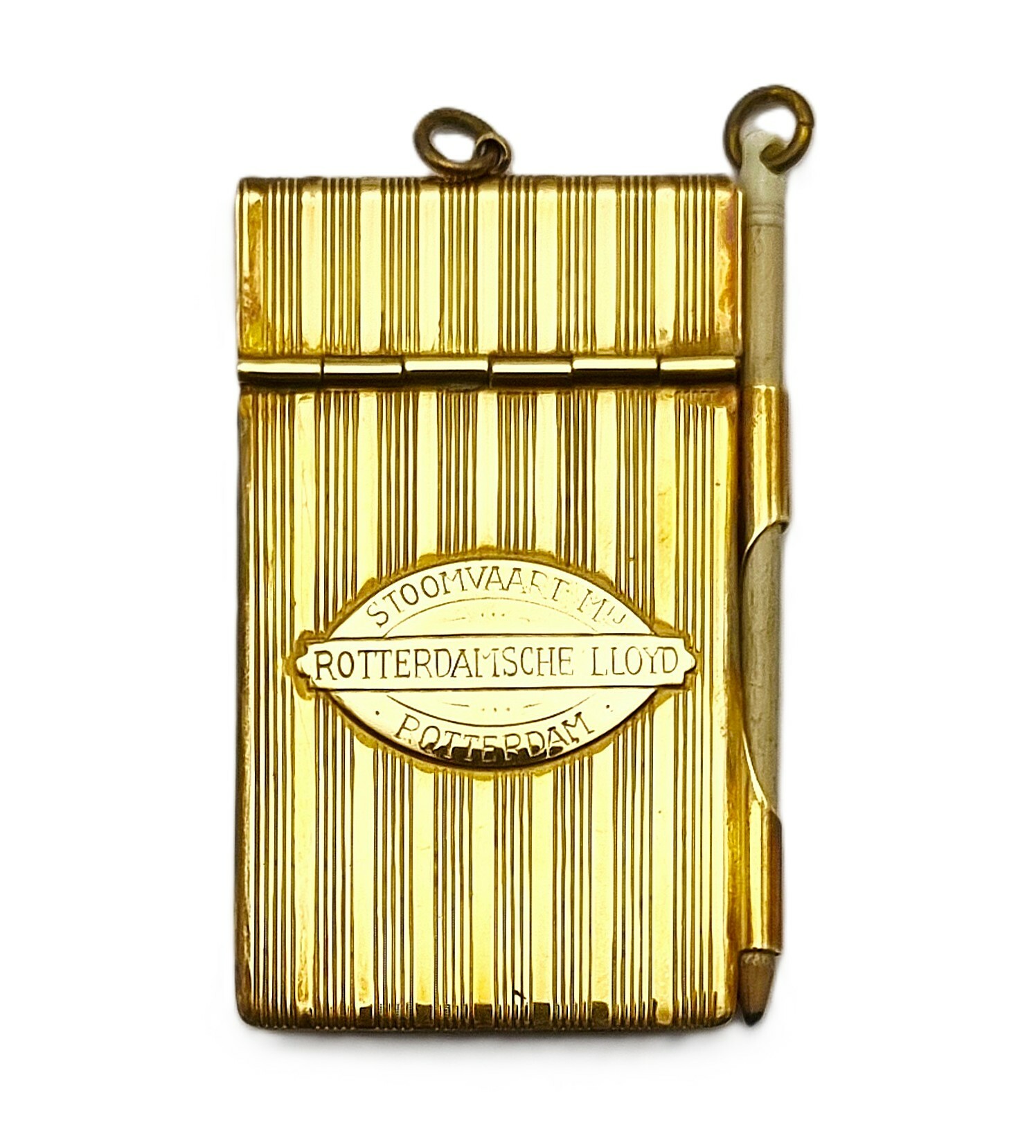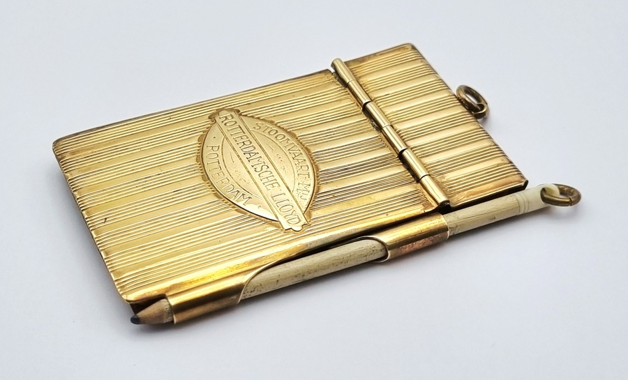 Messing balboekje uitgevoerd in Art Deco uit circa 1920–1935. Het balboekje diende als relatiegeschenk van de Rotterdamsche Lloyd Stoomvaart Maatschappij (RL). De rechthoekige behuizing is gedecoreerd met verticale lijngravures en een ovaal medaillon met de naam van de rederij. Het bevat het originele potlood en een notitieblok. Jouw kans op dit object begint met registreren – bied live of online mee! |