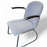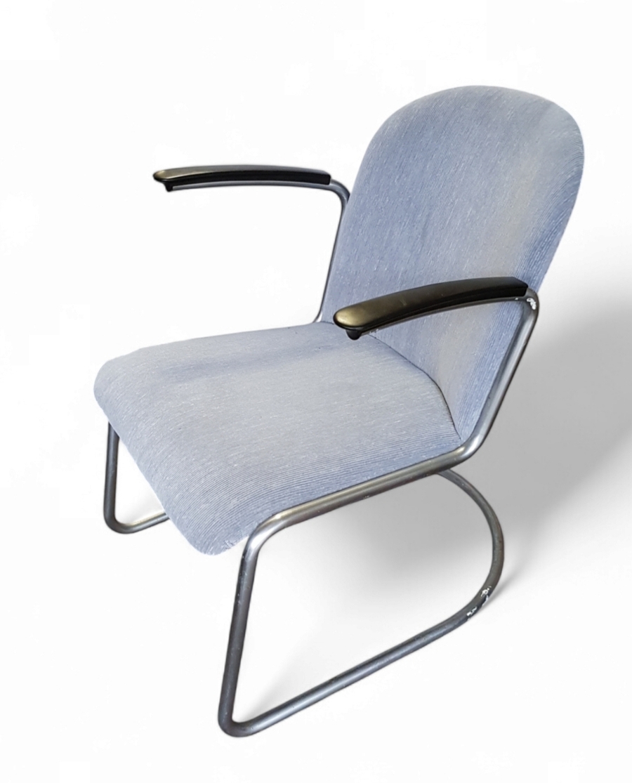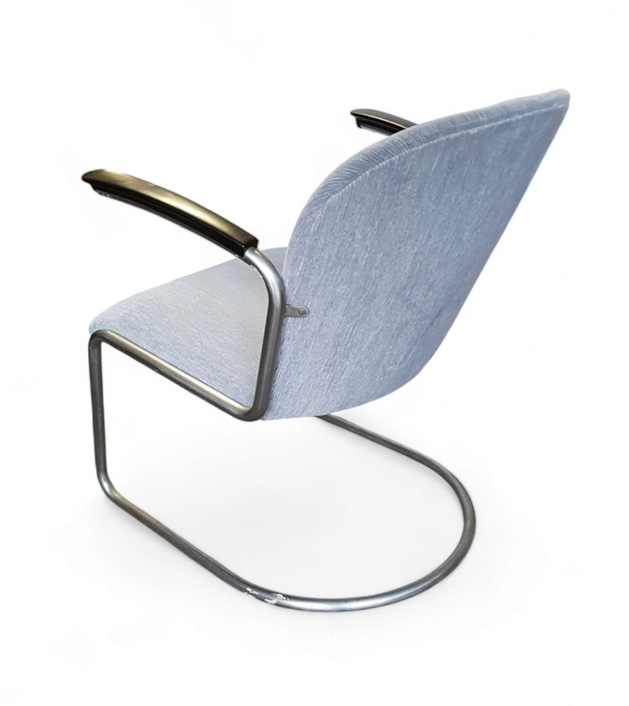 Stoel door de Nederlandse ontwerper Willem Hendrik Gispen (1890–1981), een heruitgave van het model 413R (oorspronkelijk 1935). De constructie bestaat uit een verchroomd stalen buisframe als vrijdragende zitting en voet, zitting en rugleuning zijn bekleed met een lichtblauwe ribstof met donkere bakeliet armleggers. Je bent welkom op onze kijkdagen op 28, 29 en 30 november! |