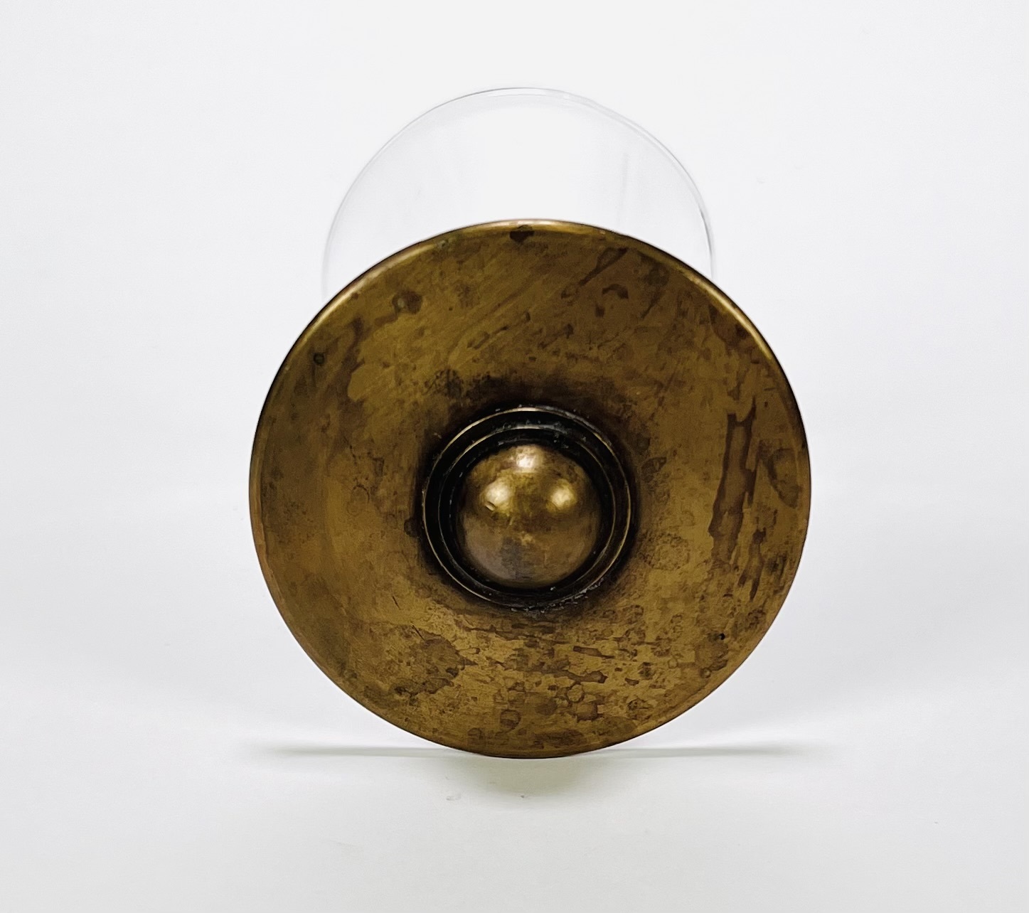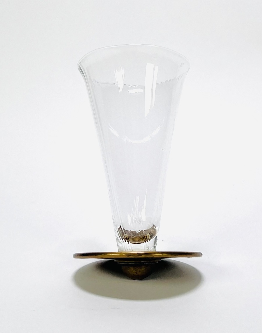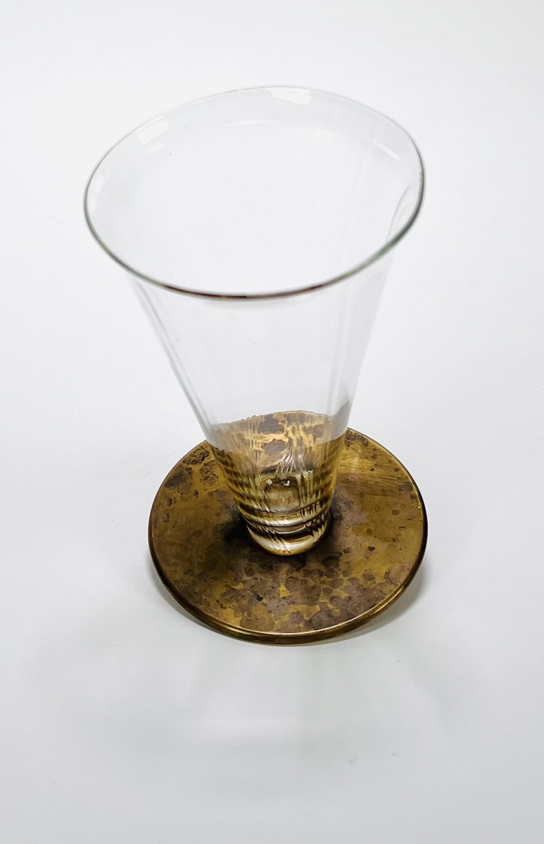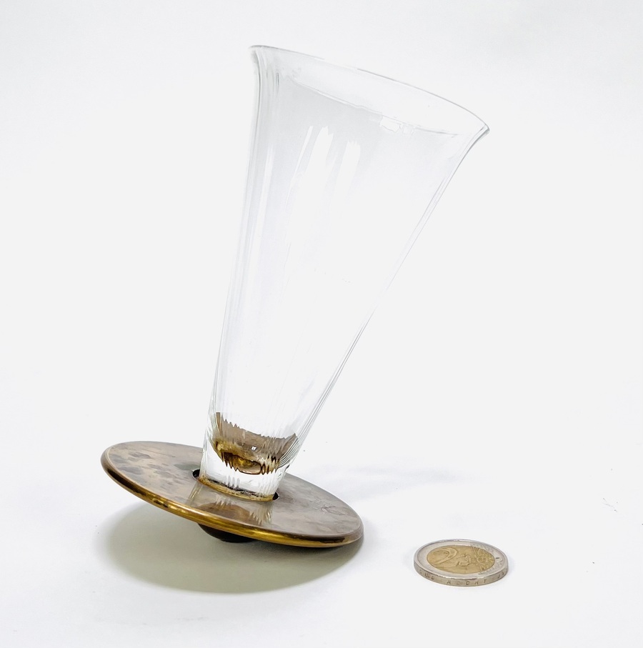 Tuimelglas naar een ontwerp van Bořek Šípek (1949–2016), uitgevoerd in postmodern design, ca. 1985–1995. Het glas combineert een mondgeblazen glazen beker met een brede, ongepolijste messing voet, waardoor de beker in een permanente schuine positie staat. Wil je dit glas in het echt bekijken? Kom naar de kijkdagen op 28, 29 en 30 november! |
