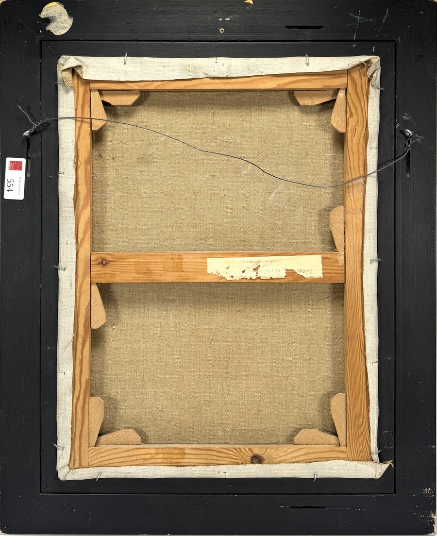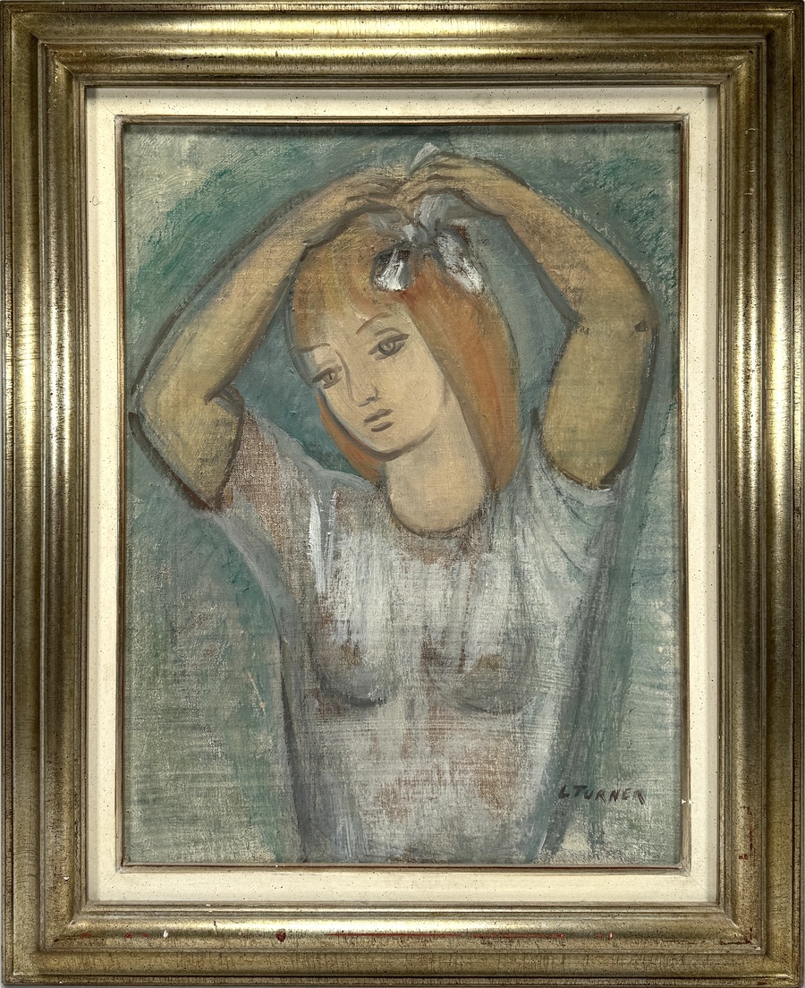 Olieverfschilderij op doek door L. Turner, uitgevoerd in een figuratief modernistische stijl, ca. 1940–1960. De voorstelling betreft een gestileerde vrouwenportret met roodblond haar die een strik vastmaakt met haar handen boven het hoofd. Linksonder gesigneerd. Kom langs tijdens de kijkdagen (28 t/m 30 november) en ontdek dit schilderij zelf! |