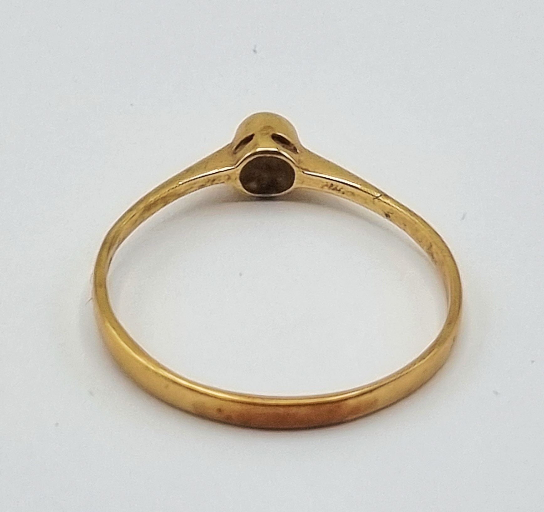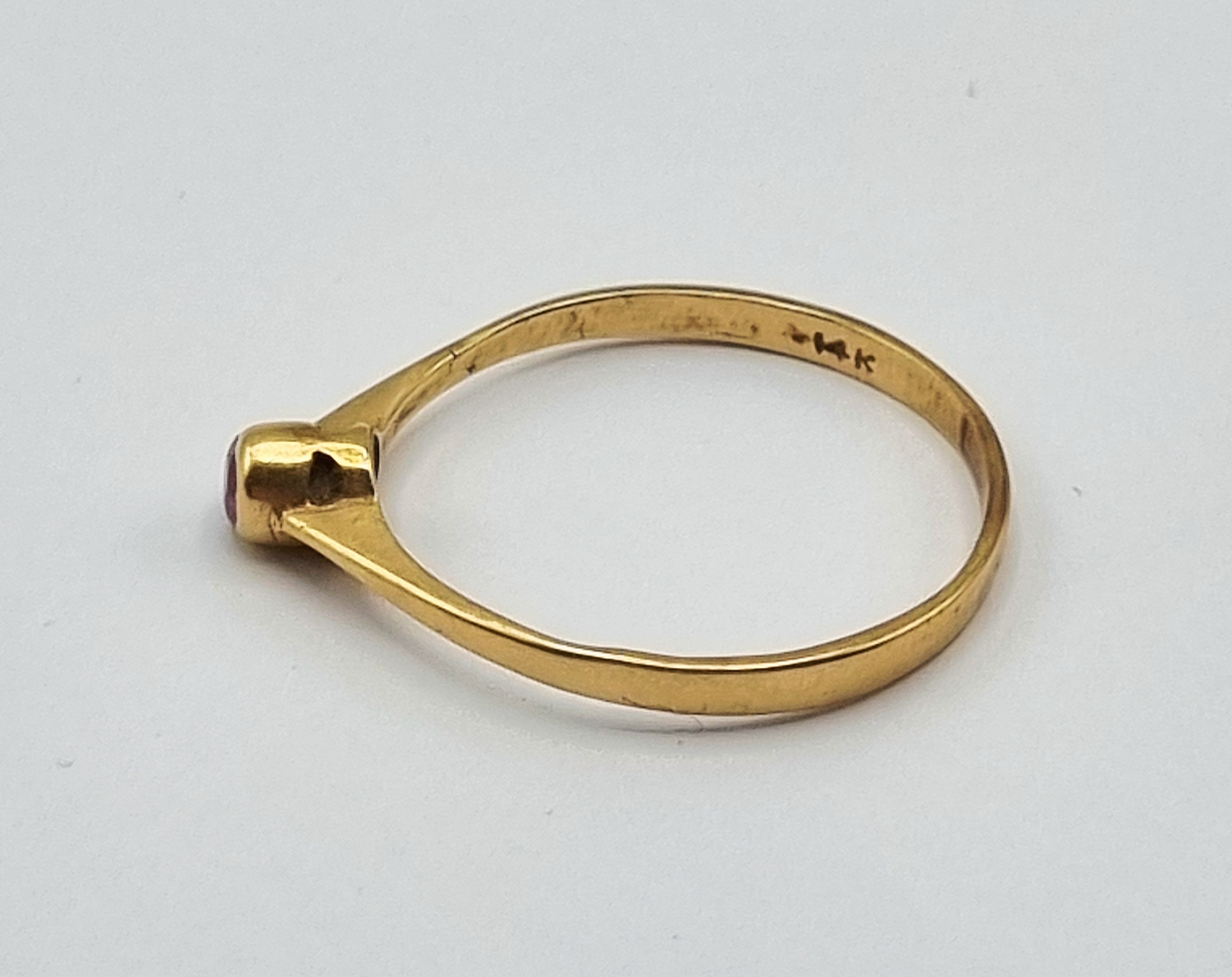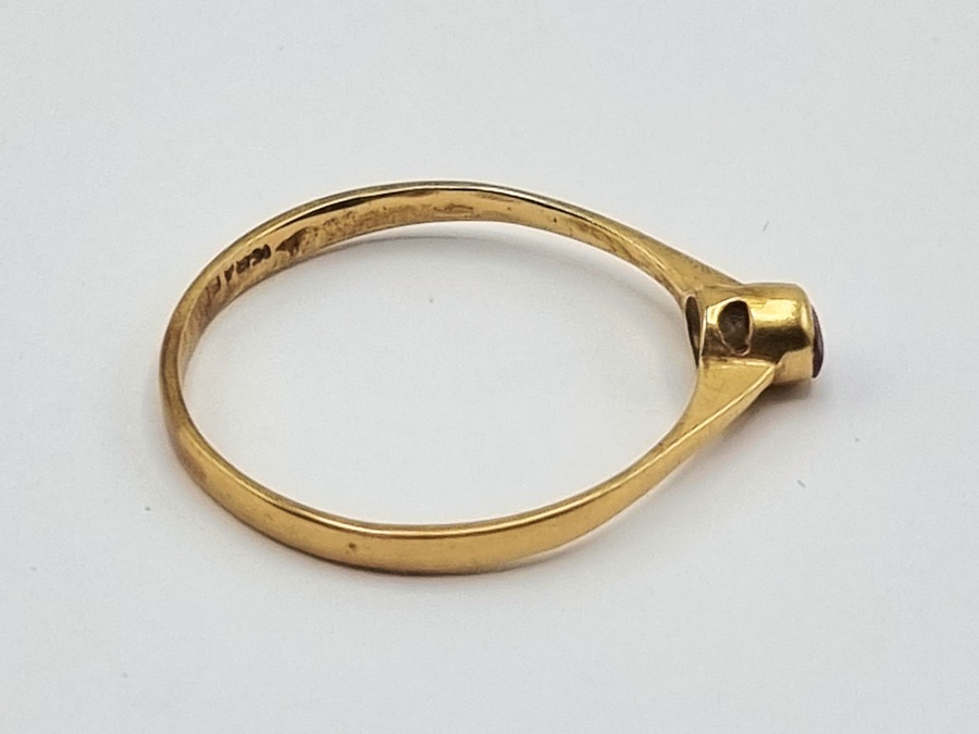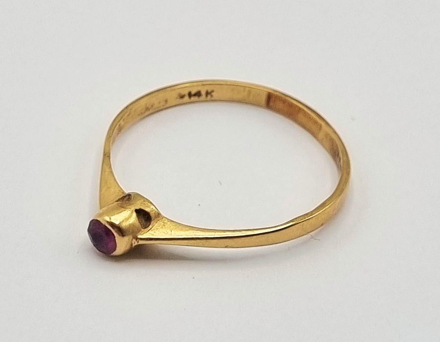 Gouden solitaire ring van 14 karaat (585/1000) in minimalistische stijl, daterend uit de eerste helft 20e eeuw, ca. 1920–1950. De slanke band loopt taps toe naar de centrale bezelzetting van een kleine, donkerrode granaat. De ring is van oorsprong Europees en gemerkt met 14K. Klaar om te bieden? Registreer je nu en doe mee aan de veiling! |