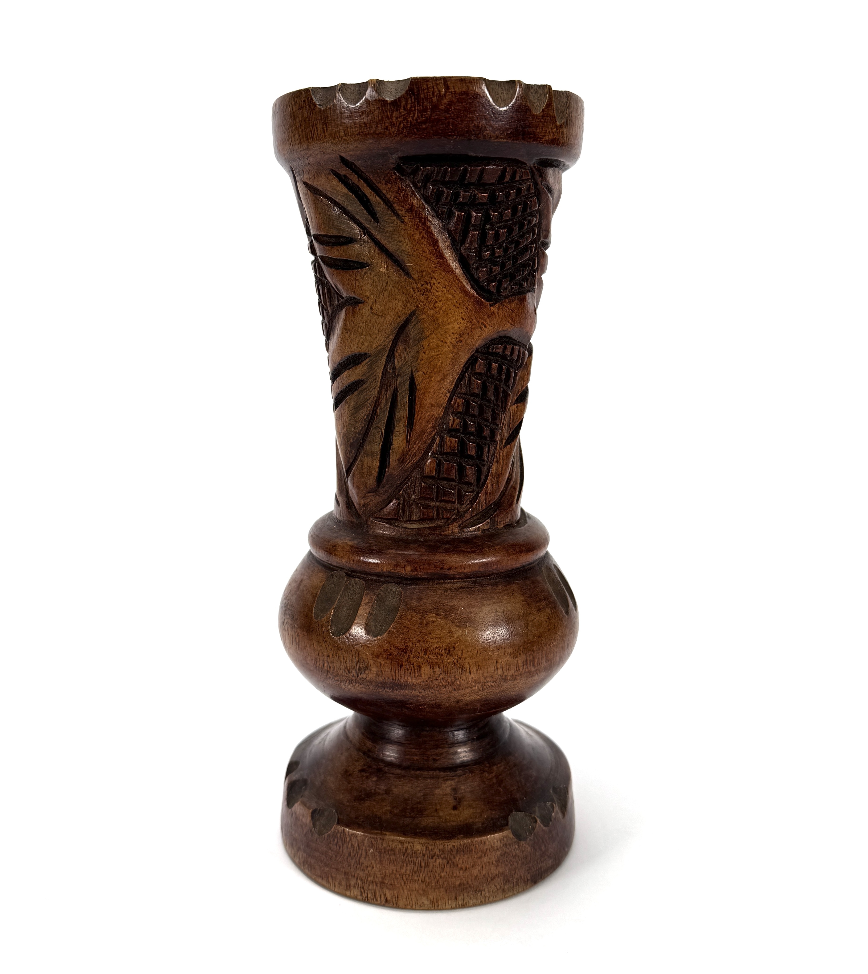 Houten vaas met vogel- en bloemmotief, Suriname