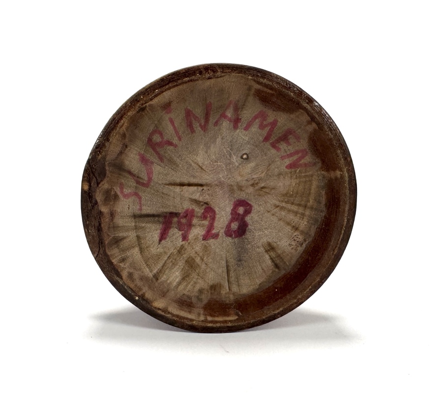 Traditionele houten vaas van donker hardhout, gesneden en gegraveerd uit Suriname. De vaas is op de onderzijde handgeschreven gedateerd op 1928. De stijl is etnografisch en decoratief, met een symmetrische vorm op een voetstuk. De hals is rijkelijk versierd met diep uitgesneden geometrische motieven, waaronder een gekruist patroon en gestileerde vogel- of bladvormen. Ontdek dit vaas en voeg het toe aan jouw collectie! Registreer nu voor de veiling. |