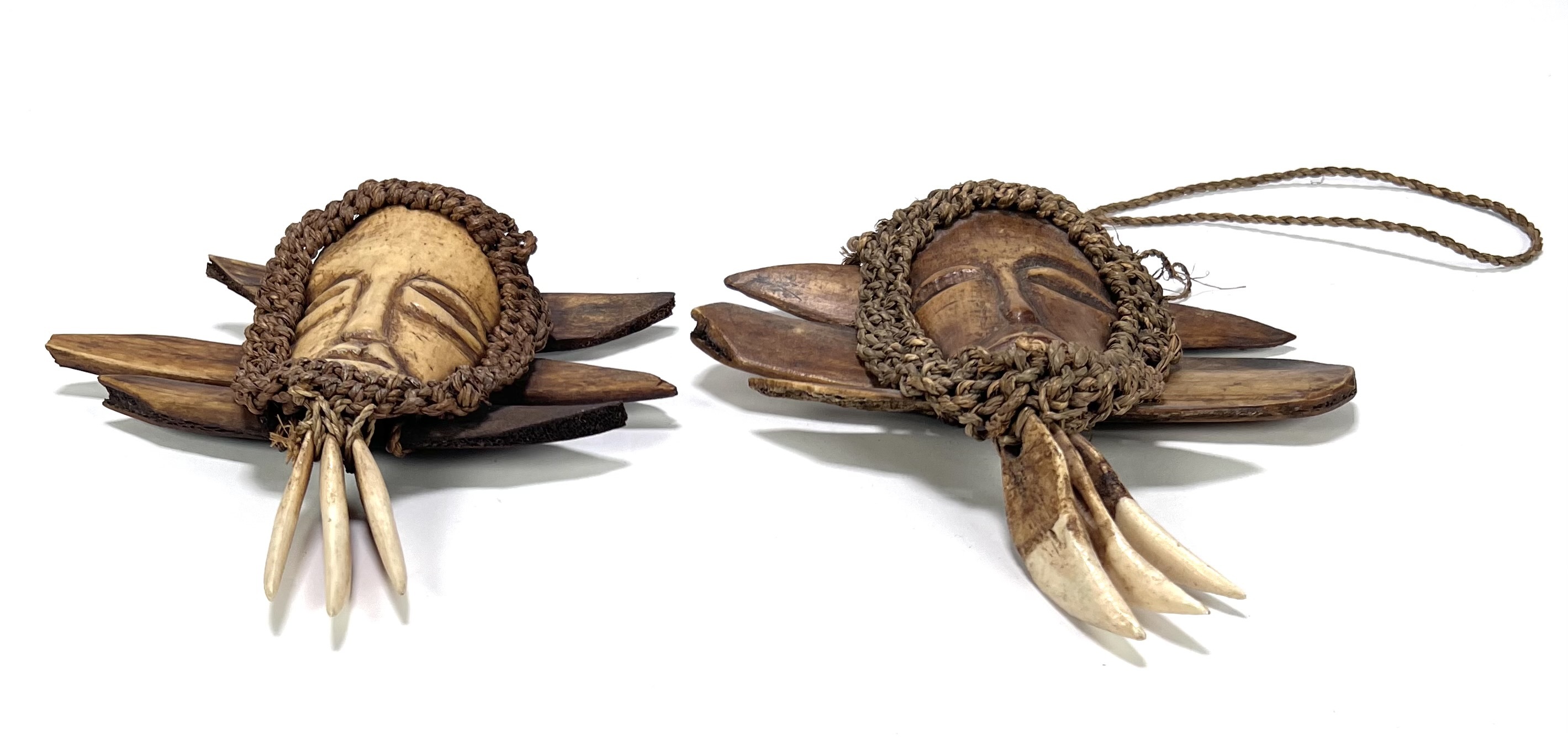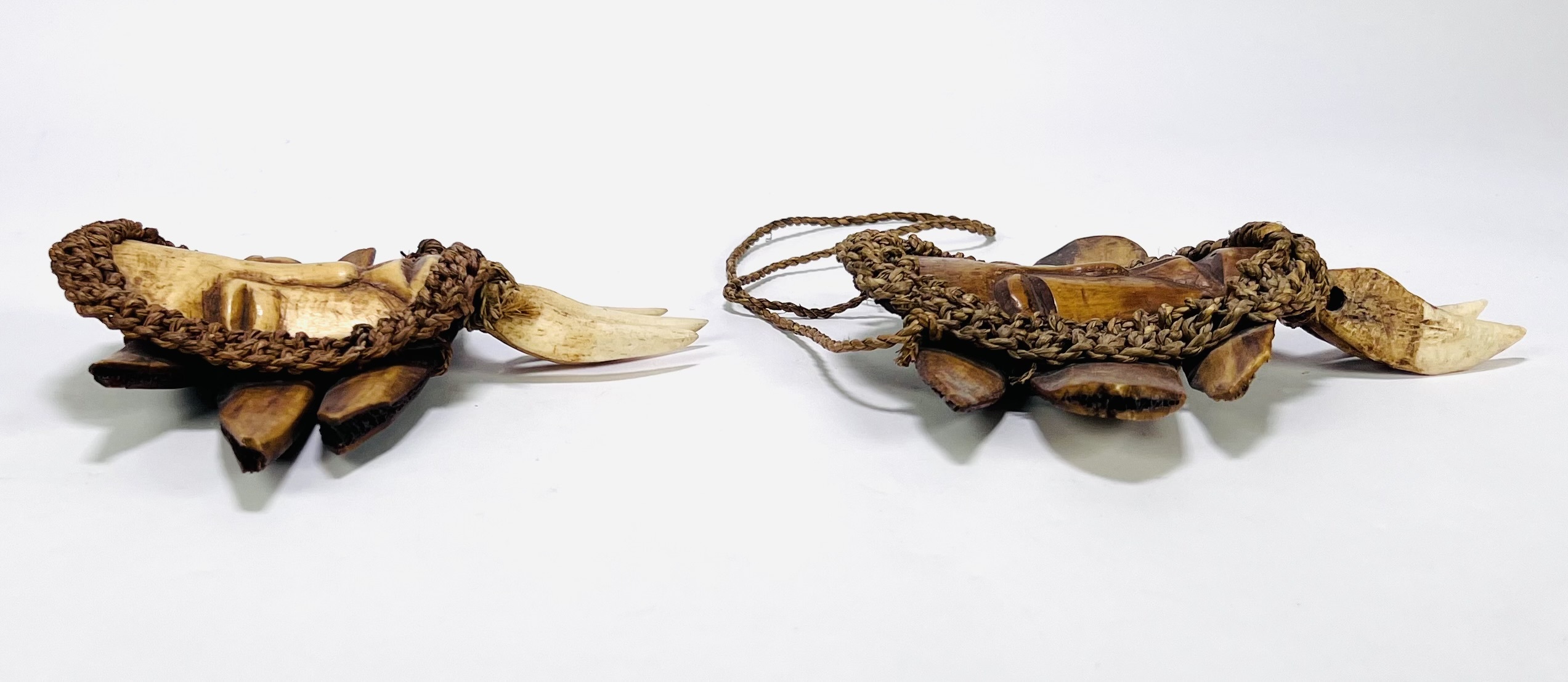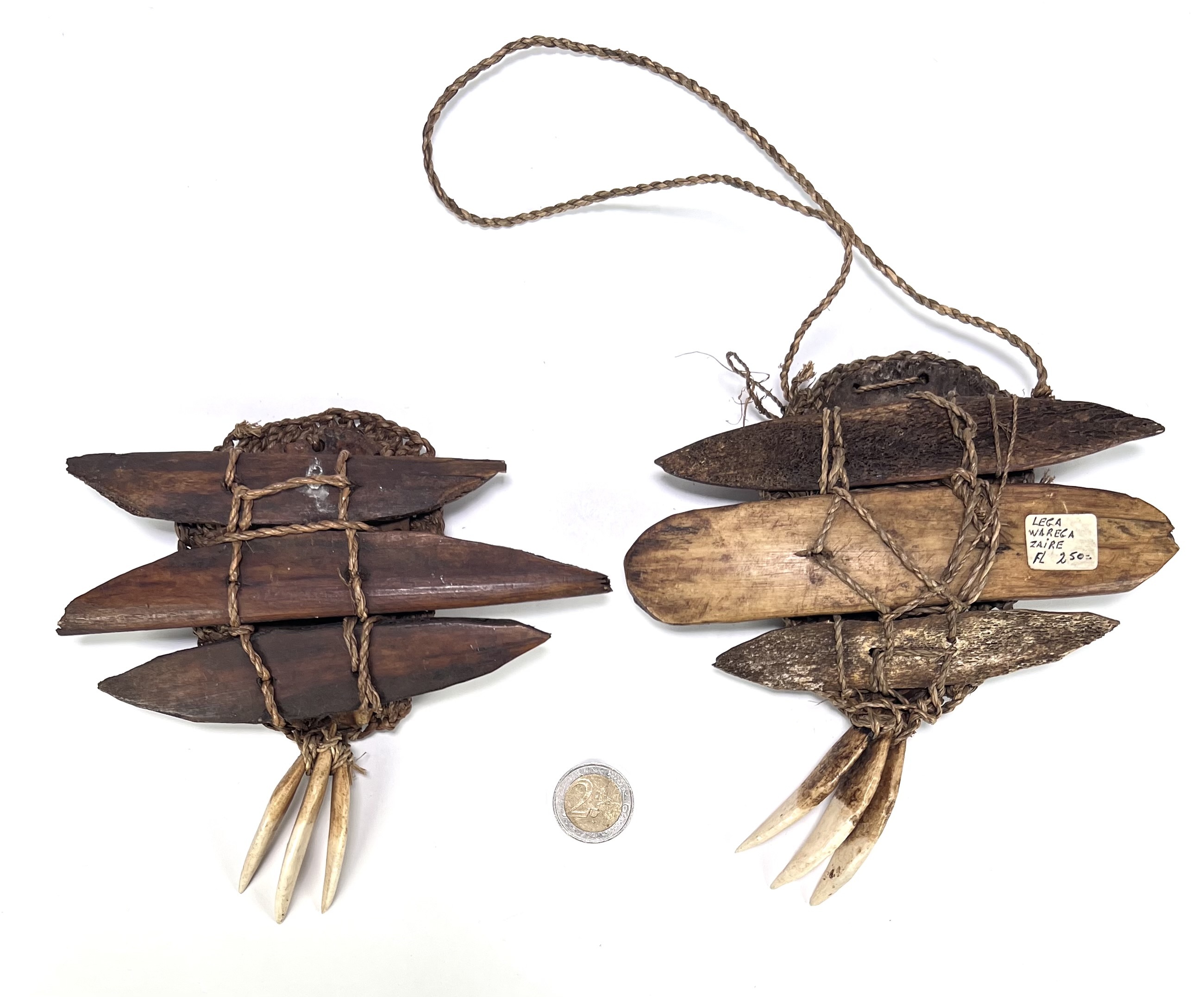 Twee kleine ceremoniële amuletten van de Lega, Democratische Republiek Congo, 20e eeuw. Gesneden uit been, voorzien van gevlochten plantaardige vezels. Deze draagbare amuletten werden gebruikt als symbolen van morele en sociale rang. Kom langs tijdens de kijkdagen (28 t/m 30 november) en ontdek deze maskers zelf! |
