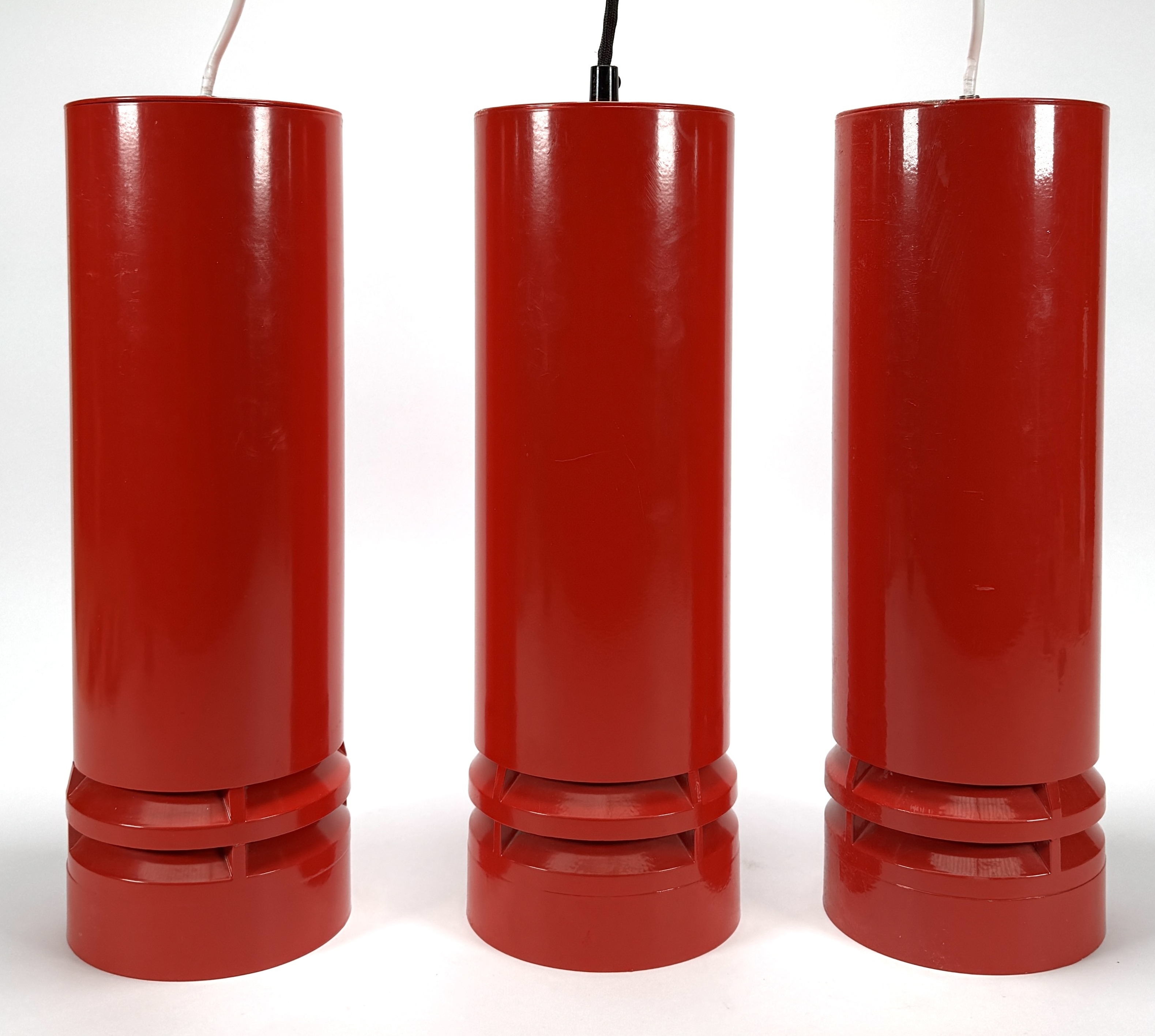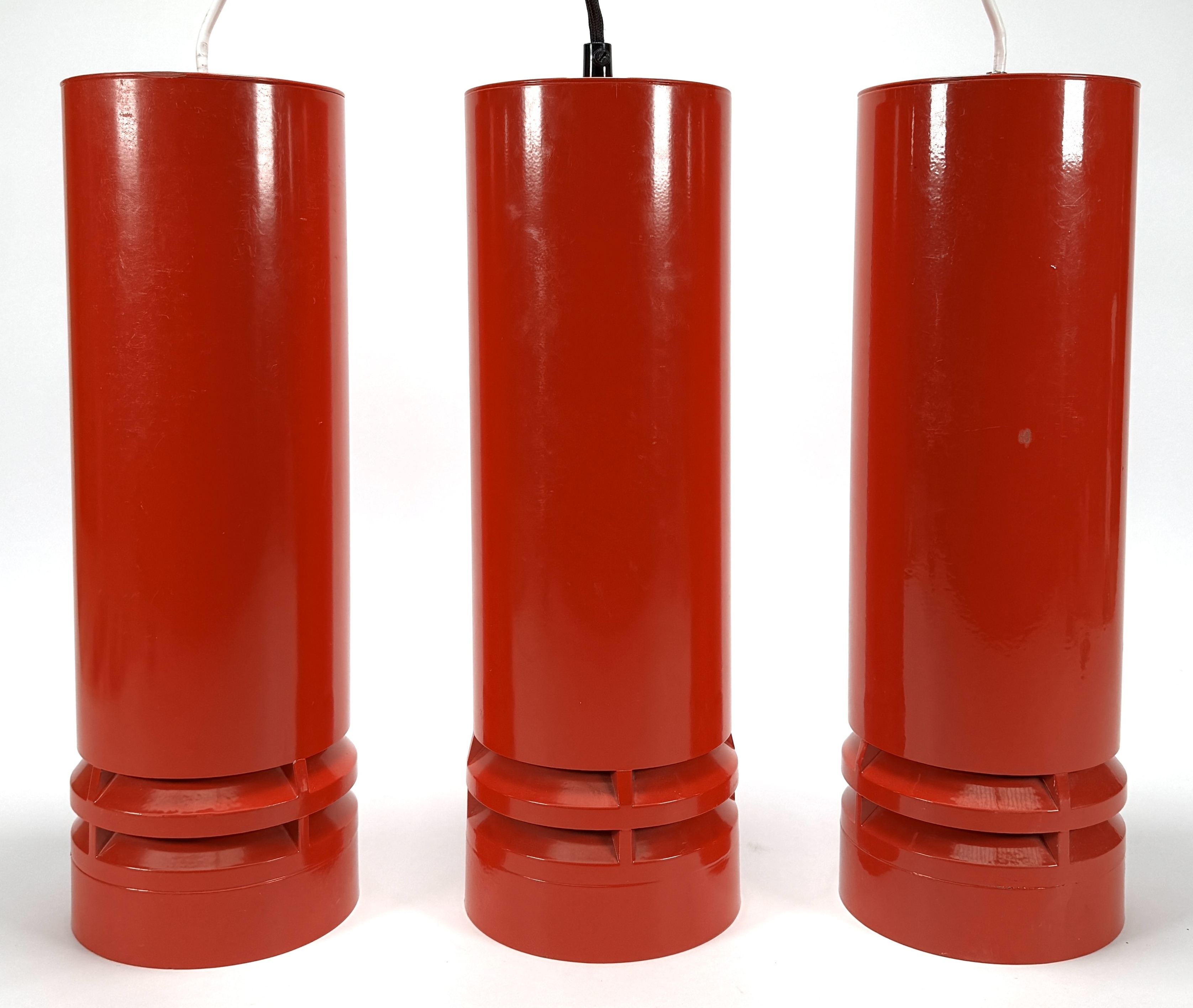 Drie Deense hanglampen, model "Pipeline P10", ontworpen door Ole Pless Jørgensen en vervaardigd uit rood, gelakt metaal en kunststof. De lampen, daterend uit de jaren 1970, zijn cilindrisch van vorm en kenmerkend voor de Scandinavische Mid-century modern stijl. De onderzijde is voorzien van drie decoratieve, geribbelde schijven voor een functionele, binnenzijde voorzien van een modelsticker. Klaar om te bieden? Registreer je nu en doe mee aan de veiling! |