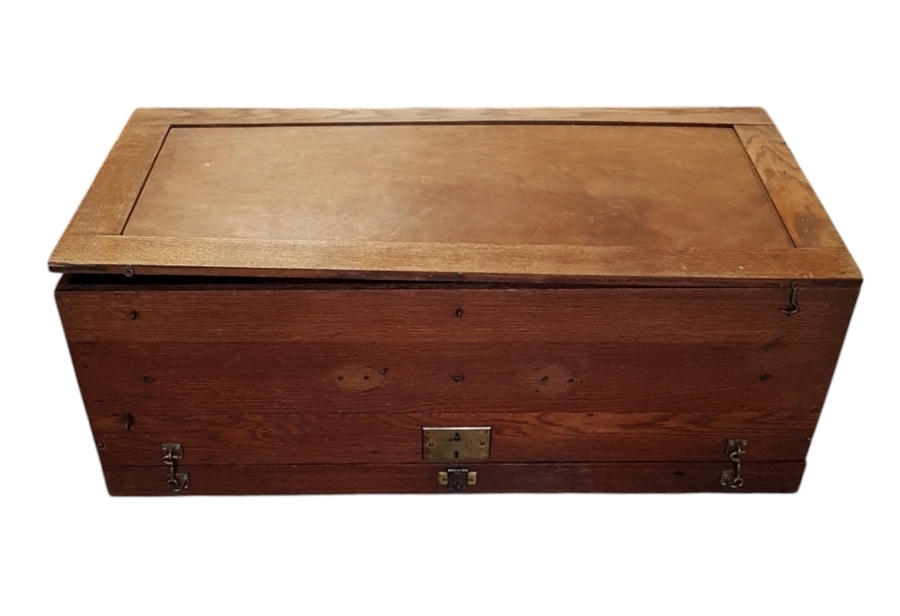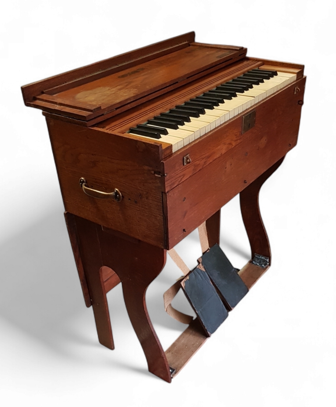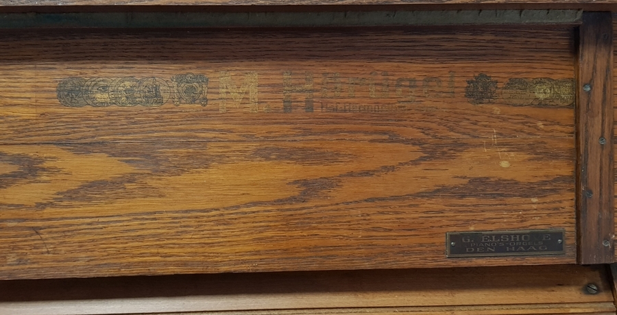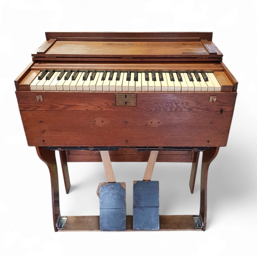 Inklapbare zuigwindharmonium uit de periode circa 1890–1910, vervaardigd van eikenhout met messing beslag. De constructie van de kast met inklapbare poten en balgpedalen is kenmerkend voor een mobiel reisinstrument. Het instrument is gemaakt door de Duitse fabrikant M. Hörügel Hof-Harmonium (Leipzig) en gedistribueerd door G. Elshove uit Den Haag. Registreer nu en bied eenvoudig online mee op dit instrument! |