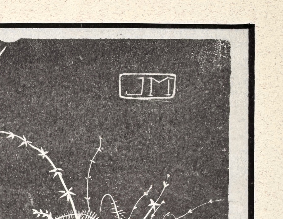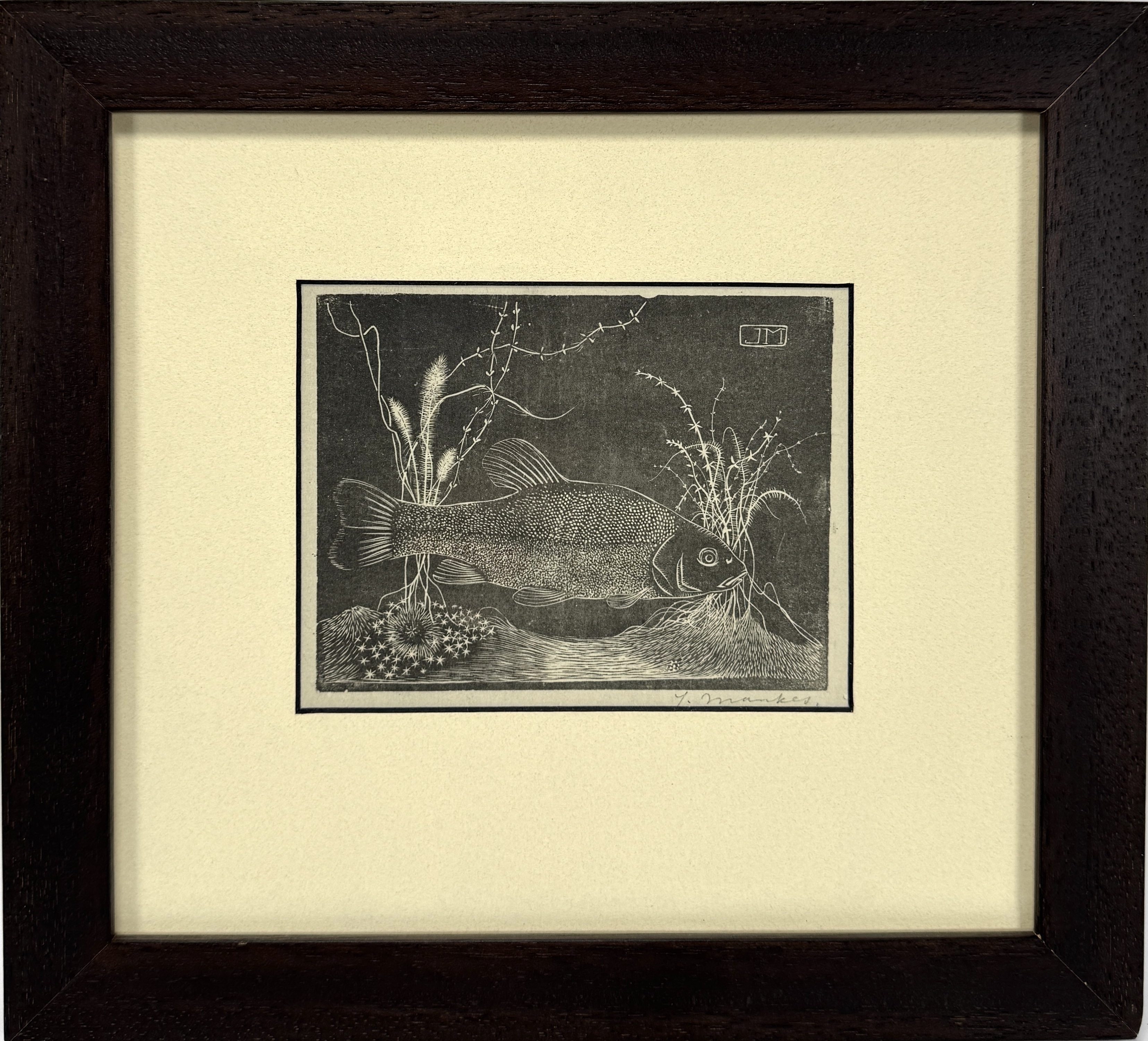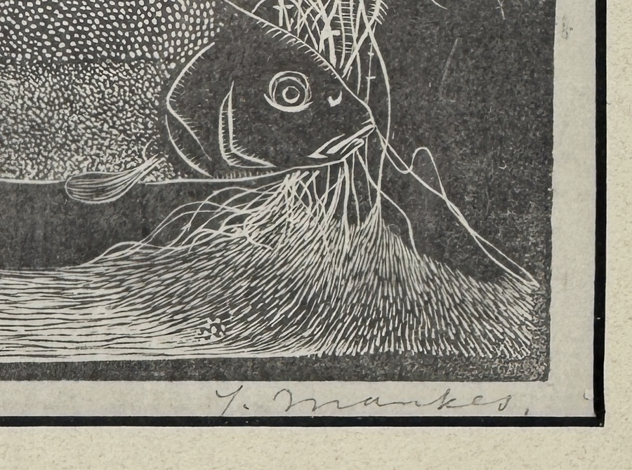 Deze houtsnede op papier van een zeelt, postume druk Jan Mankes (1889–1920). Het werk toont een gedetailleerde weergave van een vis in een onderwaterlandschap. De oorspronkelijke houtsnede is gemaakt in 1917, deze houtsnede is gedrukt in 1927. De grafiek uit Nederlandse herkomst is rechtsonder gesigneerd en rechtsboven gemonogrammeerd. De houtsnede bevindt zich in een strakke, donkere houten lijst. Niet geïnspecteerd buiten de lijst. Wil je direct deelnemen? Plaats vanaf 21 november alvast een schriftelijk bod via onze website! |