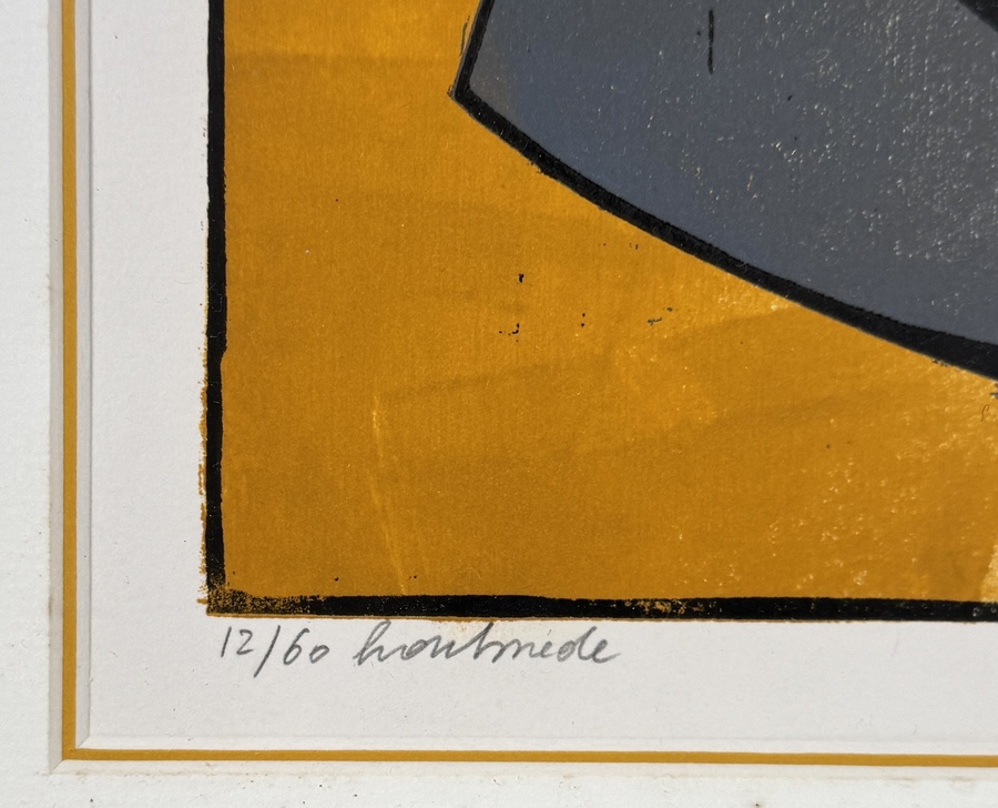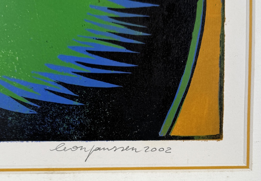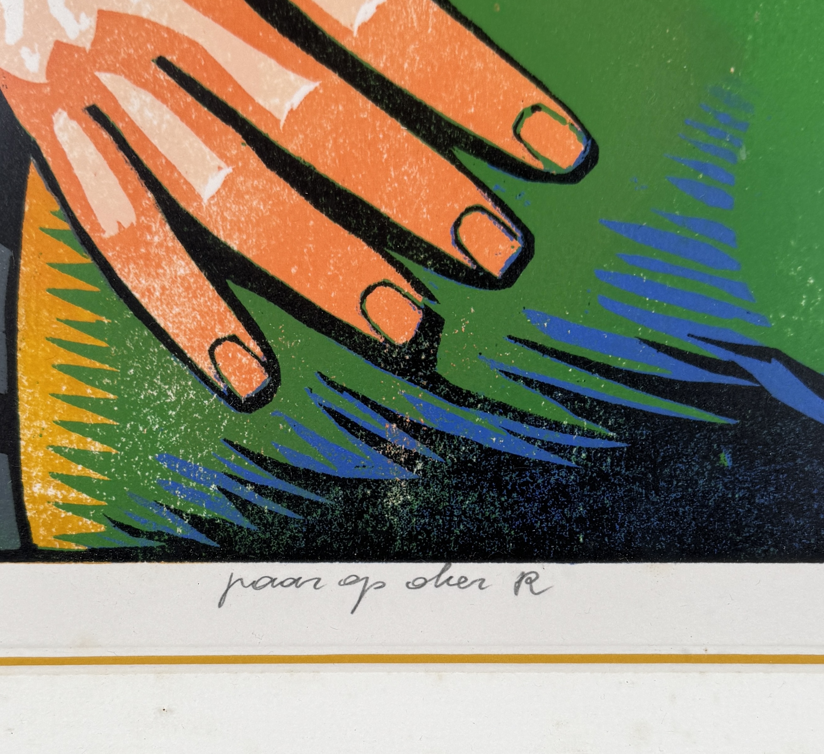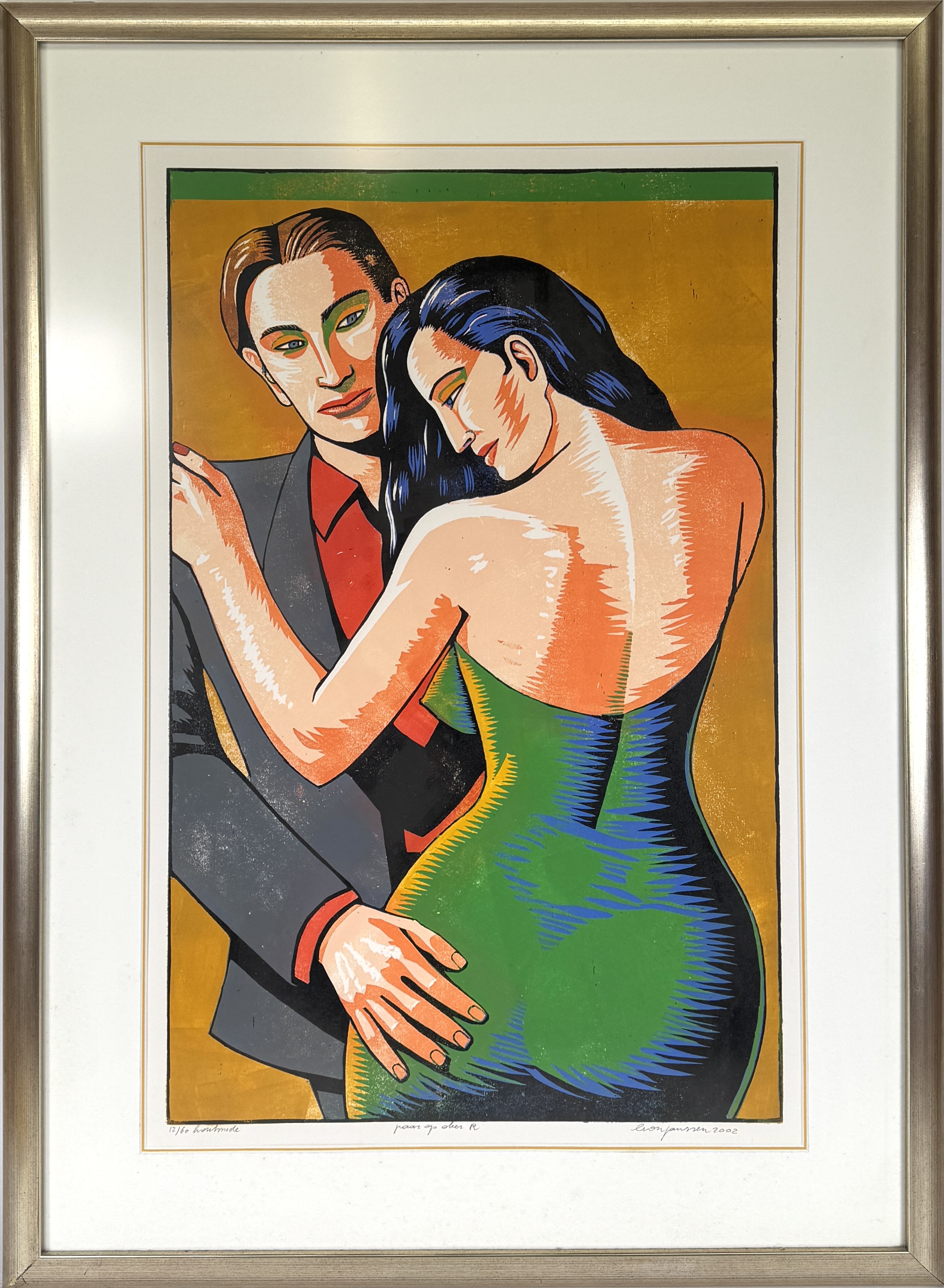 Houtsnede op papier door Leon Janssen (1951), getiteld “Paar op oker R”, gesigneerd in potlood rechtsonder en gedateerd 2002, linksonder oplagenummer 12/60. In kleur gedrukt met expressieve vlakken in geel, groen, blauw en zwart. Voorstelling van een man en vrouw in omarming, uitgevoerd in gestileerde modernistische stijl. Voeg deze houtsnede toe aan je verzameling en doe een bod! |