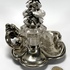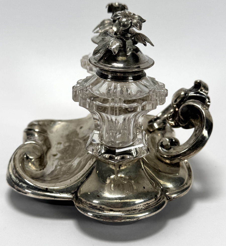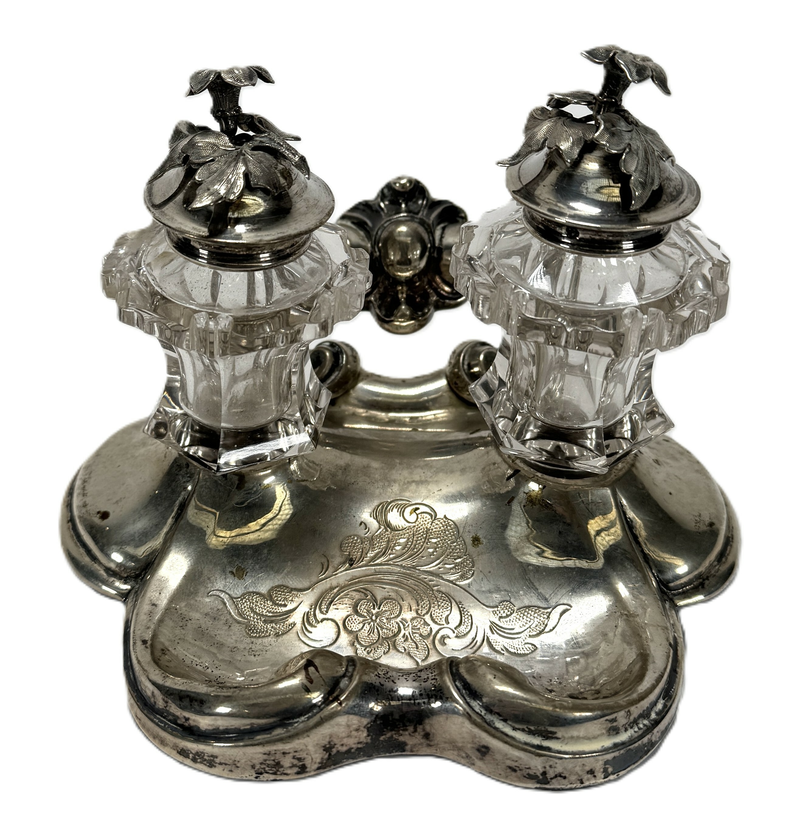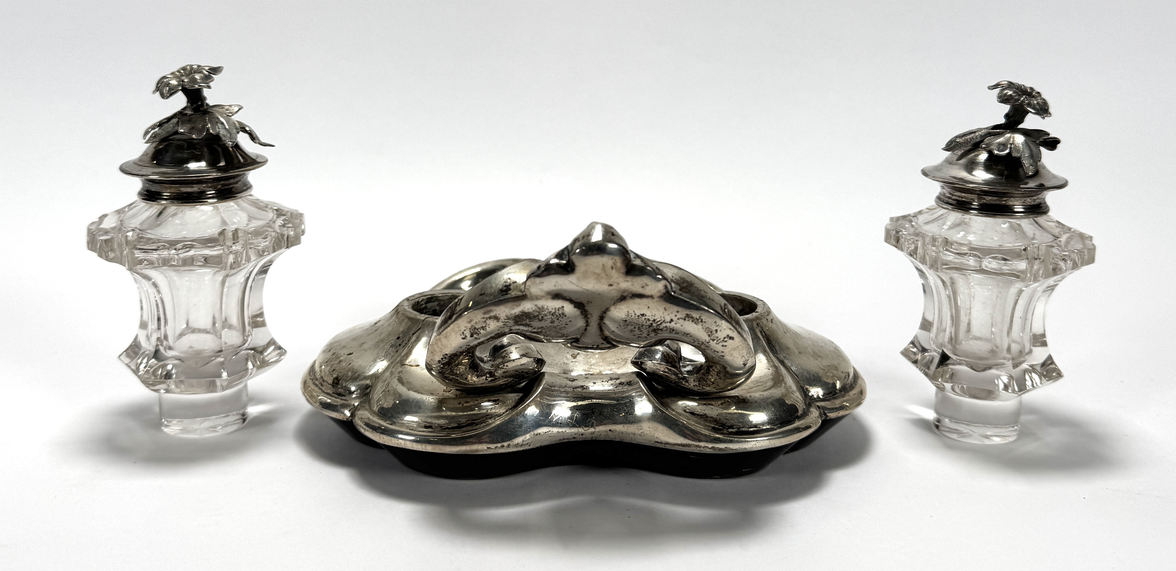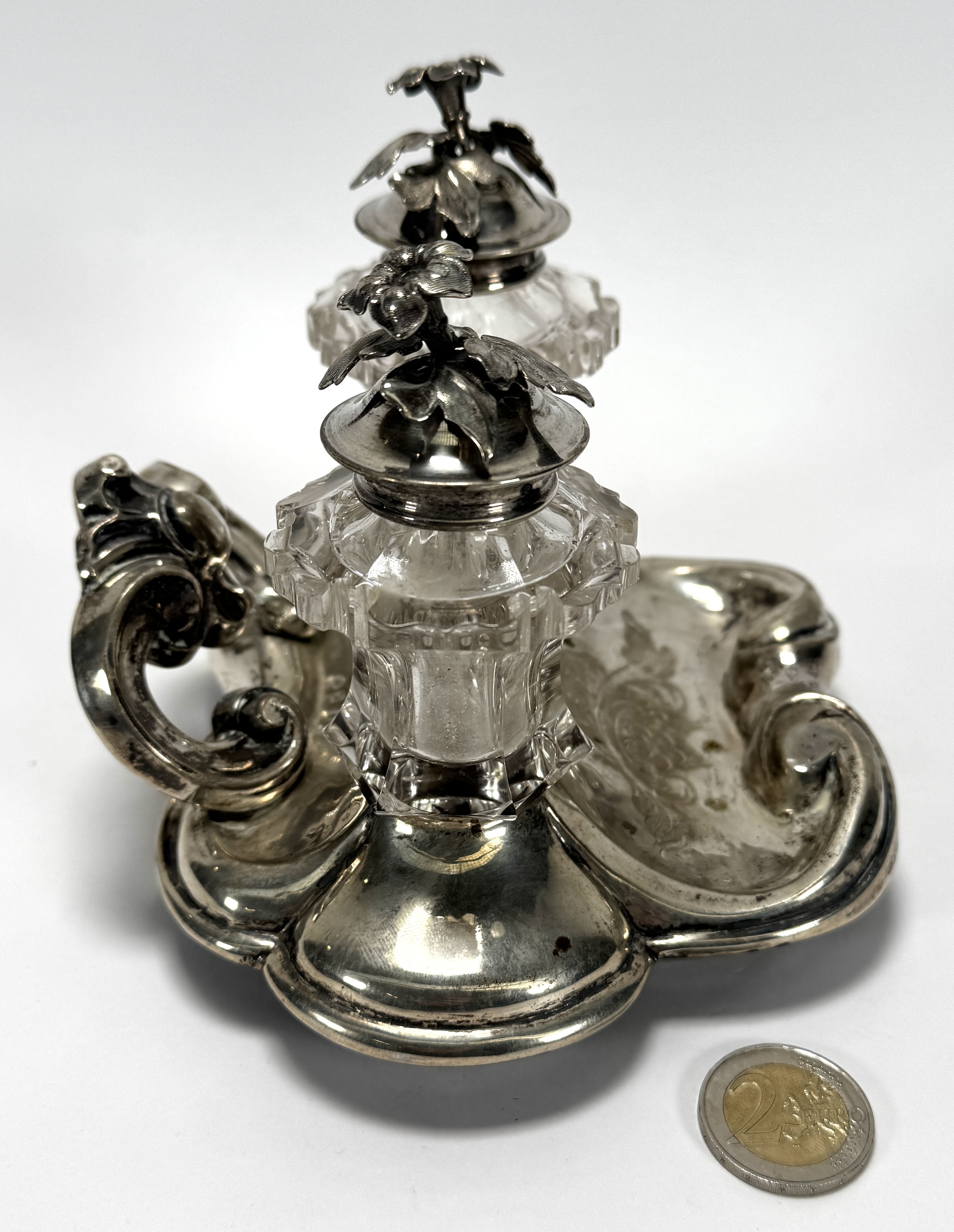 Inktstel, vervaardigd uit zilver en geslepen glas, in de rococo revival stijl. De set dateert uit de tweede helft 19e eeuw. De zilveren basis heeft golvende vormen en is gegraveerd met florale motieven. Twee gefacetteerde glazen houders met zilveren bloem knop deksels staan op de basis in een symmetrische opstelling. Klaar om te bieden? Registreer je nu en doe mee aan de veiling! |