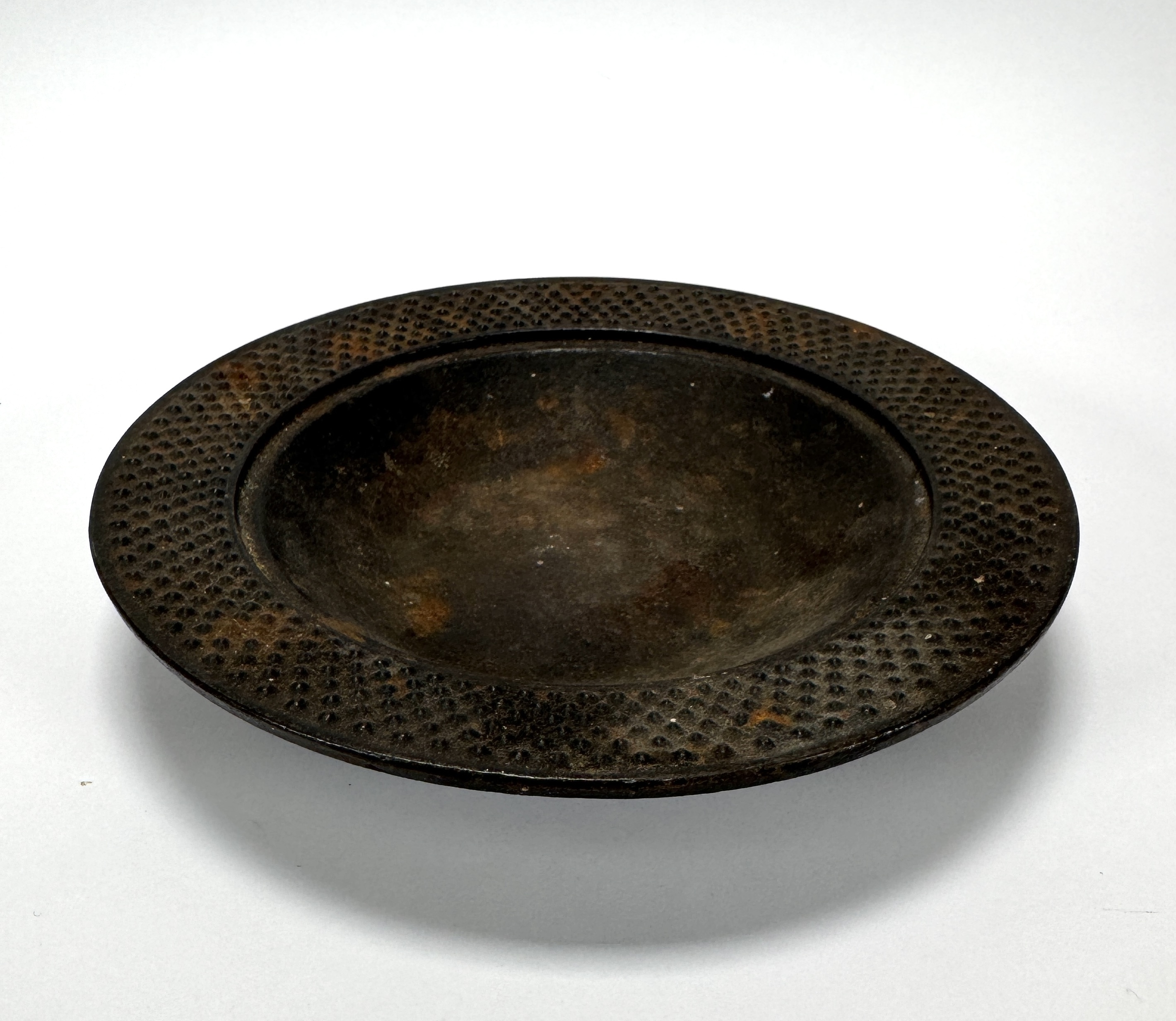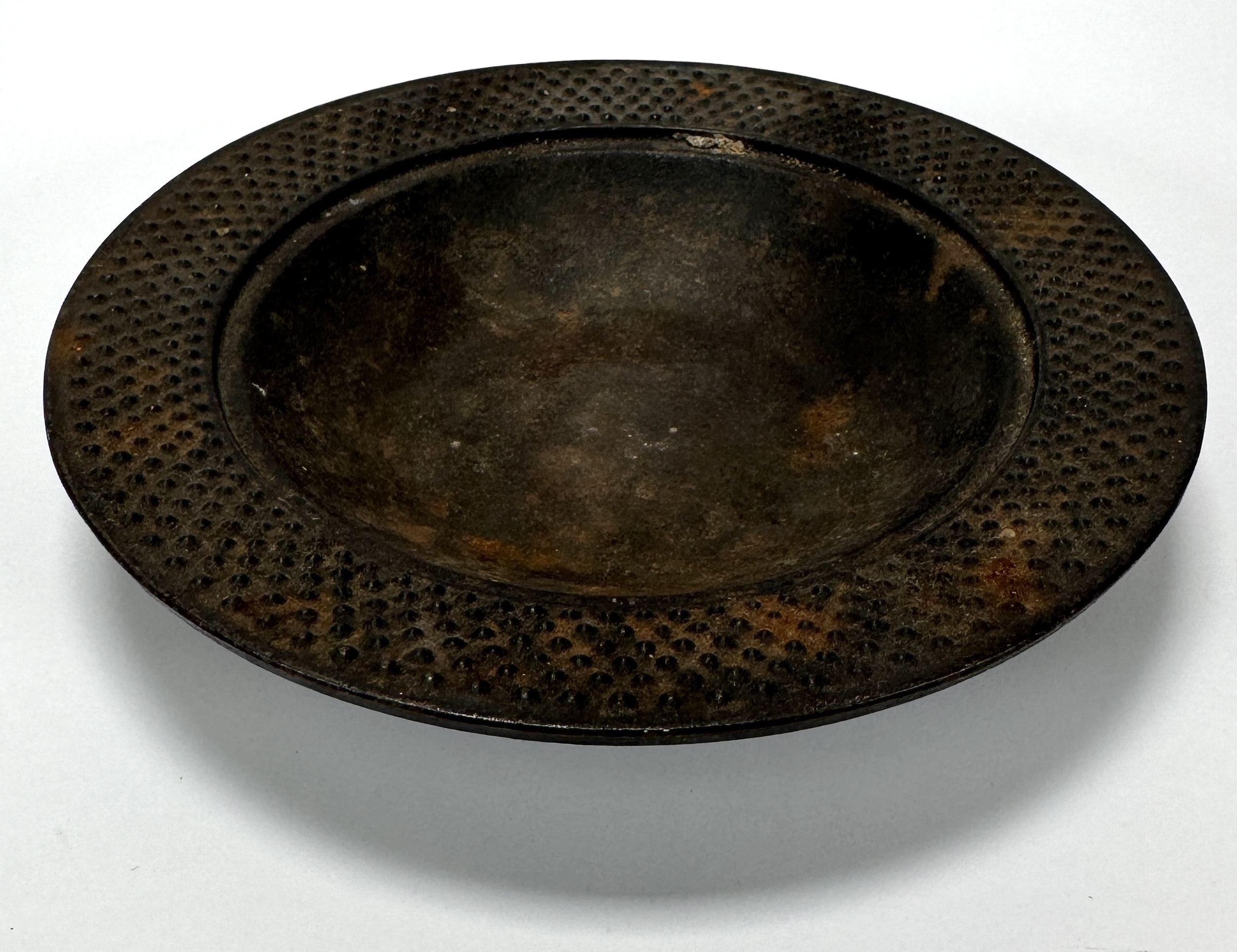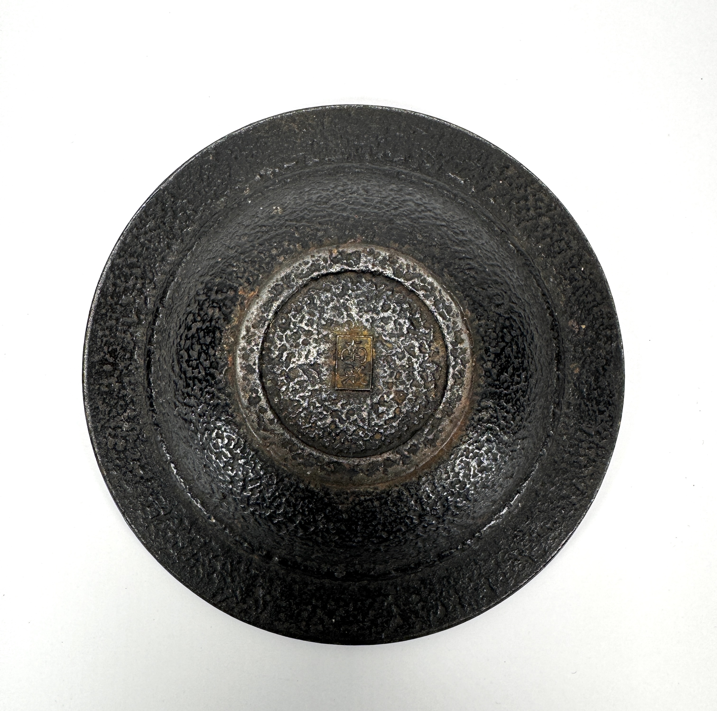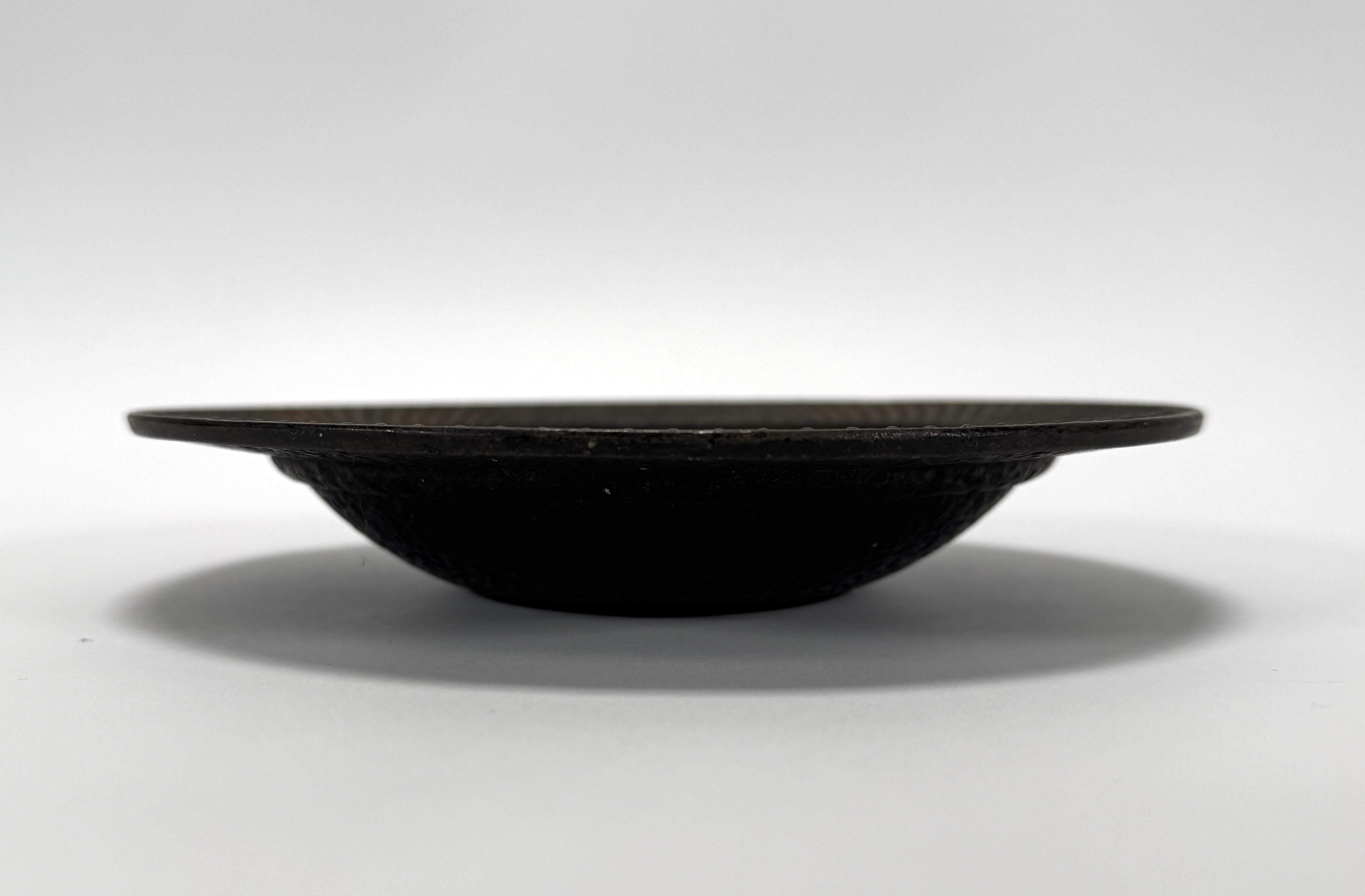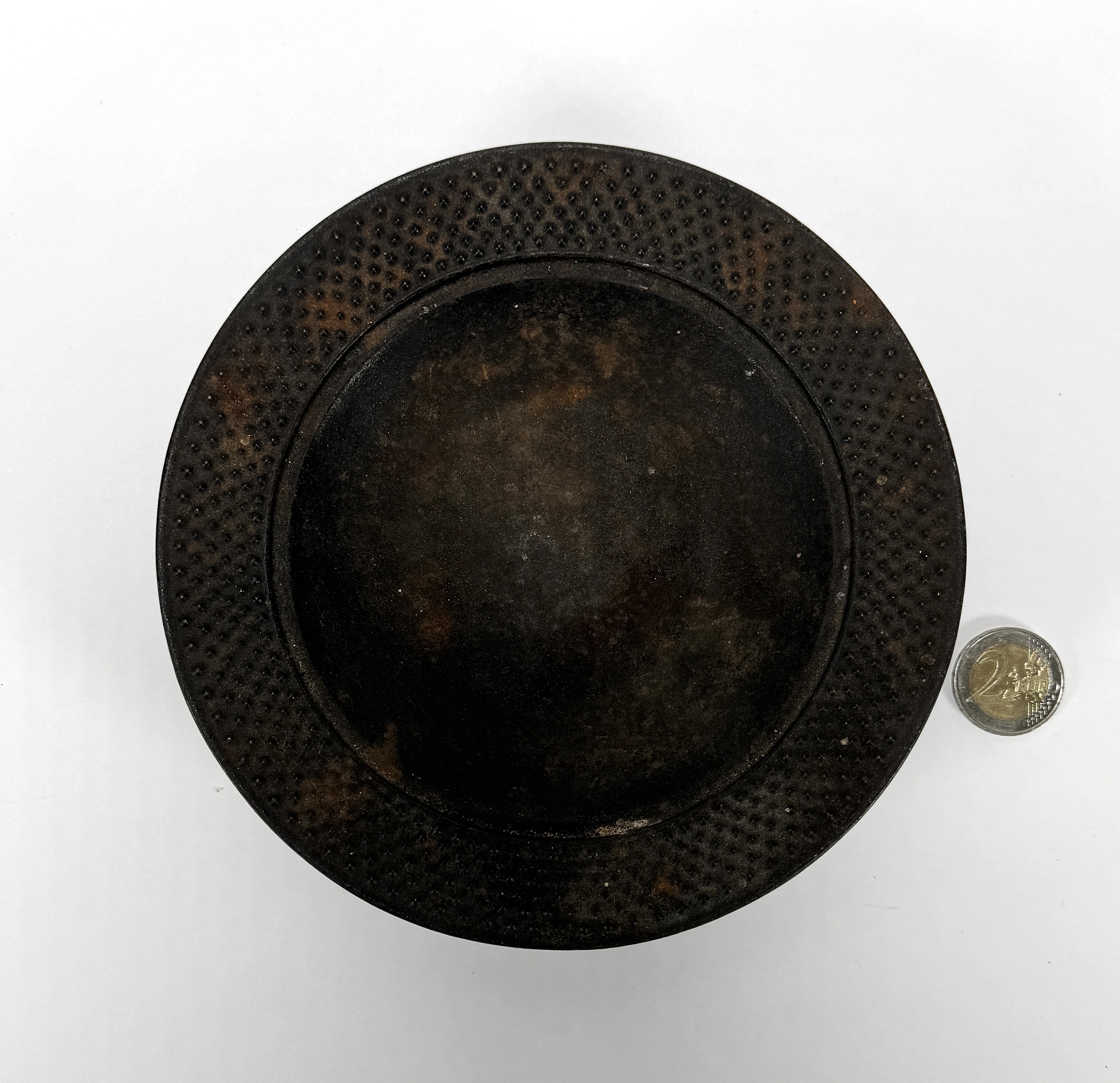 Japanse gietijzeren schaal vervaardigd in de traditie van Nambu Tekki in de regio Iwate Prefecture, uitgevoerd in gietijzer met gepunte reliëfstructuur en brede opstaande rand, vermoedelijk midden 20e eeuw. Onderop bevindt zich een rechthoekig merkteken met de kanji 南部 (Nambu). De schaal zelf beoordelen? Je bent welkom op onze kijkdagen op 28, 29 en 30 november! |