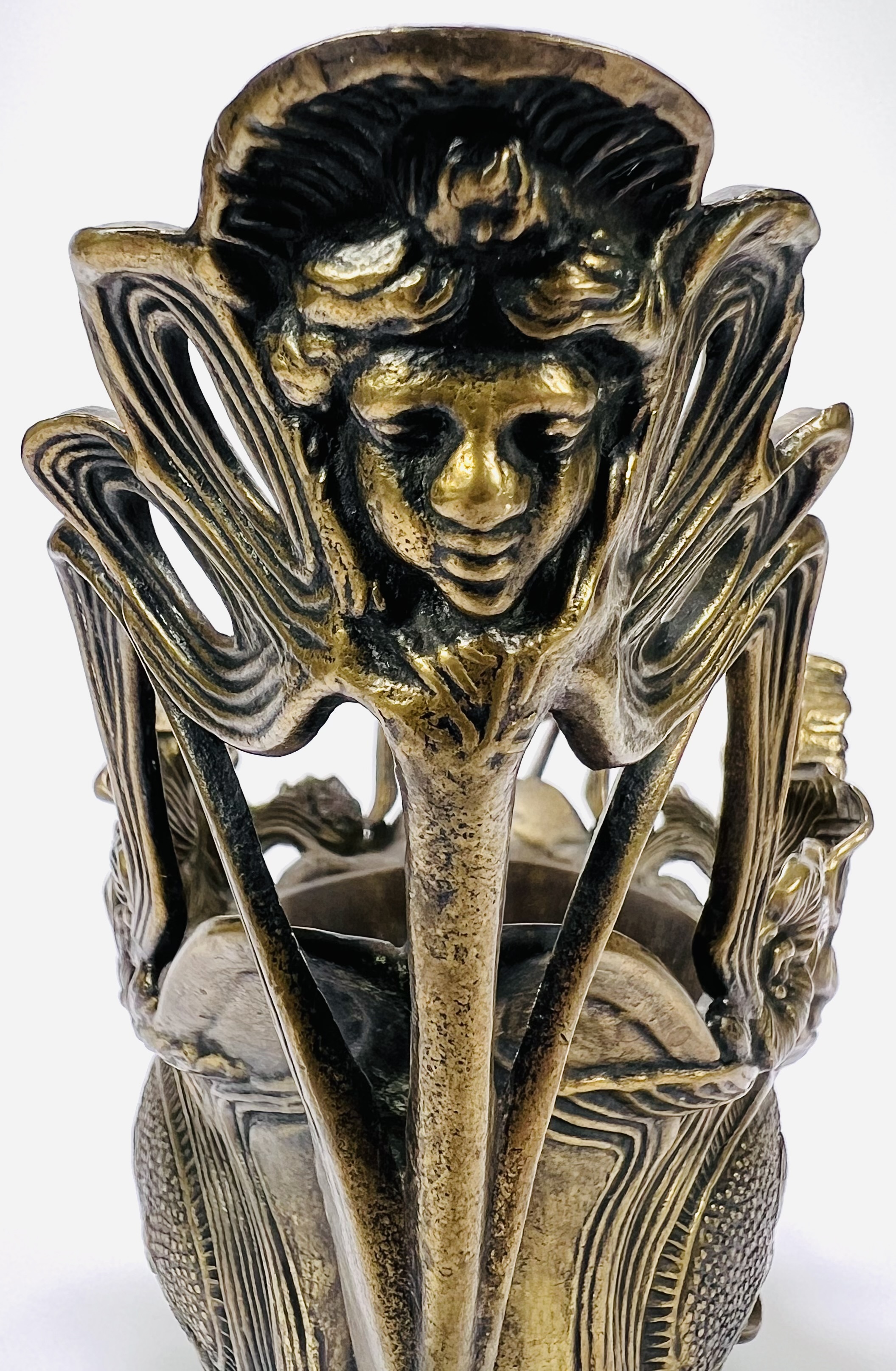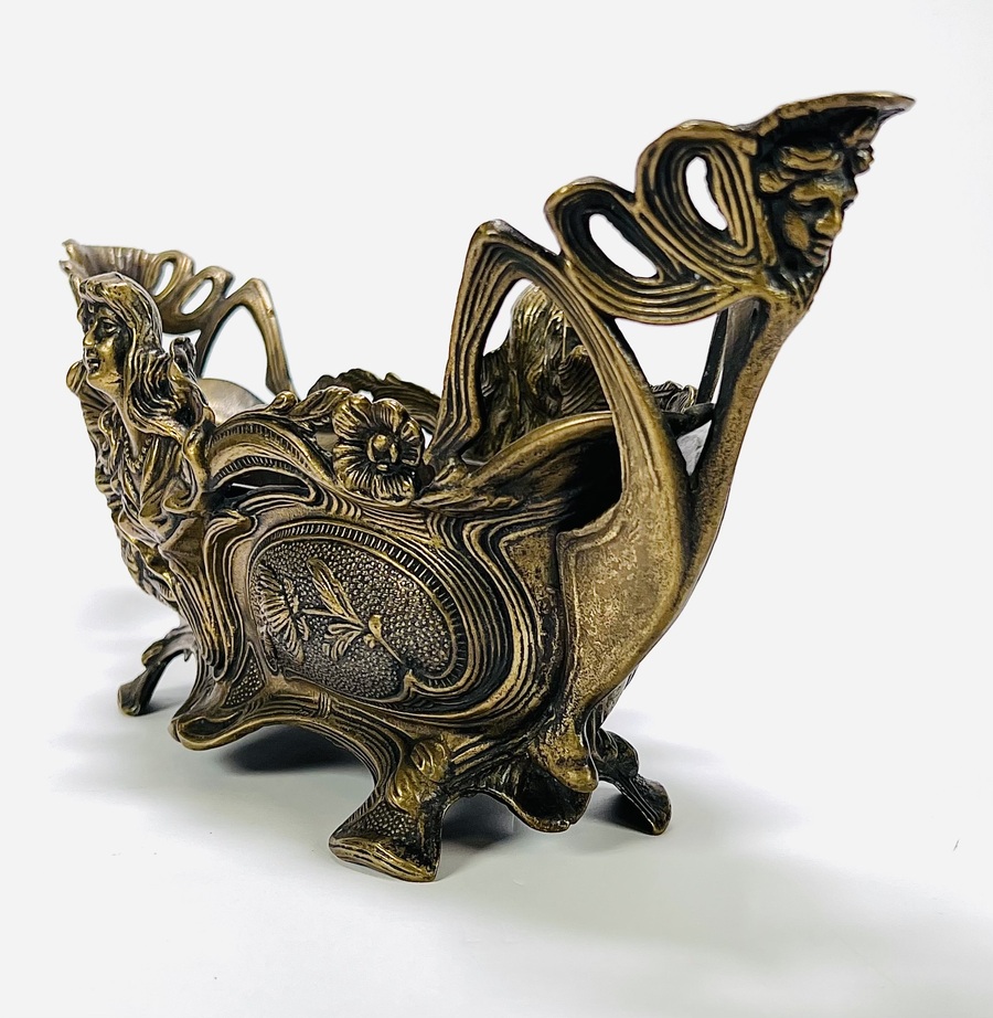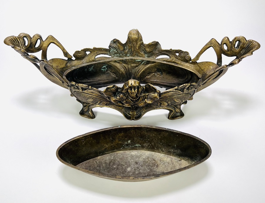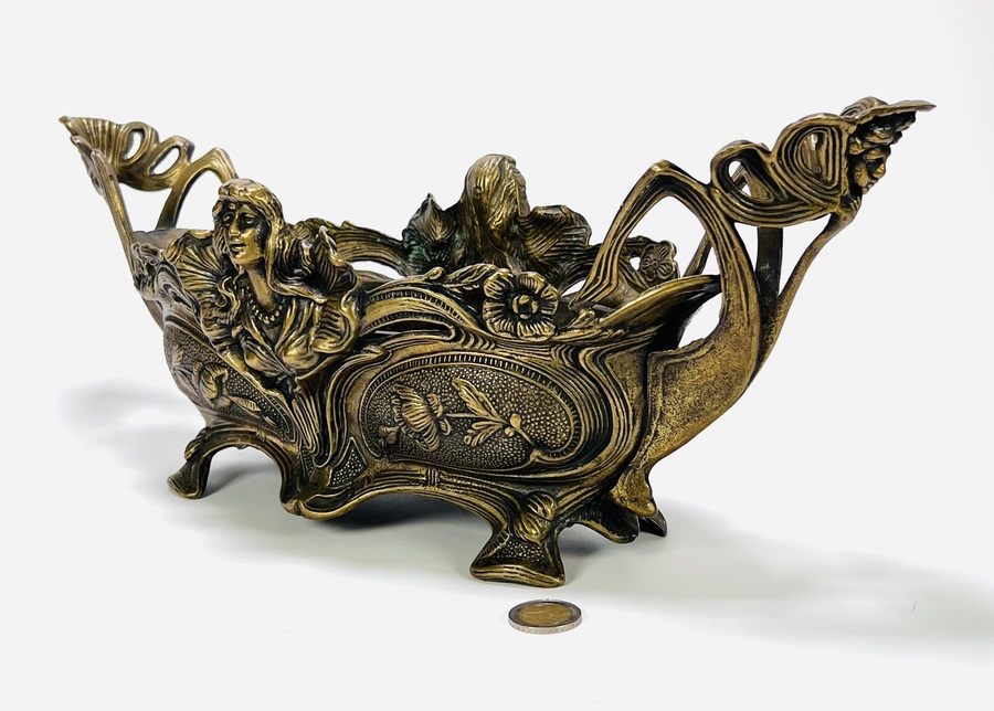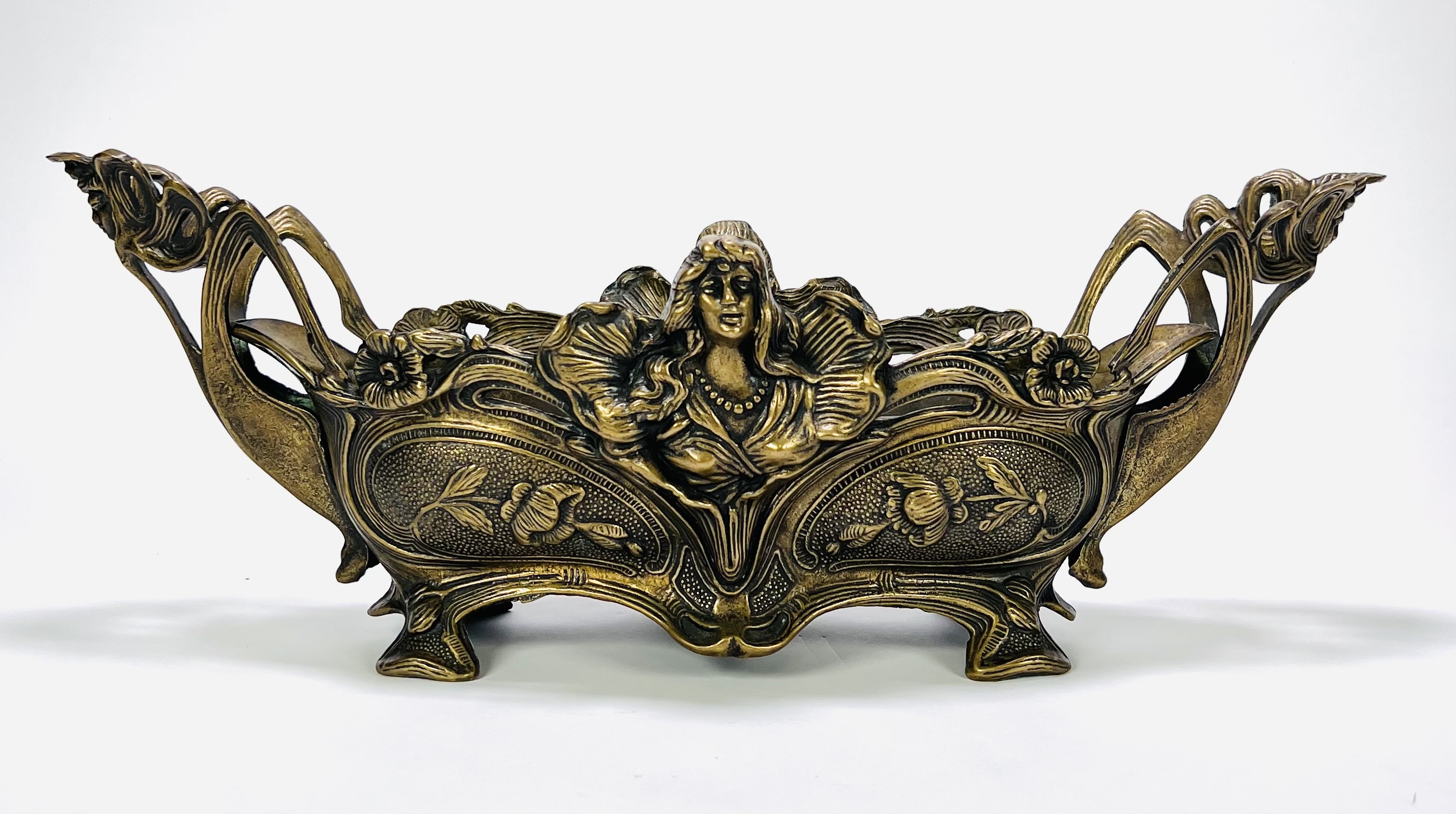 Art Nouveau jardinière vervaardigd uit gegoten messing met een antieke patina, dateert uit de periode ca. 1895–1910. De schaal is rijk gedecoreerd met vrouwelijke gezichten, gestileerde rozen en vloeiende lijnen. De jardinière heeft een ovale vorm en bevat een uitneembare binnenbak. Voeg deze schaal toe aan je verzameling en doe een bod! |