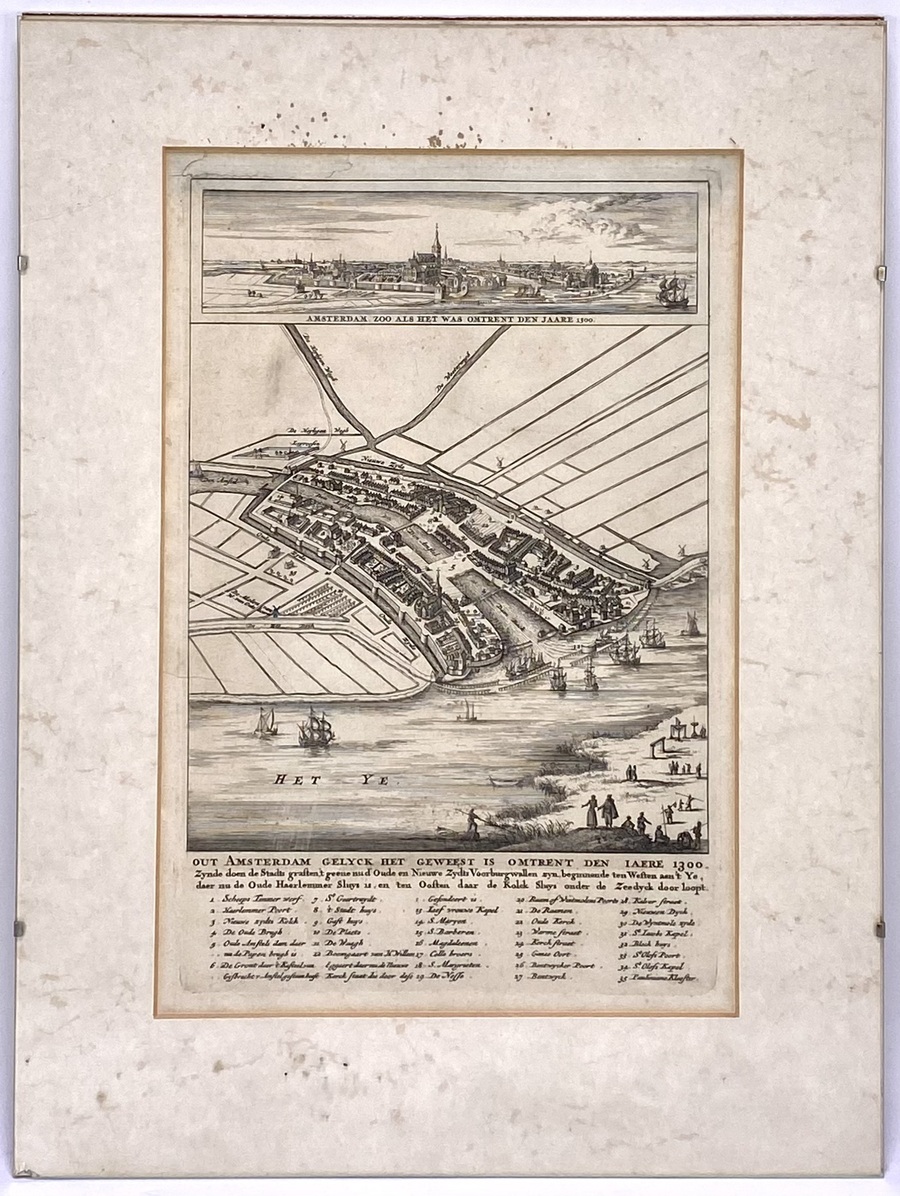 Gravure op papier met de voorstelling “Out Amsterdam gelyck het geweeſt is omtrent den jaere 1300”, naar de 17e-eeuwse uitgave van Claes Jansz. Visscher (1587–1652), tussen 1663 en 1664. De prent toont een vogelvluchtplattegrond en panorama van Amsterdam met legenda van 36 locaties. Ingelijst onder passe-partout met ouderdomsvlekken. Niet geïnspecteerd buiten de lijst. Wil je deze prent in het echt bekijken? Kom naar de kijkdagen op 28, 29 en 30 november! |