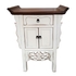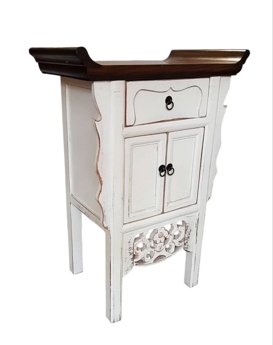 Chinees kastje in traditionele stijl, vervaardigd uit wit geschilderd hout, daterend uit de laat 20e eeuw. Het kastje heeft een donker bovenblad in altaartafelvorm, een lade en twee deuren. De witte verflaag is opzettelijk verouderd en de voorzijde is gedecoreerd met opengewerkt houtsnijwerk. Eerst dit kastje zien voordat je biedt? Bezoek onze kijkdagen op 28, 29 en 30 november van 11:00 tot 17:00 uur! |