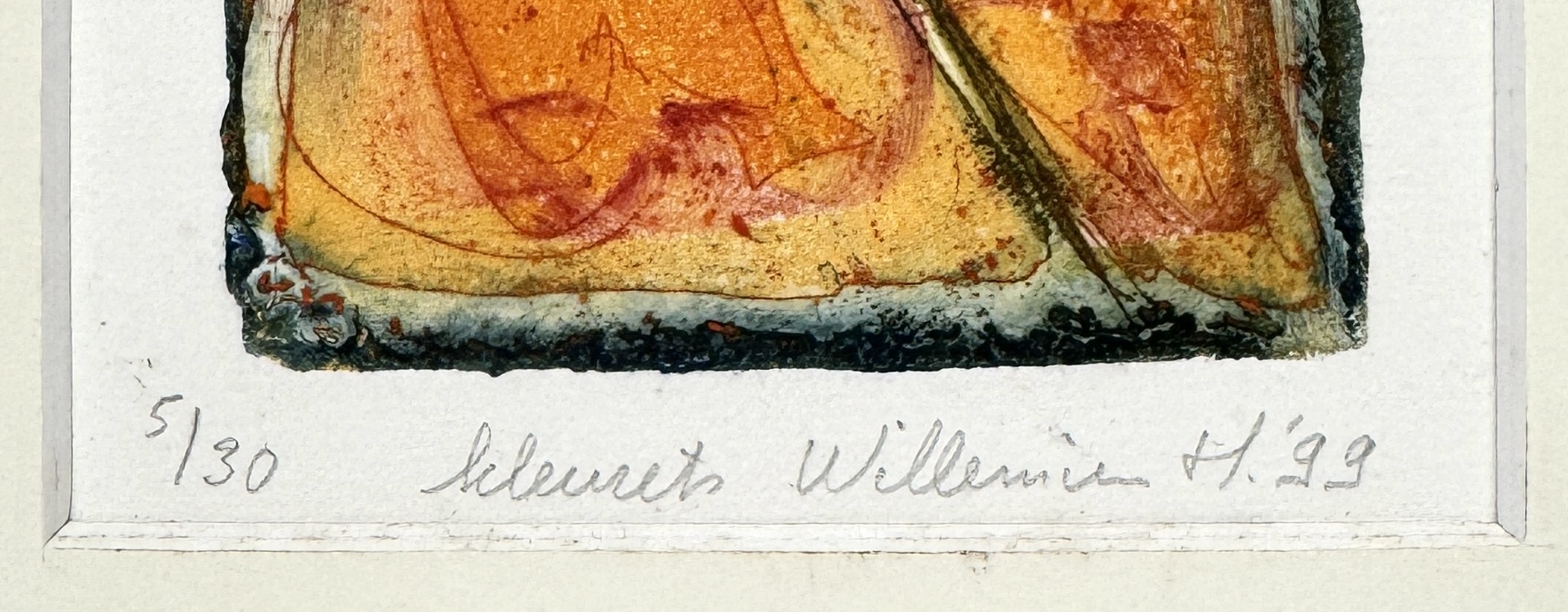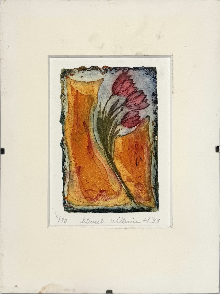 Ets van de Nederlandse graficus Willemien Holterman (1947), uitgevoerd op papier in een abstract-figuratieve stijl. Het werk uit 1999 is met de hand gesigneerd, oplagenummer 5/30 en toont een verticale compositie van drie oudroze tulpen tegen een textuurrijke oranje achtergrond. Jouw kans op deze ets begint met registreren – bied live of online mee! |