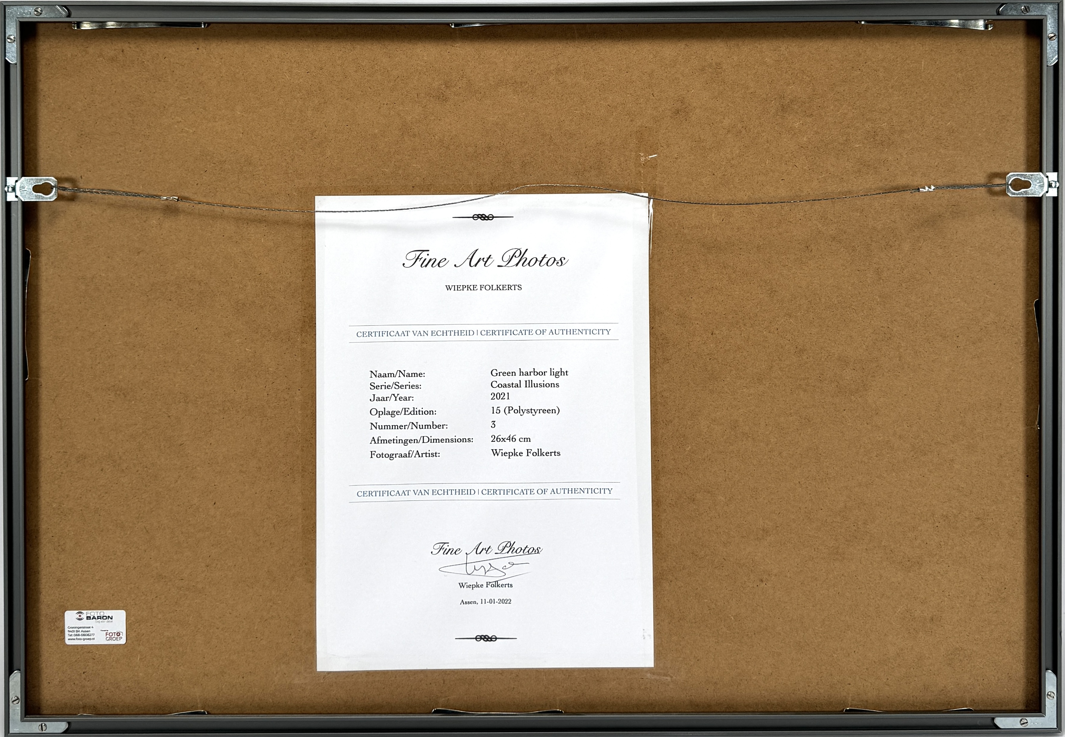 Gelimiteerde foto op polystyreen van de Nederlandse fotograaf Wiepke Folkerts, titel "Green harbor light". De kleurenfoto uit 2021 is genummerd 3/15 en voorzien van een Certificaat van Authenticiteit. Het werk uit de serie 'Coastal Illusions' toont een groen havenlicht, afgebeeld in minimalistische stijl tegen een serene, mistige achtergrond. De foto zelf beoordelen? Je bent welkom op onze kijkdagen op 28, 29 en 30 november! |