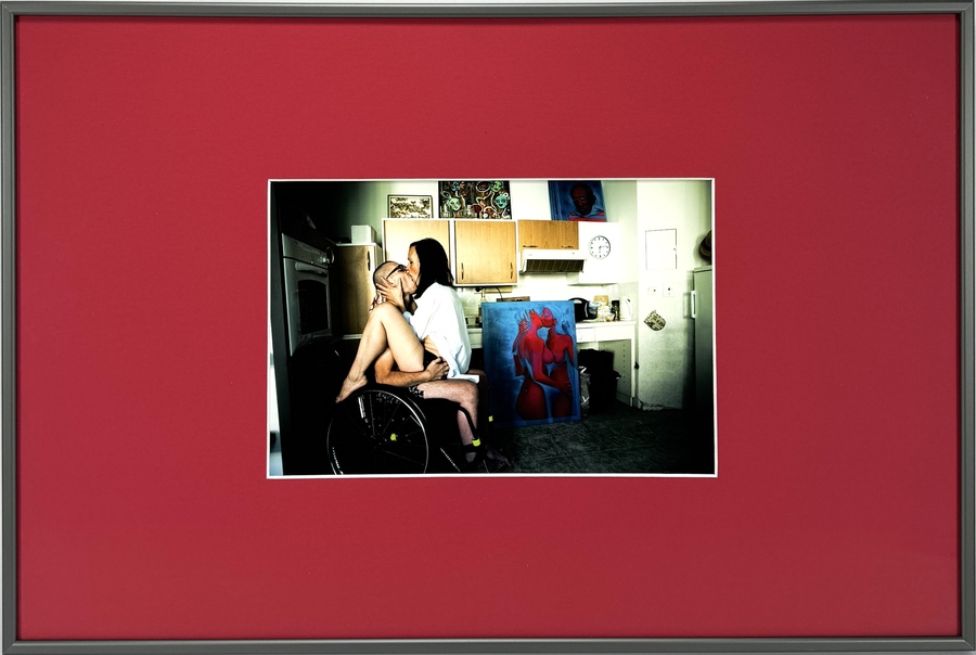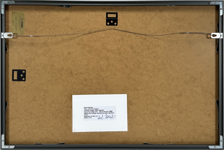 Kleurenfoto getiteld "Love is my religion", gemaakt door de Tsjechische fotograaf David Tesinsky (1990) in 2017. Deze digitale print uit 2021 op papier is een gelimiteerde oplage van 15 exemplaren, dit is nummer 4, en toont een intieme kusscène in een alledaagse keuken. Het werk uit Praag is ingelijst met een rood passe-partout. Registreer nu en bied eenvoudig online mee op deze foto! |