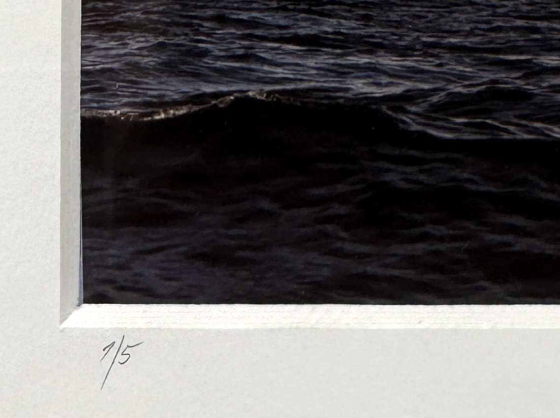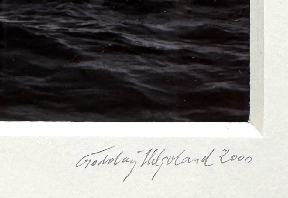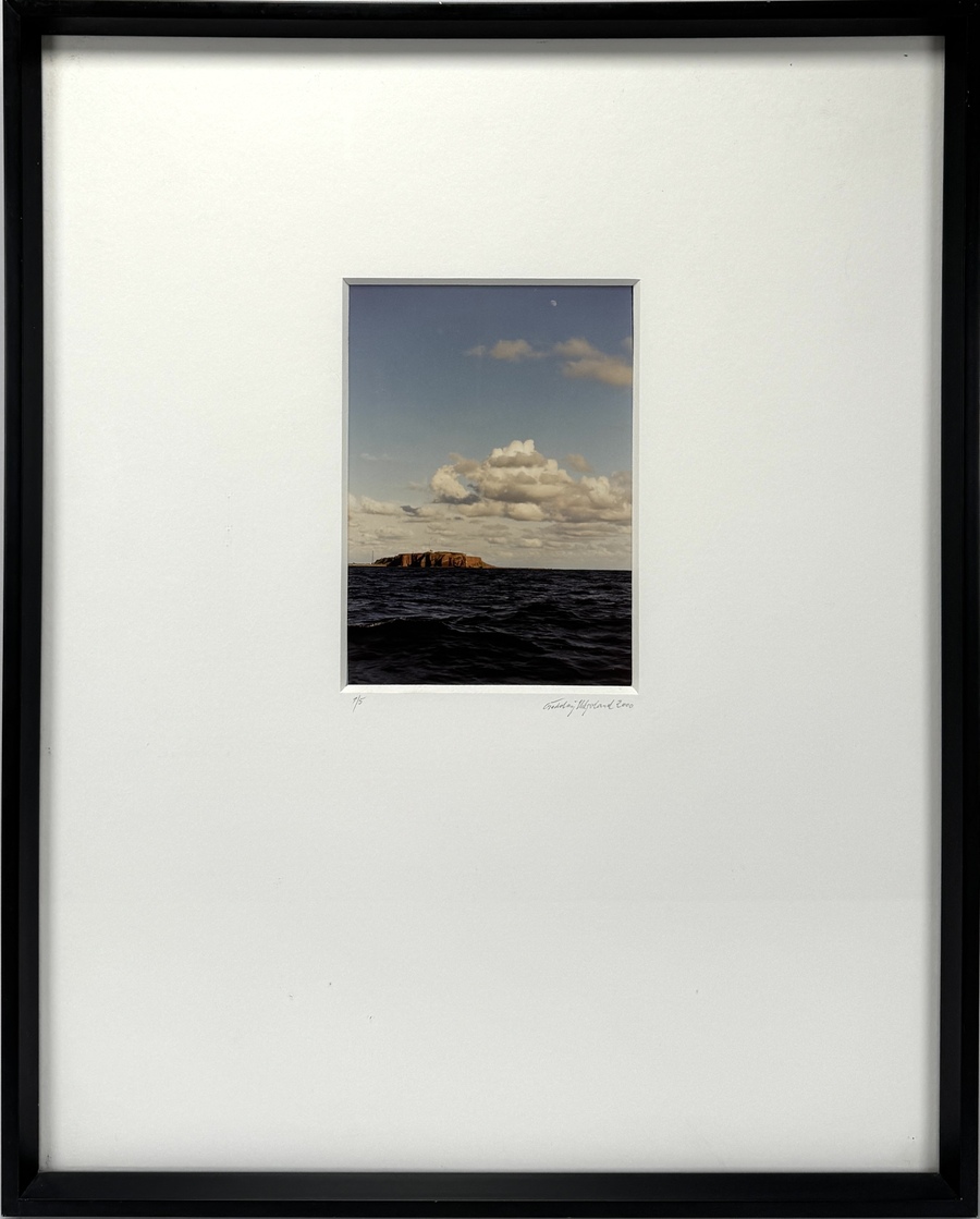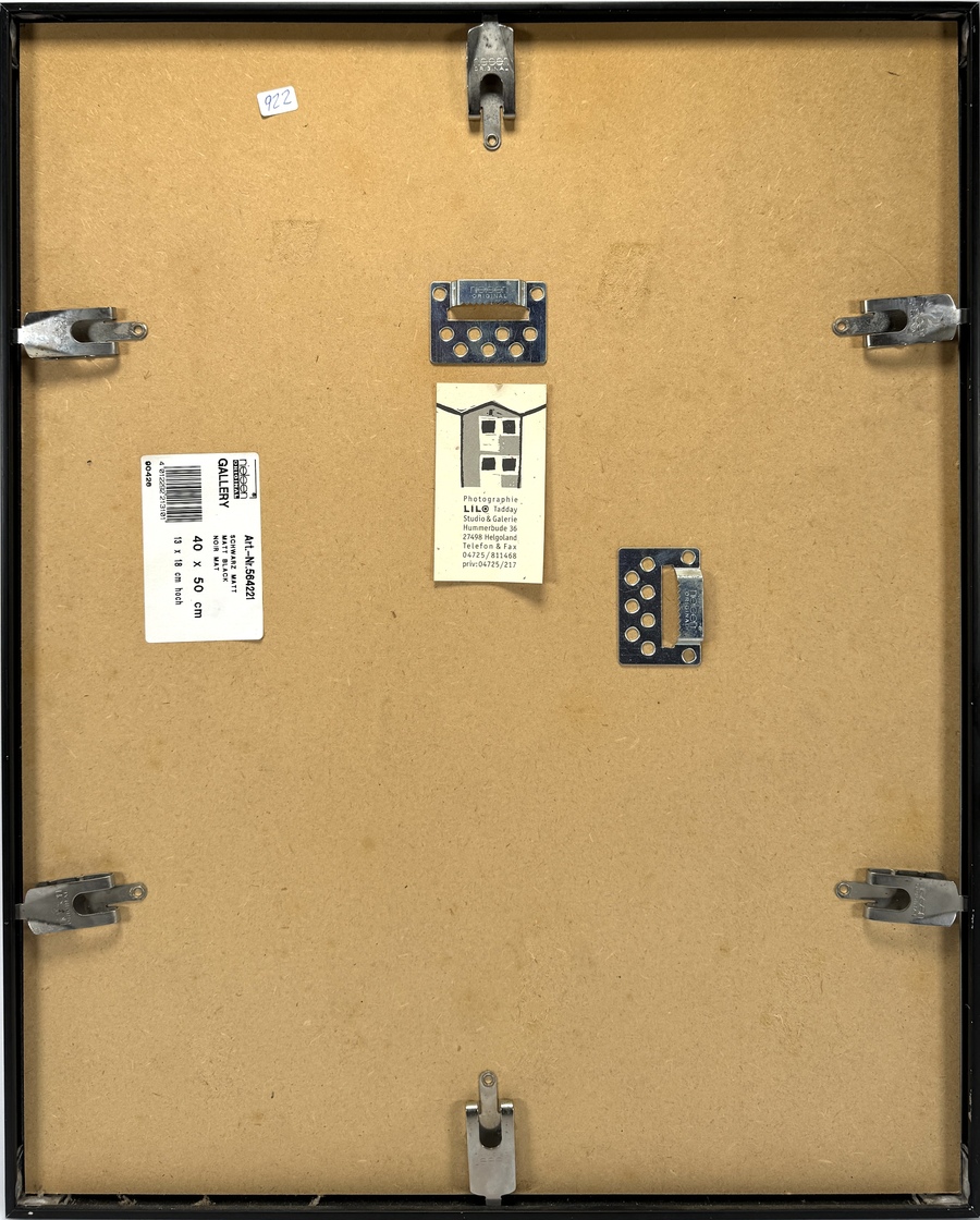 Analoge landschapsfoto met chemische afdruktechniek op fotopapier, gemonteerd in een passe-partout en ingelijst in een zwarte houten lijst. Het werk, gedateerd 2000, toont het rotsachtige eiland Helgoland in de Noordzee met een donkere zee op de voorgrond en stapelwolken in de lucht. De fotoprint is met potlood gesigneerd, oplagenummer 1/5. Wil je direct deelnemen? Plaats vanaf 21 november alvast een schriftelijk bod via onze website! |